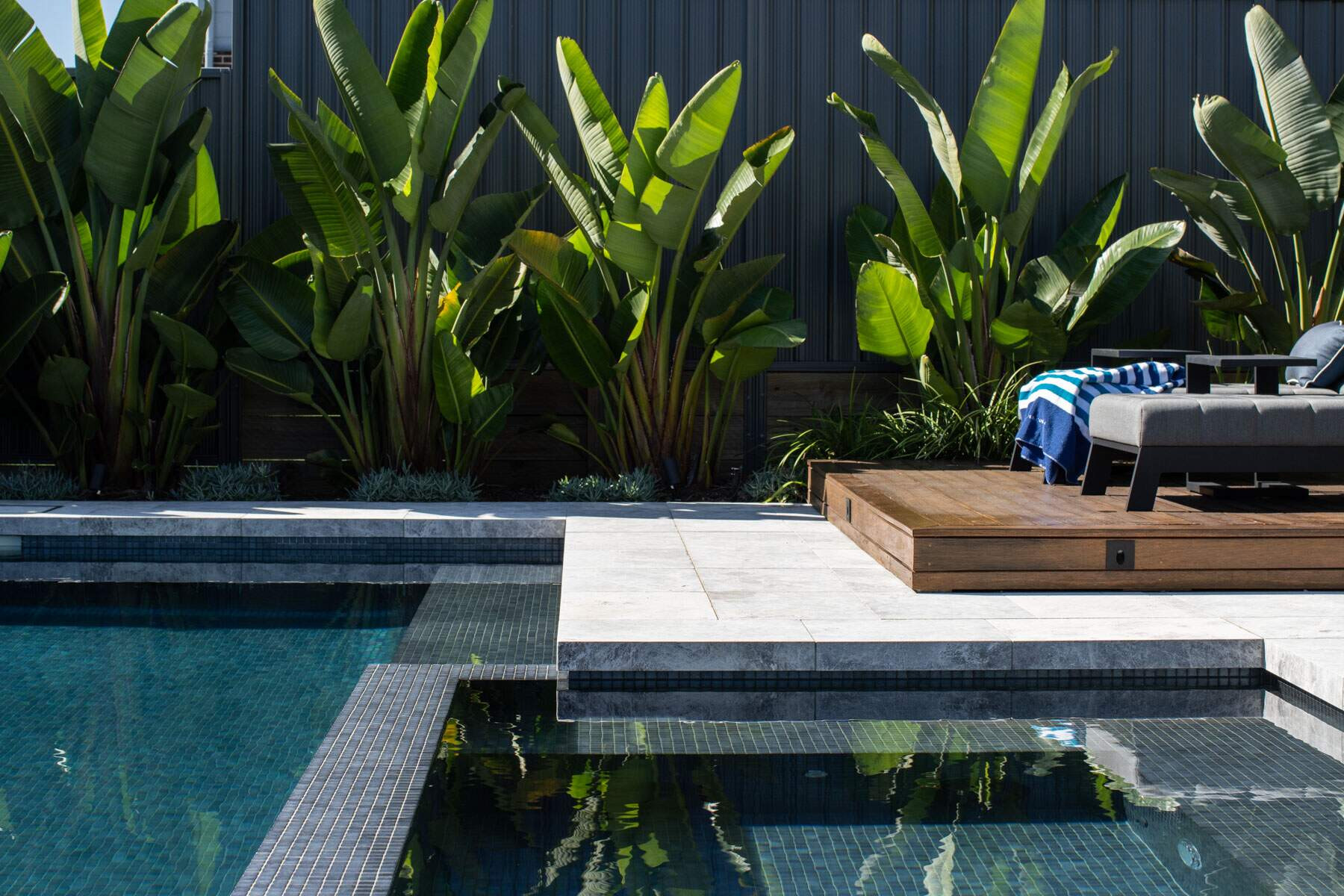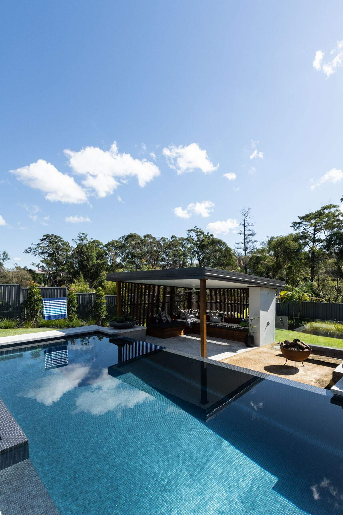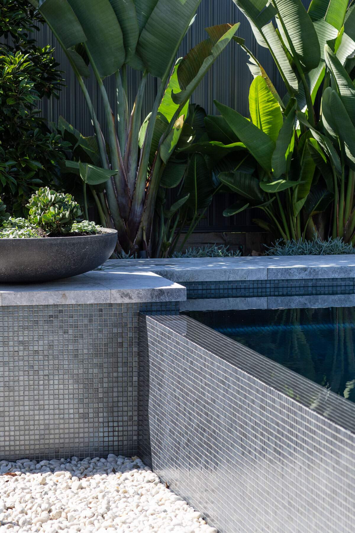 In the centre of this sloping landscaped garden is a tropical oasis pool, hidden among its vast natural reserve surroundings. Fully tiled with a matt finish mosaic with a light sheen, this pool features a generous spa, shallow area, and wet edge that spills over between raised plinths containing decorative succulent bowls. Also featured are an outdoor shower and entertaining area, with relaxed and comfortable day beds, dappled with sunlight by gentle timber screening.