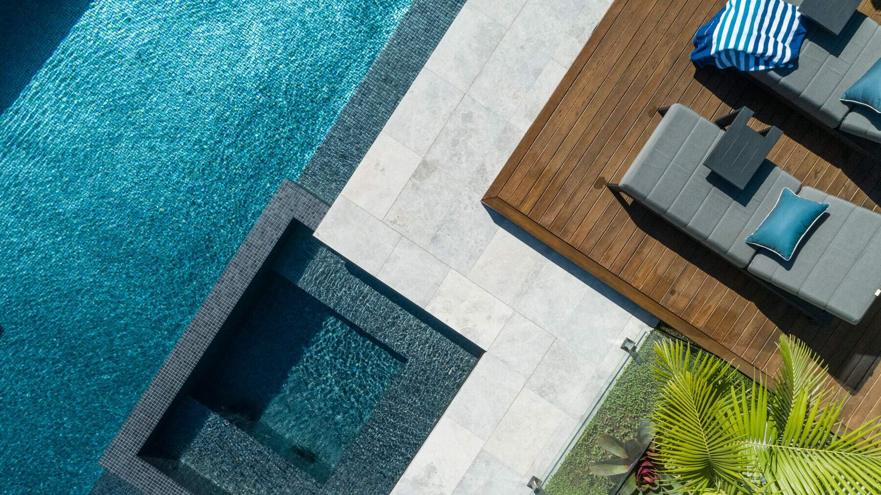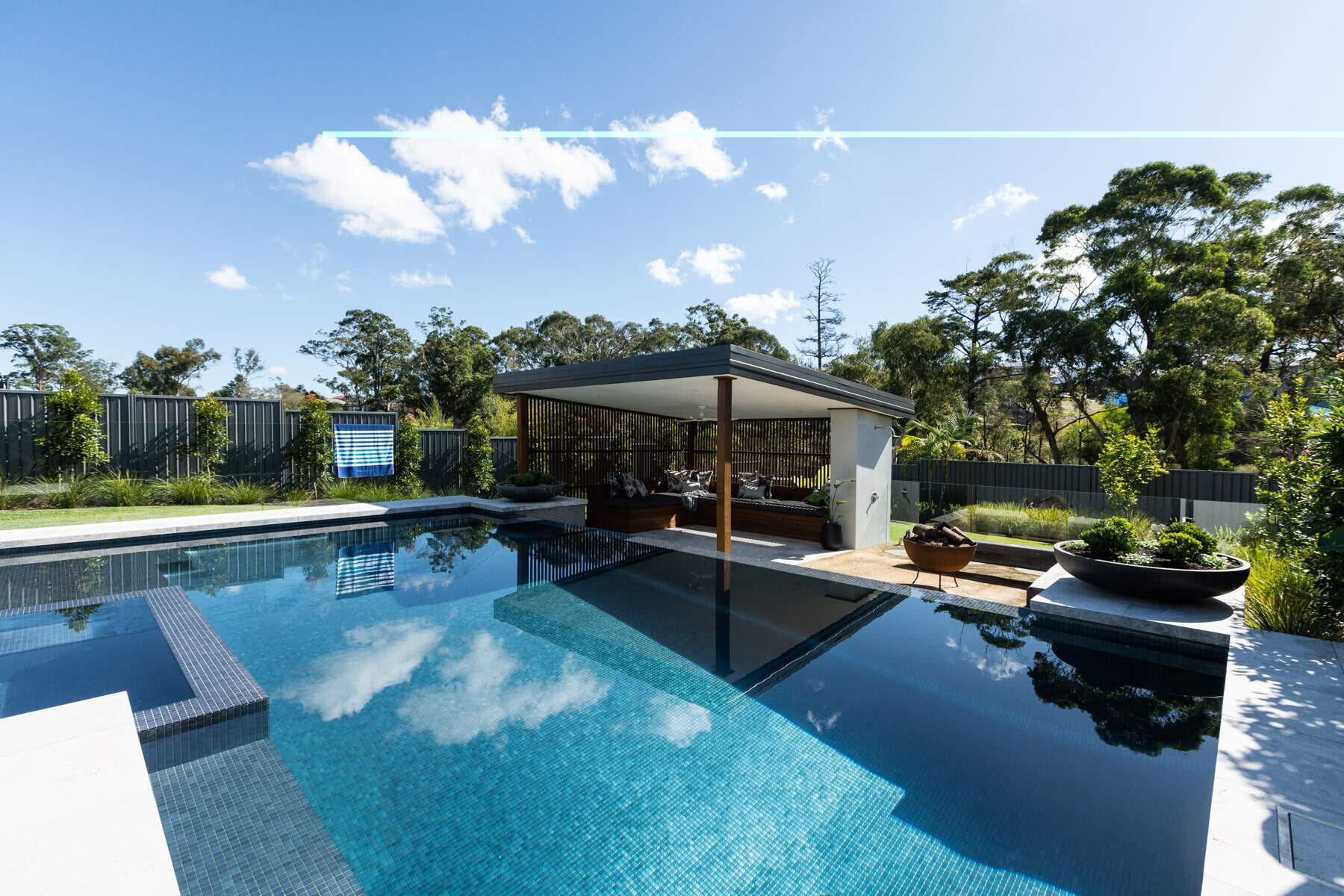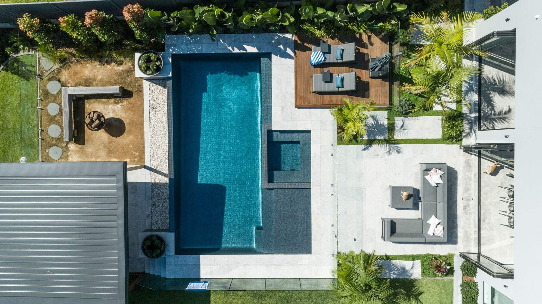 In the centre of this sloping landscaped garden is a tropical oasis pool, hidden among its vast natural reserve surroundings. Fully tiled with a matt finish mosaic with a light sheen, this pool features a generous spa, shallow area, and wet edge that spills over between raised plinths containing decorative succulent bowls. Also featured are an outdoor shower and entertaining area, with relaxed and comfortable day beds, dappled with sunlight by gentle timber screening.