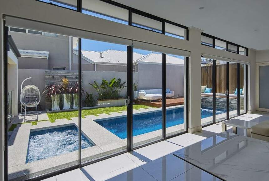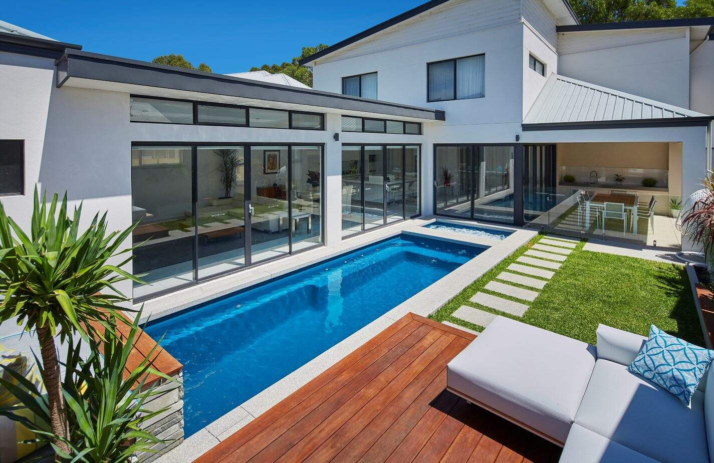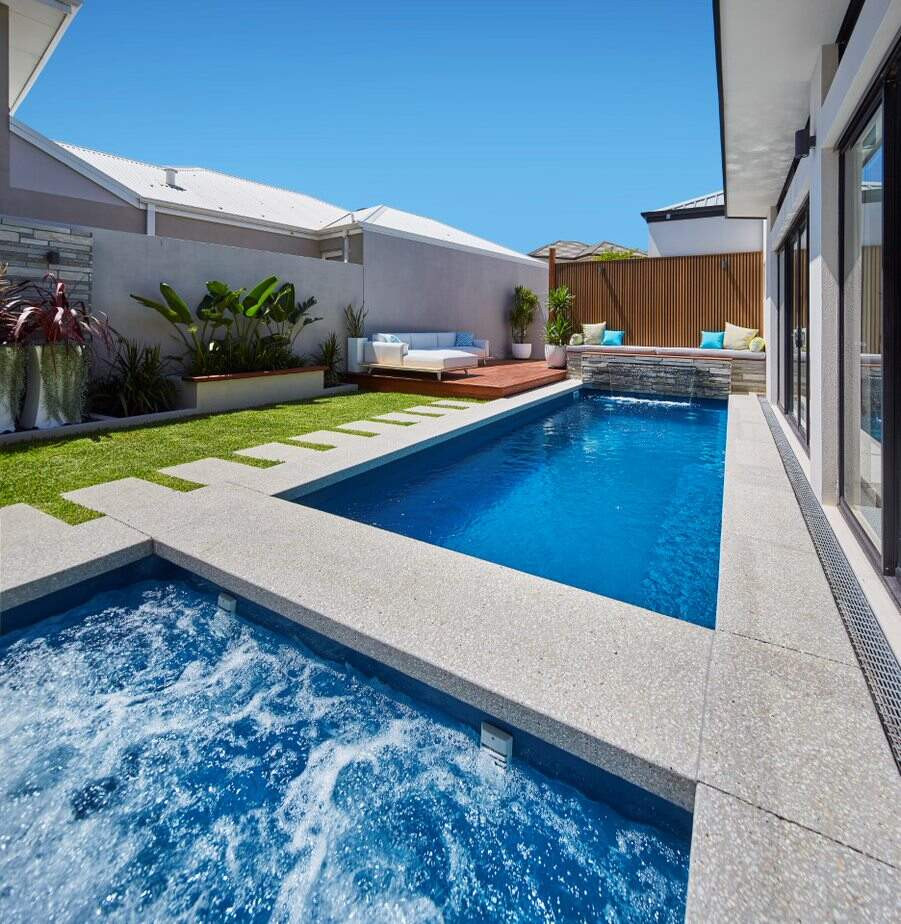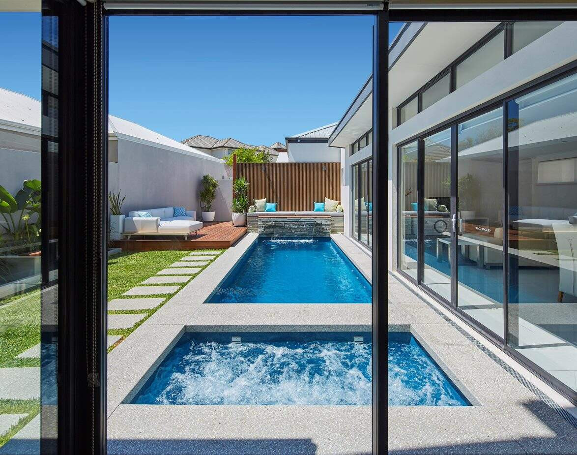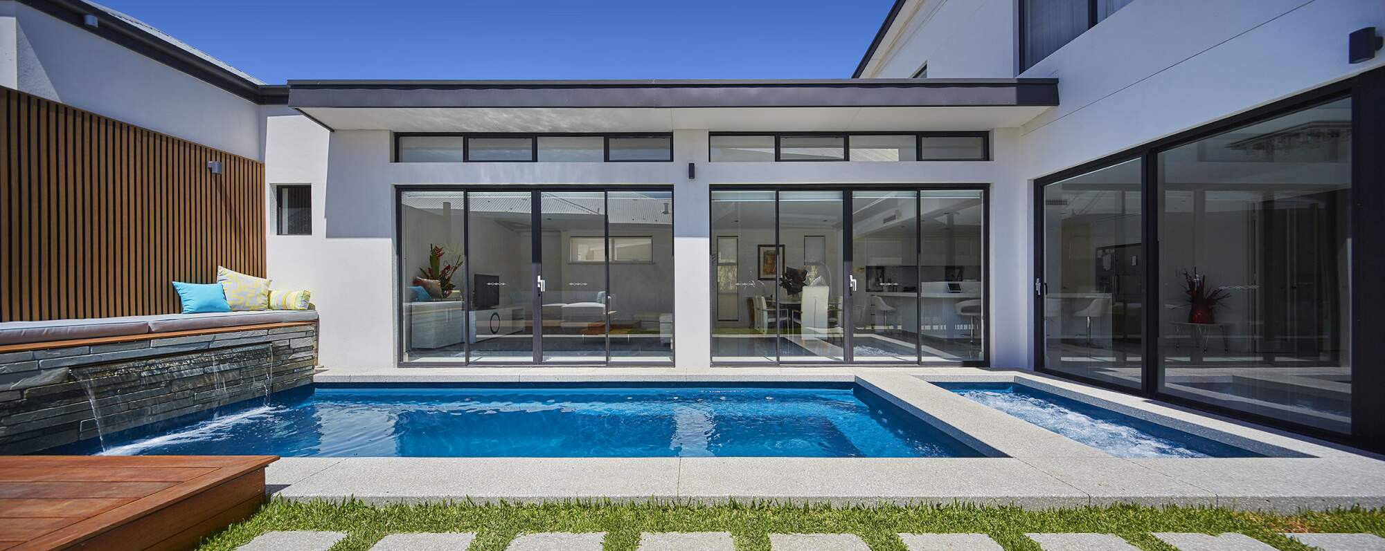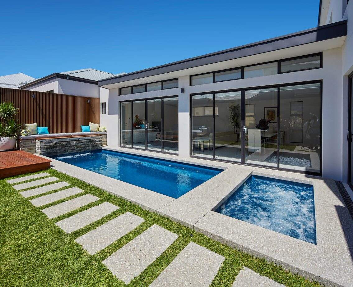 Positioned seamlessly at the edge of this homes glassed doors the sparkling Jade water is showcased throughout the residence. The Monaco Slimline’s design exemplifies modern simplicity and allowed placement close to residence. In addition to this generous size pool for swimming is the Hamilton spa with heating option for relaxation. A cleverly purpose built, rock water feature/storage/seat bench overlooks the spa and pool combination with effortlessly stunning exterior and poolside zones.