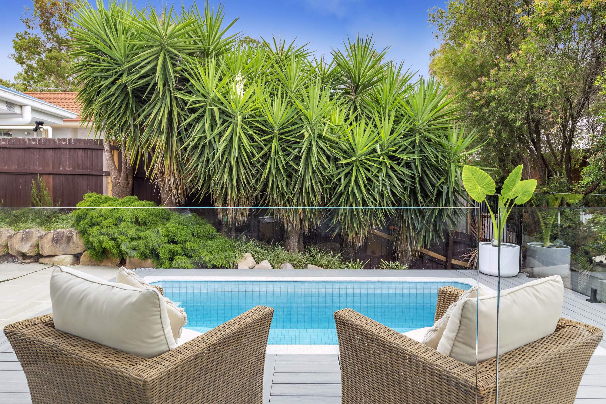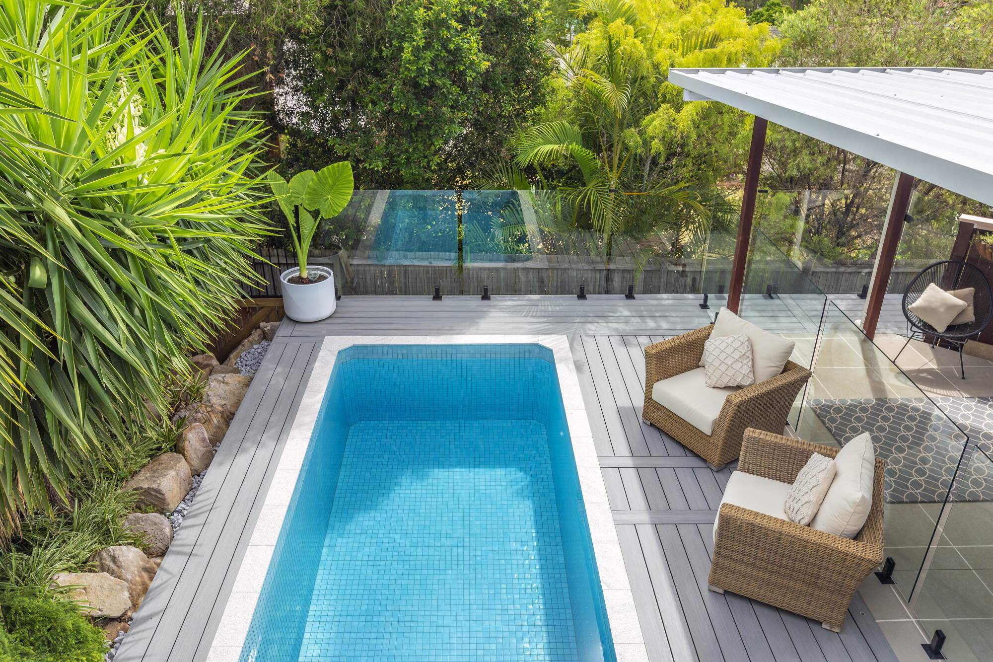 Elegant simplicity at its finest. This beautiful fully tiled pool presents differing tones and moods, light and shade, creating a stunning visual experience. The decking and foliage achieve a perfect balance between hard and soft finishes that effortlessly combine in elegant harmony.
