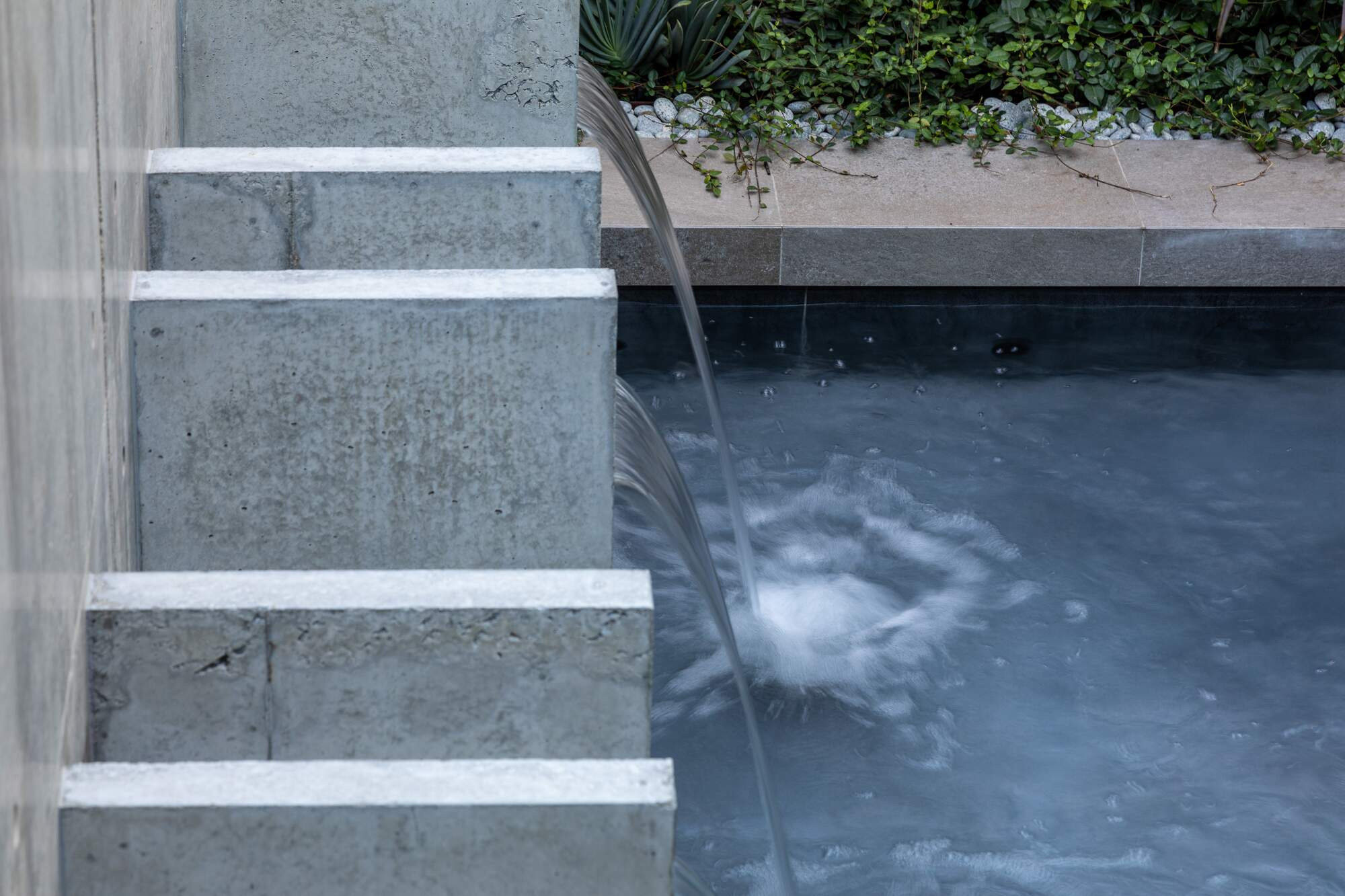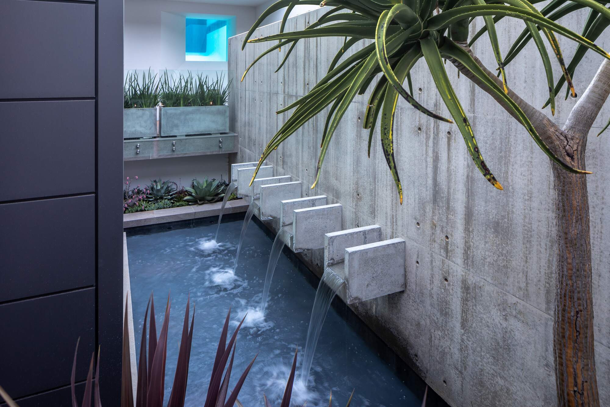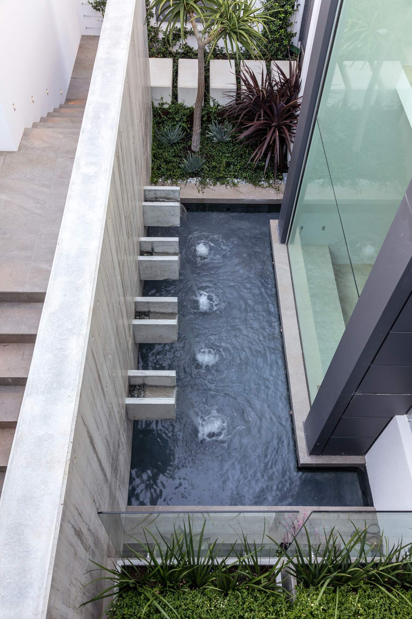 Nestled on a hillside, this home offers a grand entrance with a 3-metre architectural concrete waterwall constructed in-situ. Coupled with four well-appointed scuppers, water flows out of the wall and into a pond below. Pebbles have been laid into each scupper to conceal any visible water outlet as you enter the property from above and descend the entry staircase. Three lights evenly spaced within the pond, catch the falling water and create a shimmer against the waterwall.