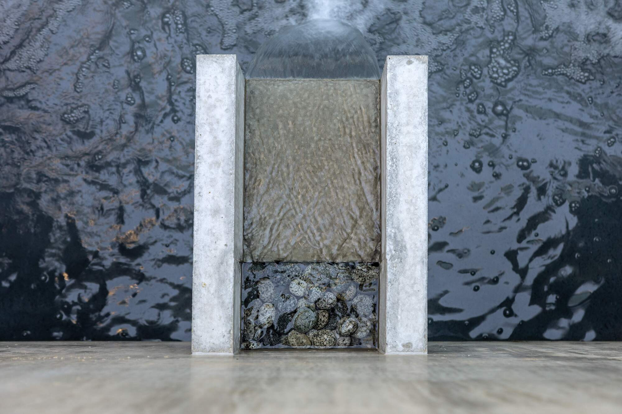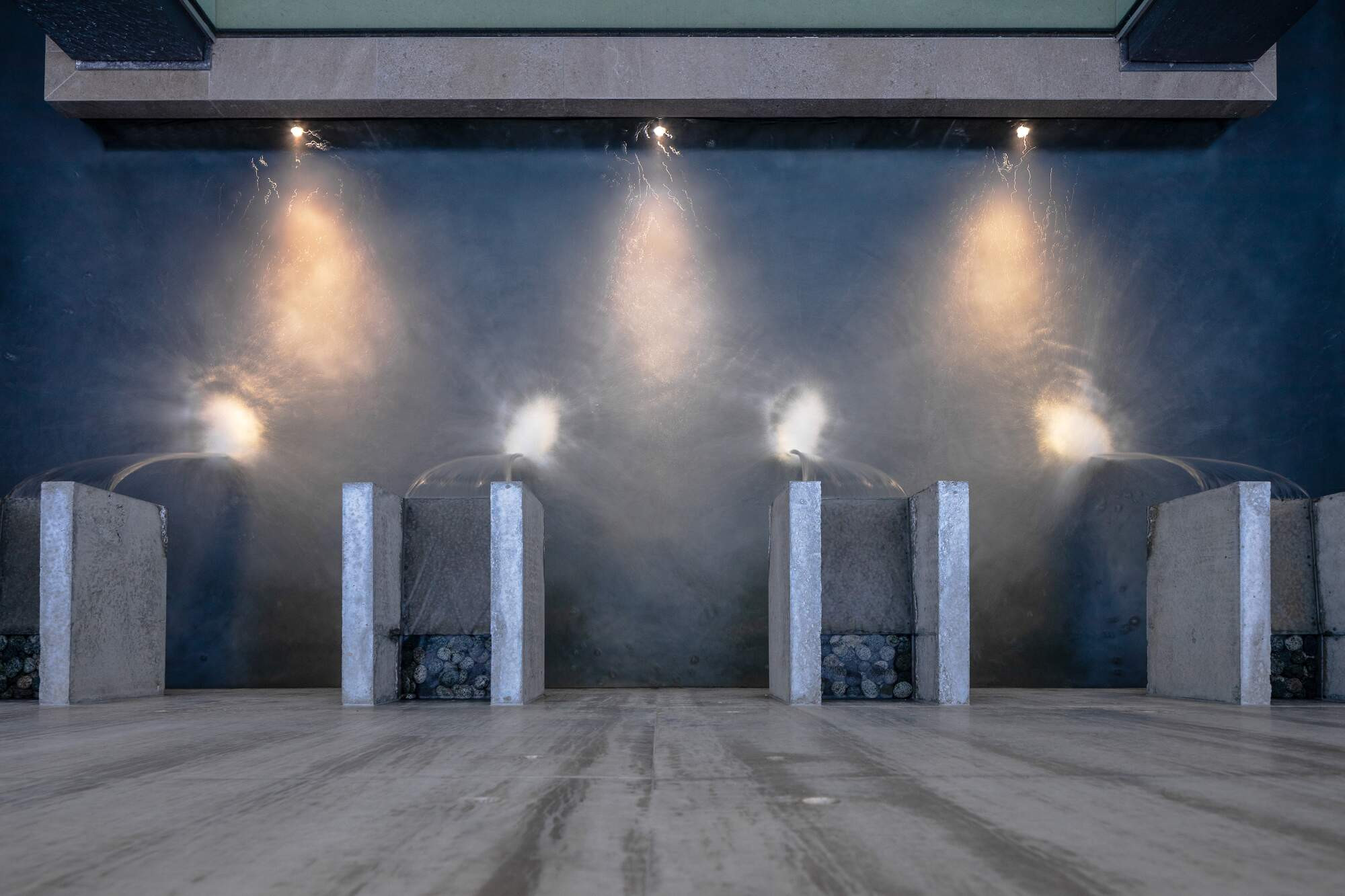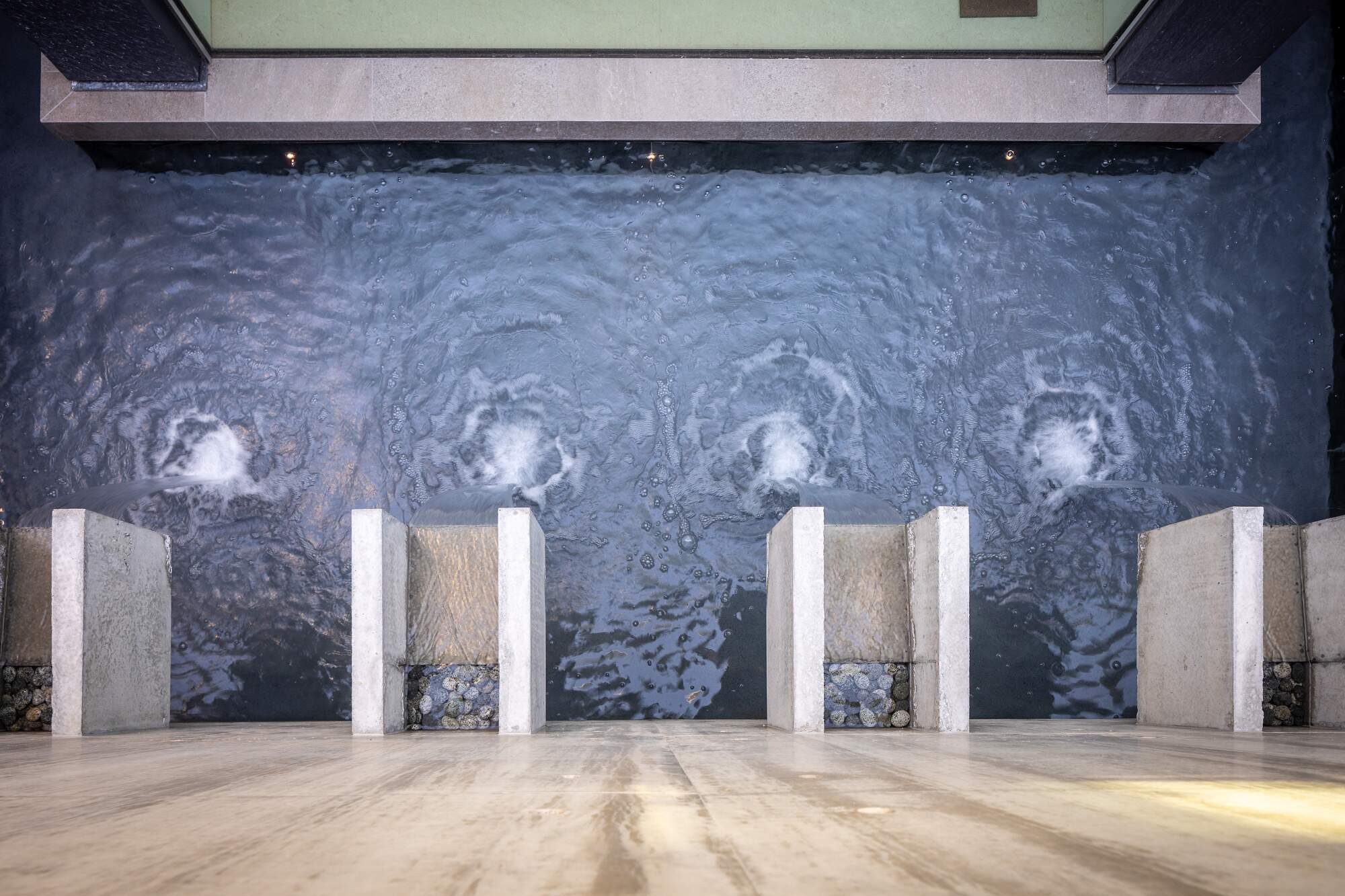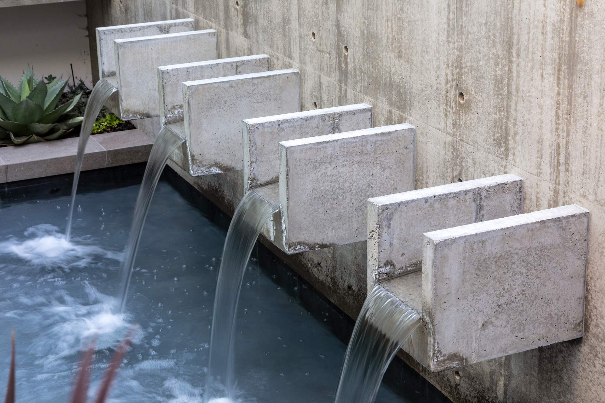 Nestled on a hillside, this home offers a grand entrance with a 3-metre architectural concrete waterwall constructed in-situ. Coupled with four well-appointed scuppers, water flows out of the wall and into a pond below. Pebbles have been laid into each scupper to conceal any visible water outlet as you enter the property from above and descend the entry staircase. Three lights evenly spaced within the pond, catch the falling water and create a shimmer against the waterwall.