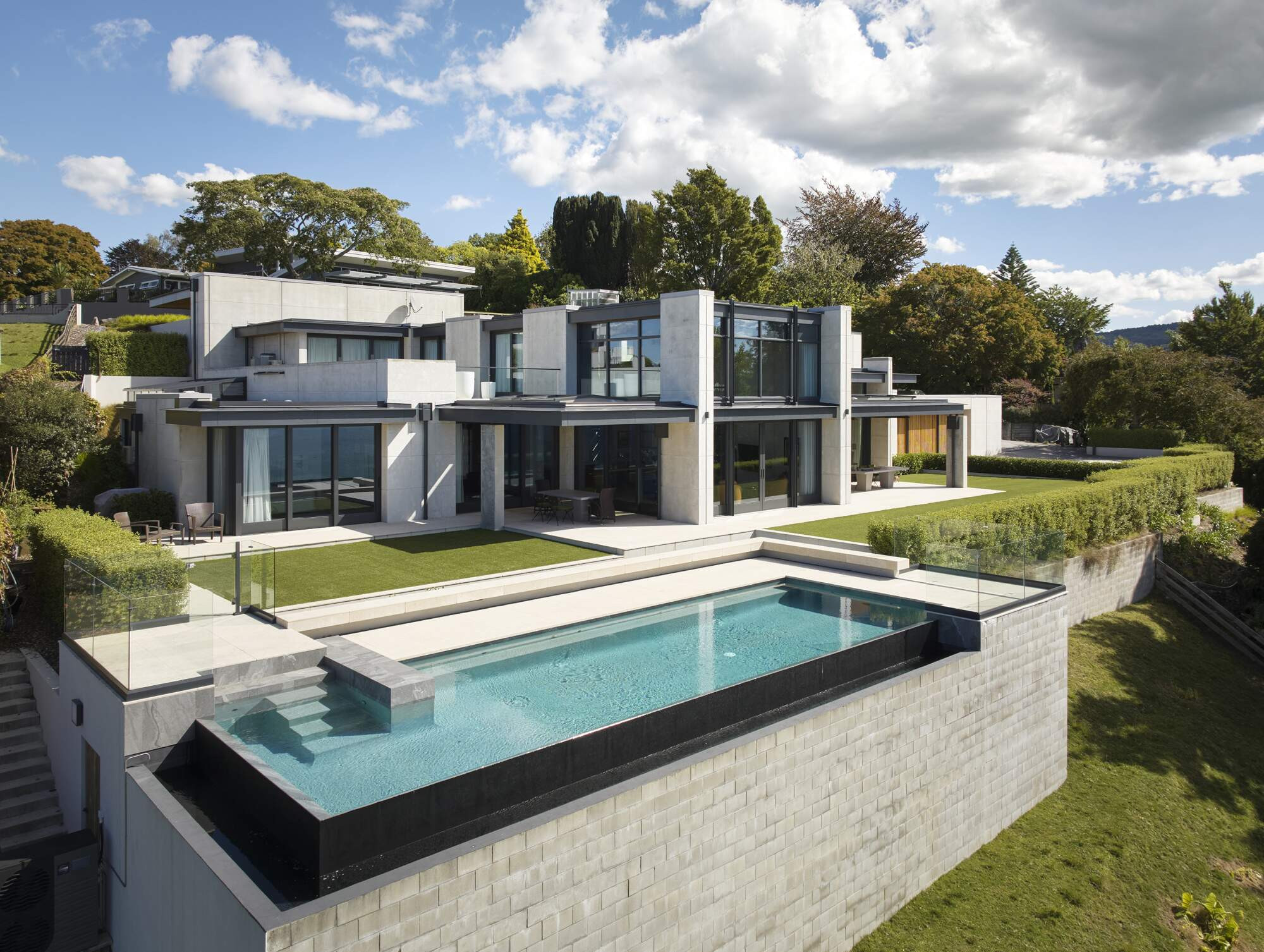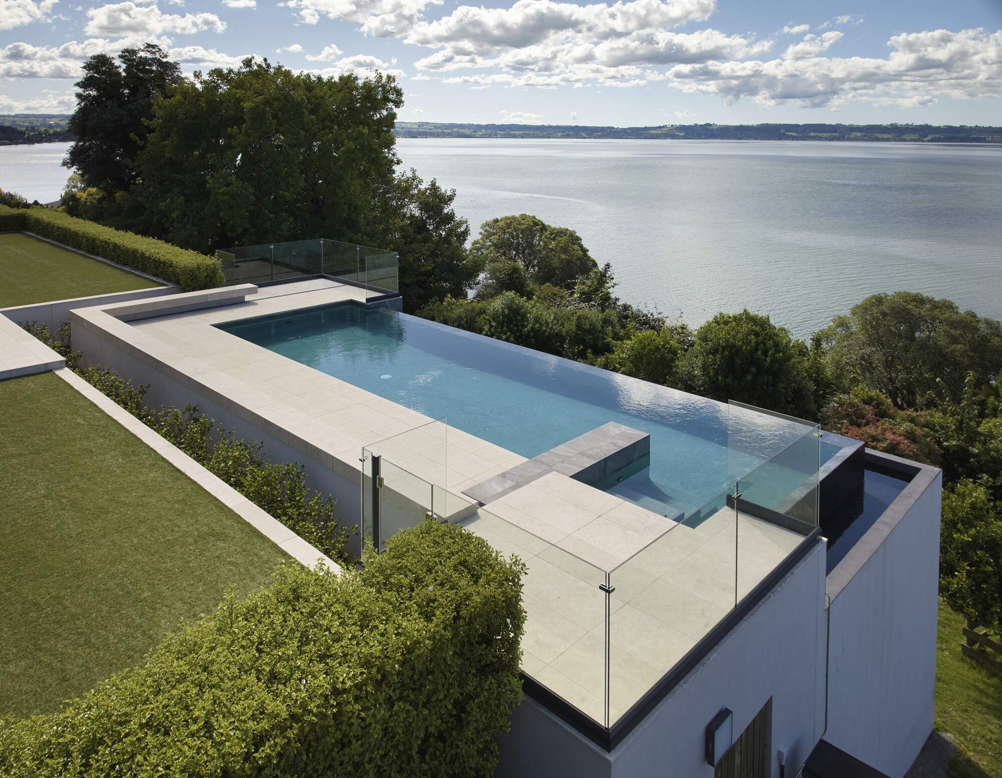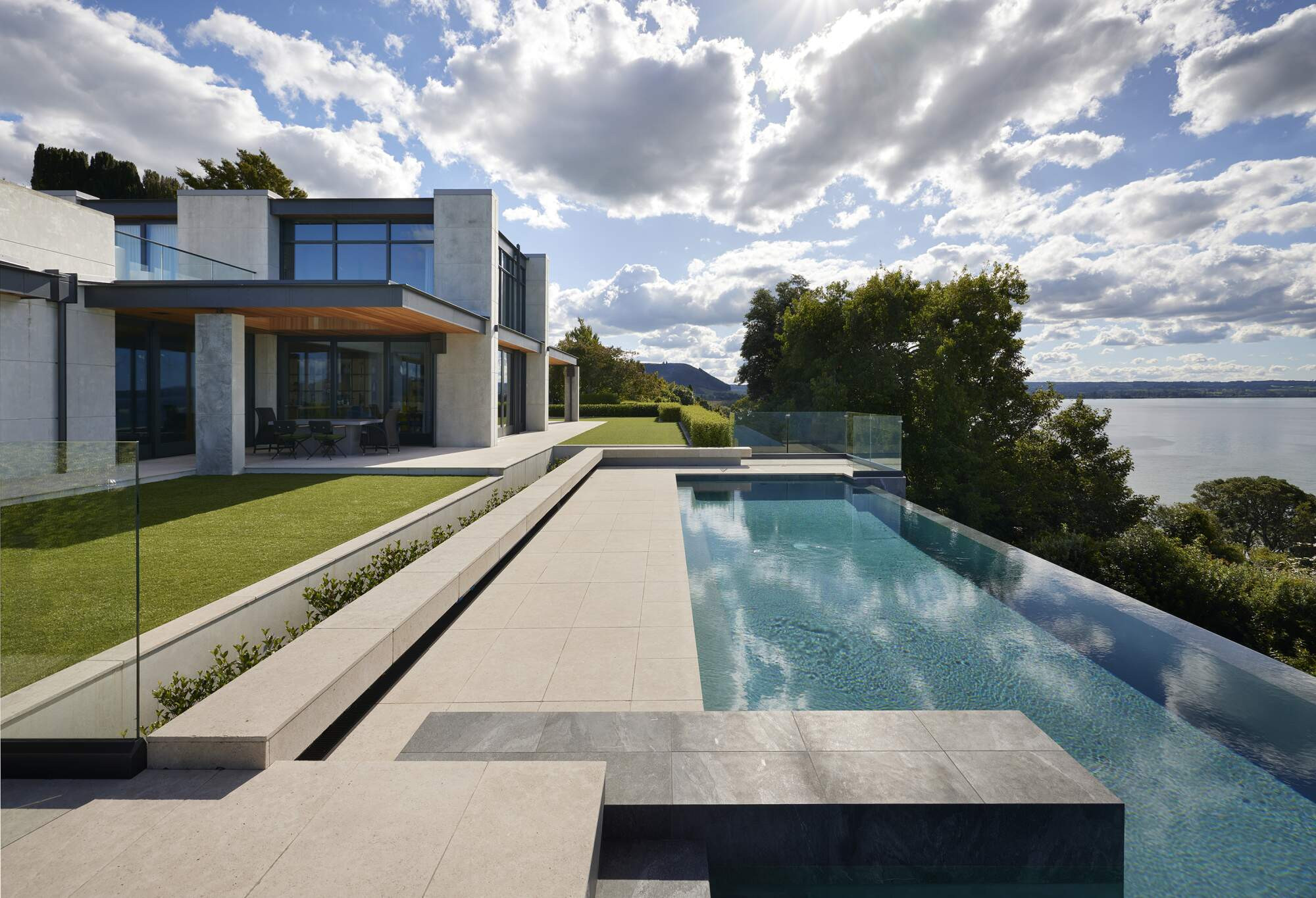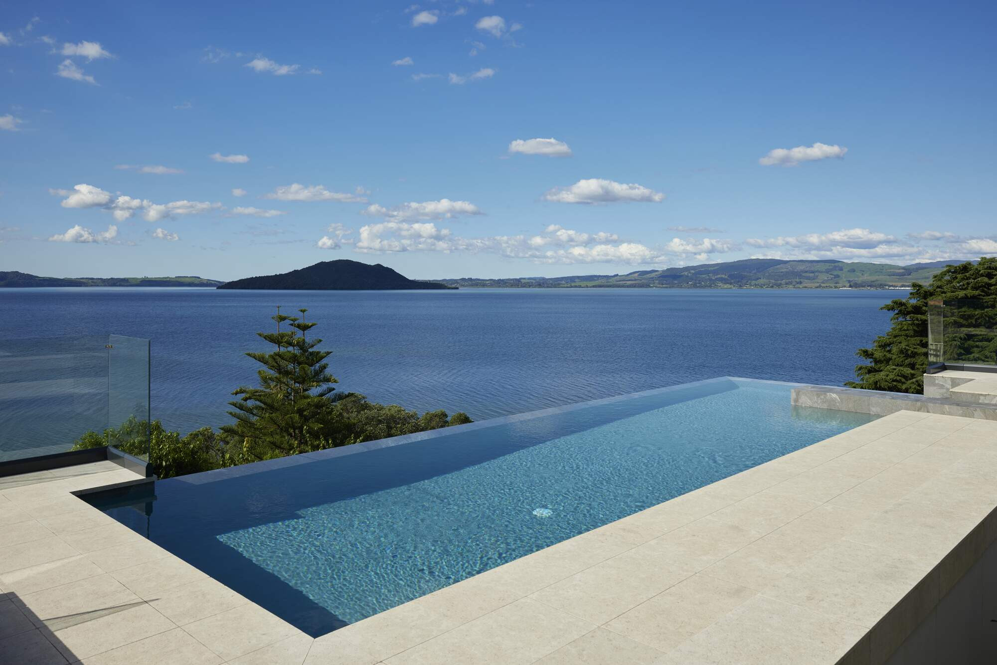 Perched above the serene Lake Rotorua, this pool boasts a mesmerizing visual spectacle, blending seamlessly with the stunning water views and reflections to create an illusion of an infinite horizon. Our client's creative vision to integrate the steep drop at the edge of their property has resulted in a truly unparalleled sight. The pool appears to merge effortlessly with the lake, presenting an awe-inspiring scene where the water meeting effect is nothing short of dramatic.
