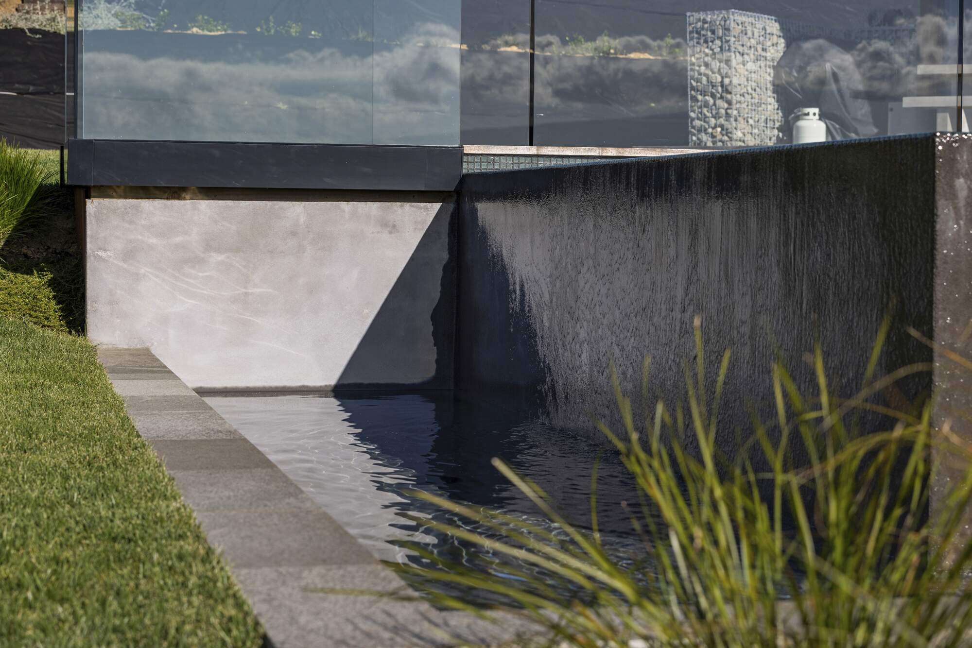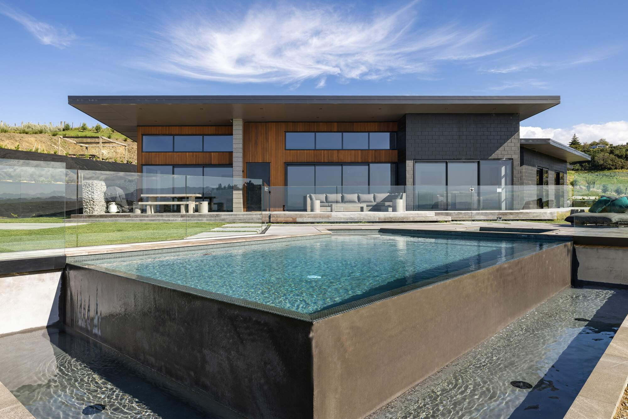 This project was all about creating a stunning pool and spa that would blend perfectly with the natural landscape and make the client feel completely immersed in the stunning view. The negative edges on two sides of the pool, along with the weir system, give the impression of a never-ending body of water. The pool and spa were finished with a deep ocean blue color, chosen to complement the features of the house and make it feel like a natural part of the landscape.