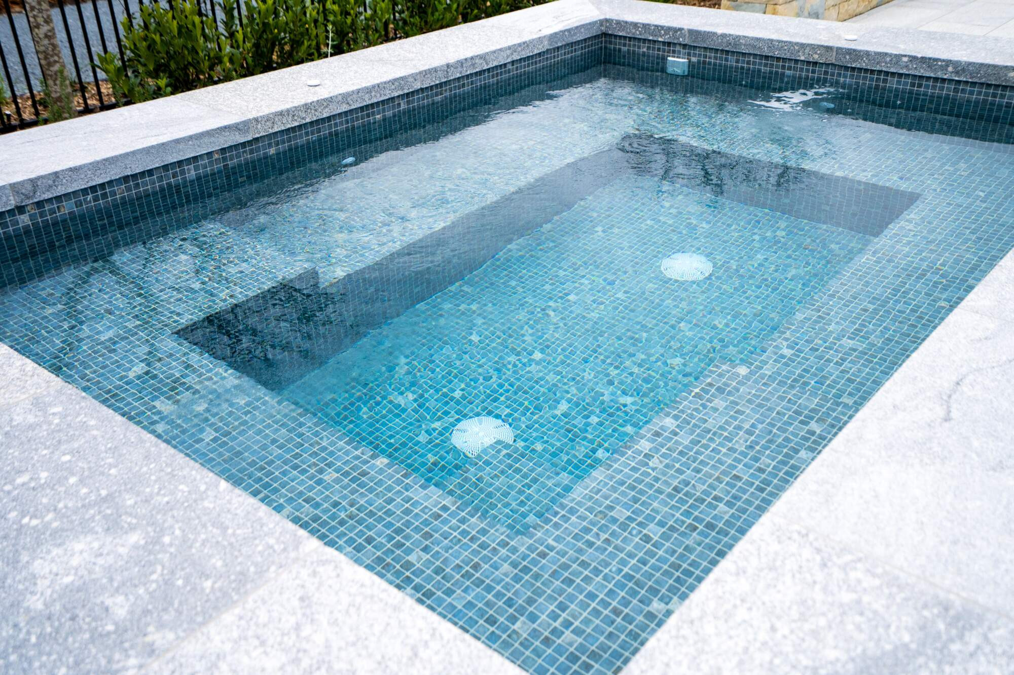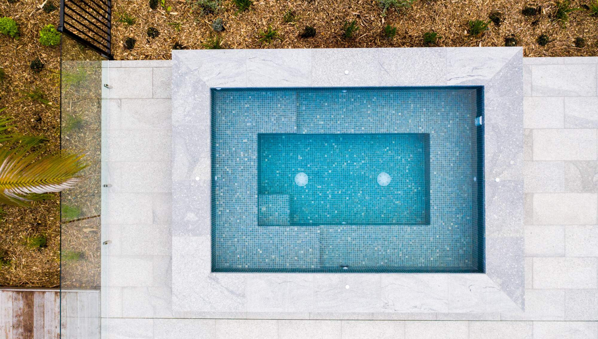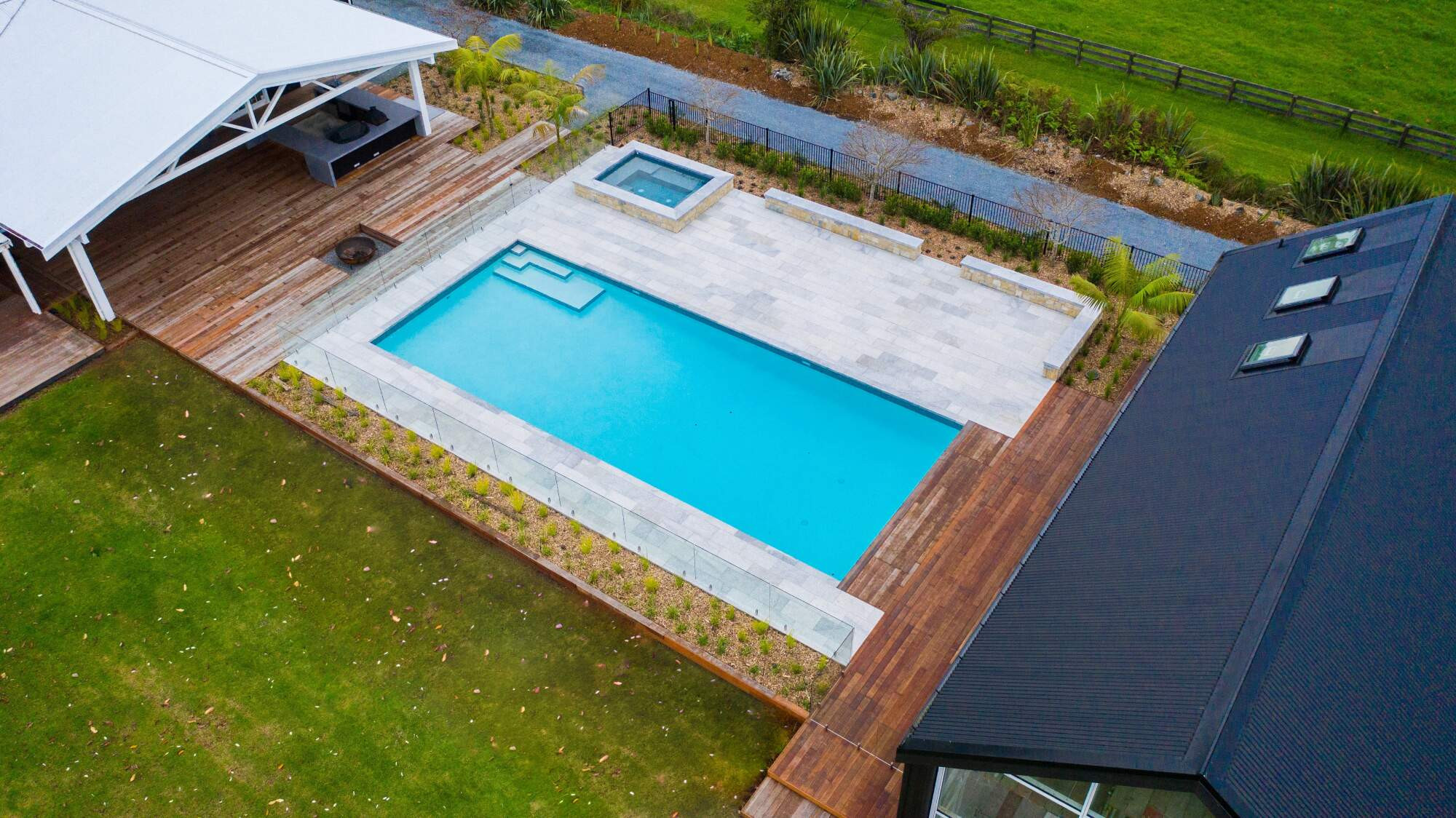 Tastefully designed 12 person spa strategically positioned on this beautiful property. Built near the outdoor kitchen bar and sunken fire pit for entertaining guests, while next to the pool for summertime fun! It is also in a raised position to create a view over the property but private enough for a evening soak under the stars.
