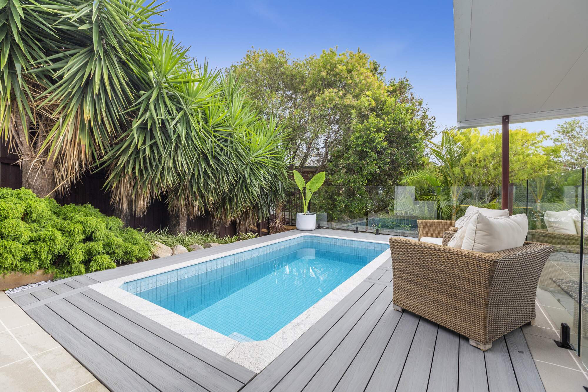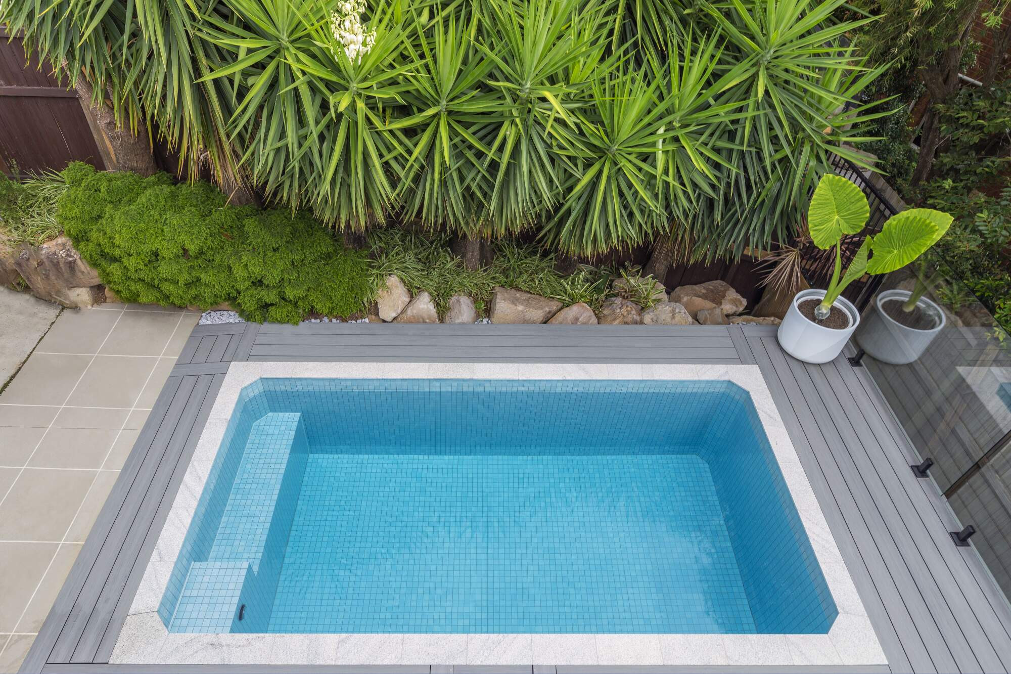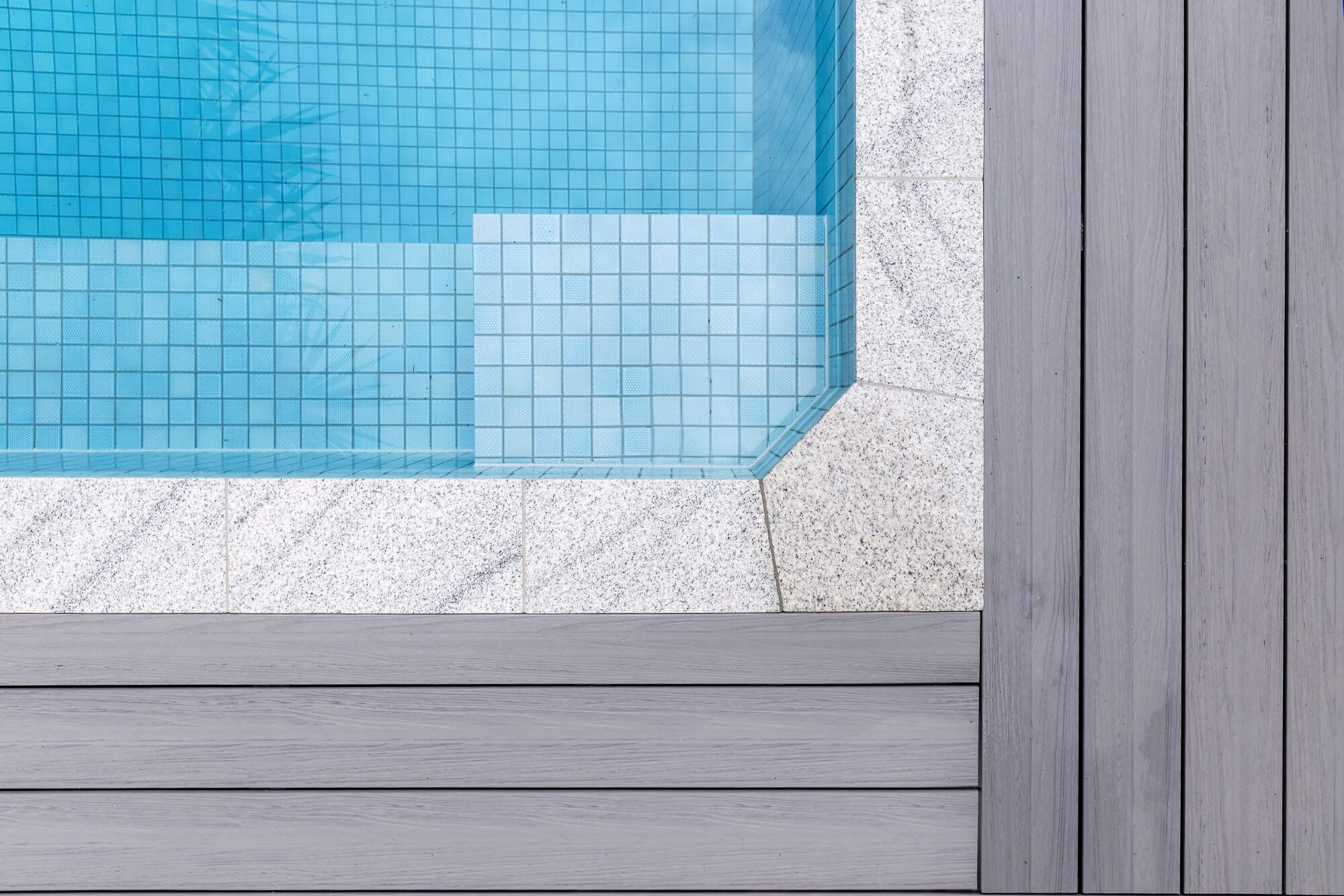 Elegant simplicity at its finest. This beautiful fully tiled pool presents differing tones and moods, light and shade, creating a stunning visual experience. The decking and foliage achieve a perfect balance between hard and soft finishes that effortlessly combine in elegant harmony.