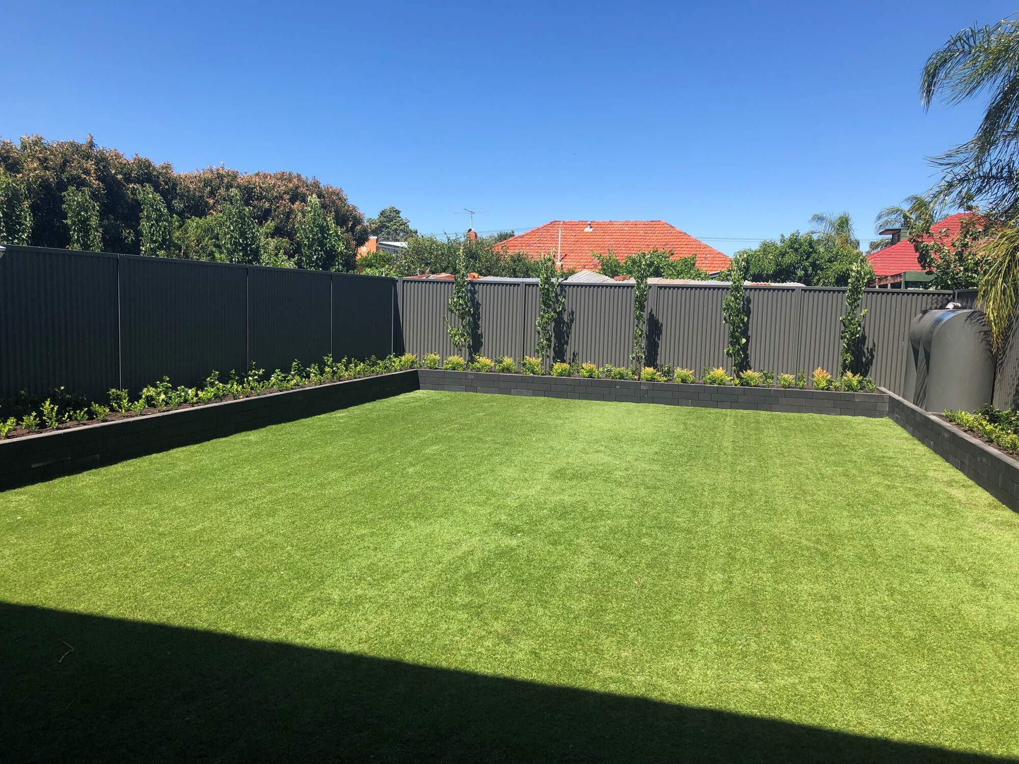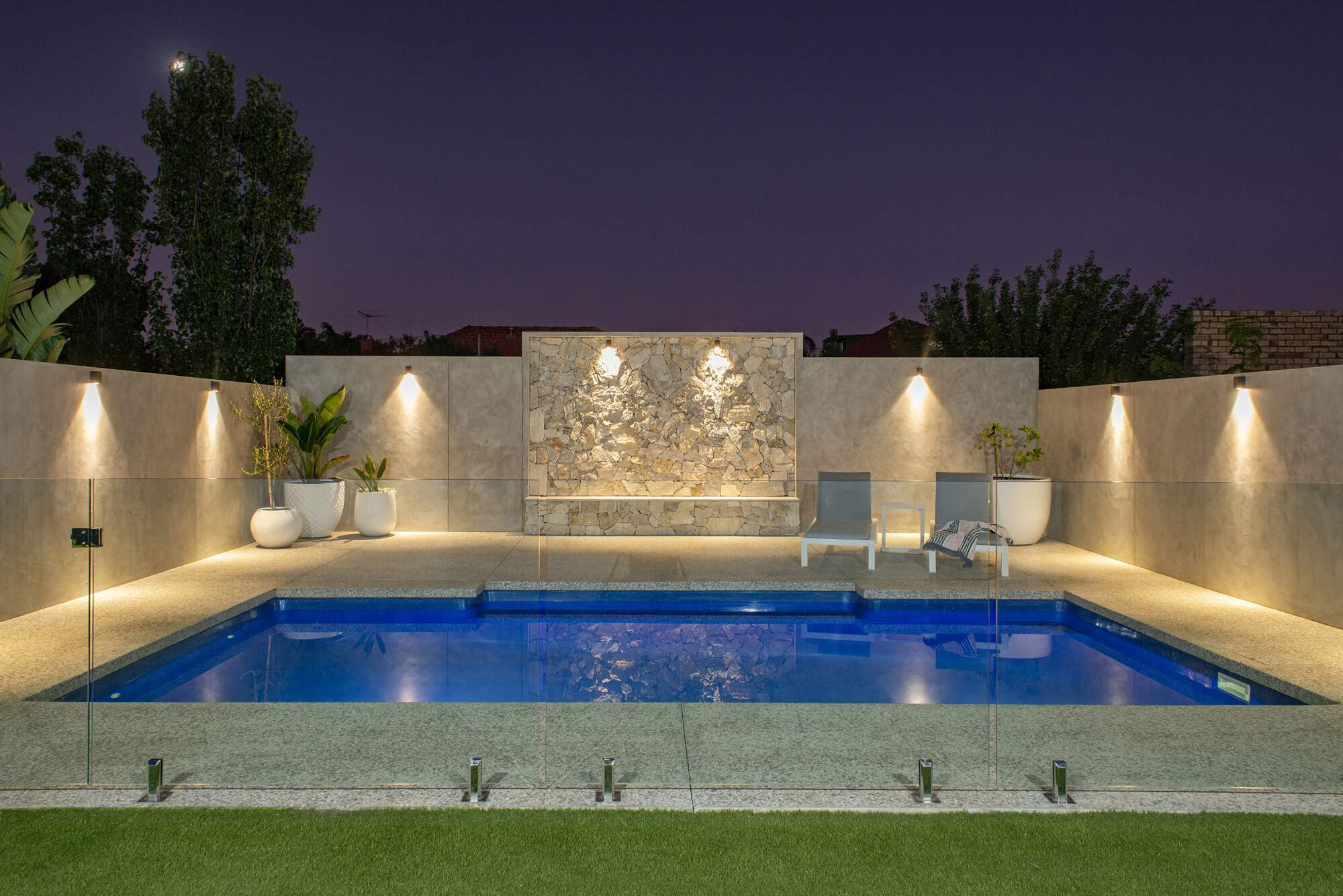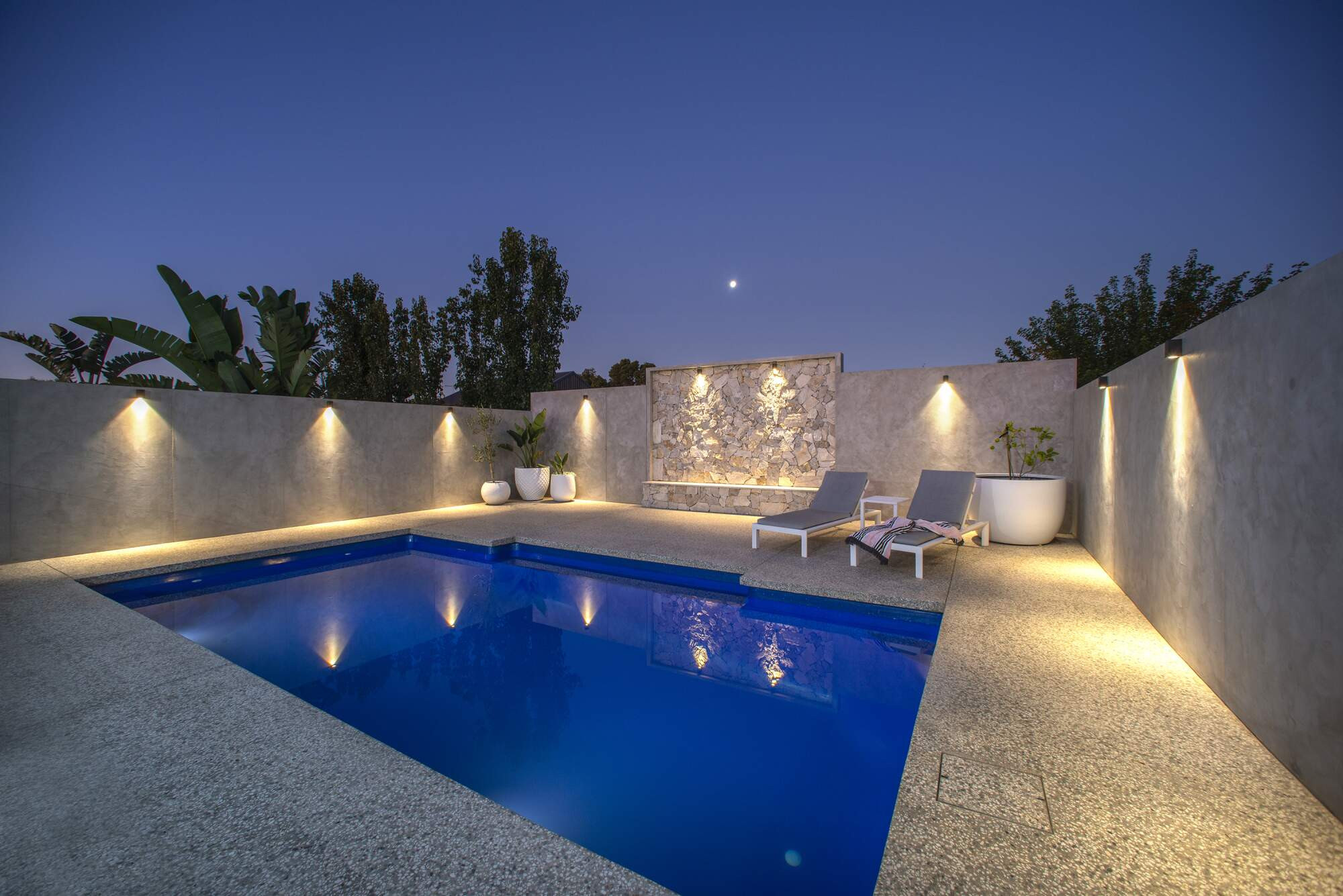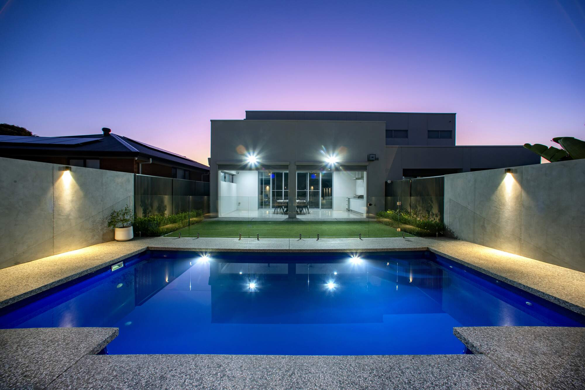 The clients jumped at the chance to install a pool and save on crane costs when they heard their neighbours were demolishing their home, giving them easy access. They wanted to create a serene, elegant and industrial outdoor area that was in tune with the home's overall look. The pool was chosen to match the sharp outlines of the home's design, while its colour harked back to the Aegean Sea, a reminder of the homeowners' Greek roots.