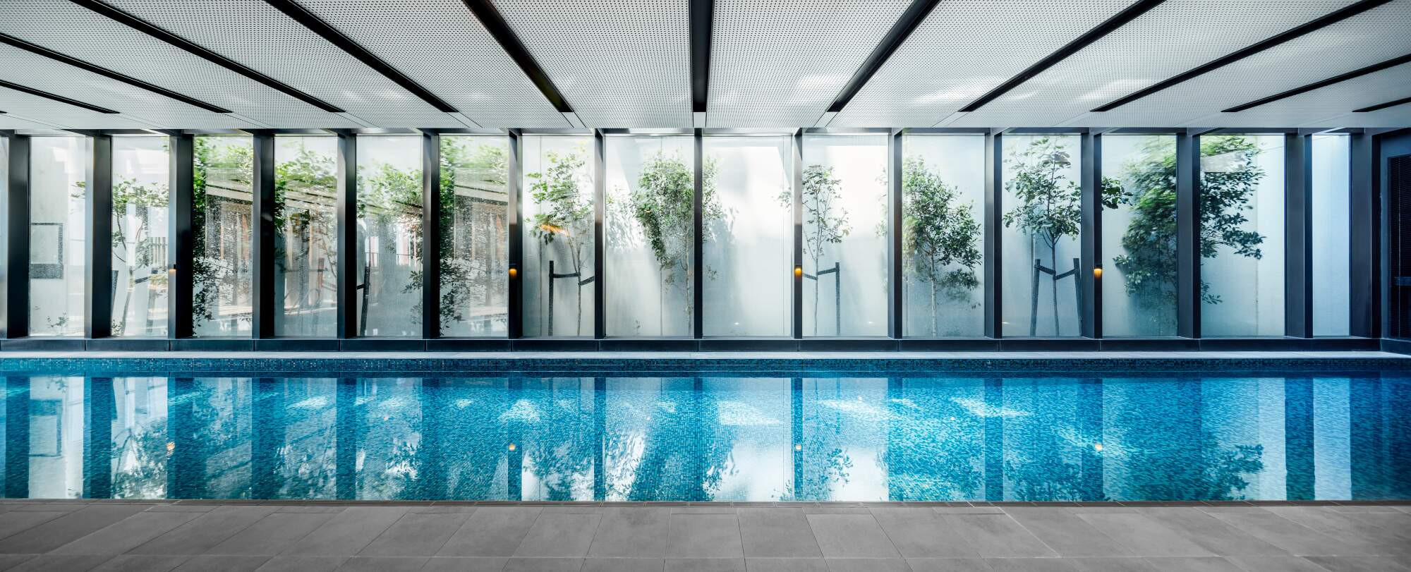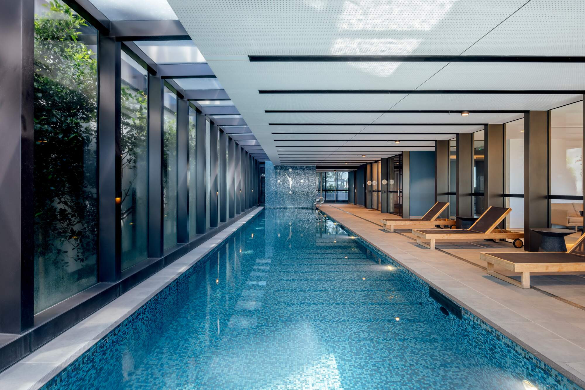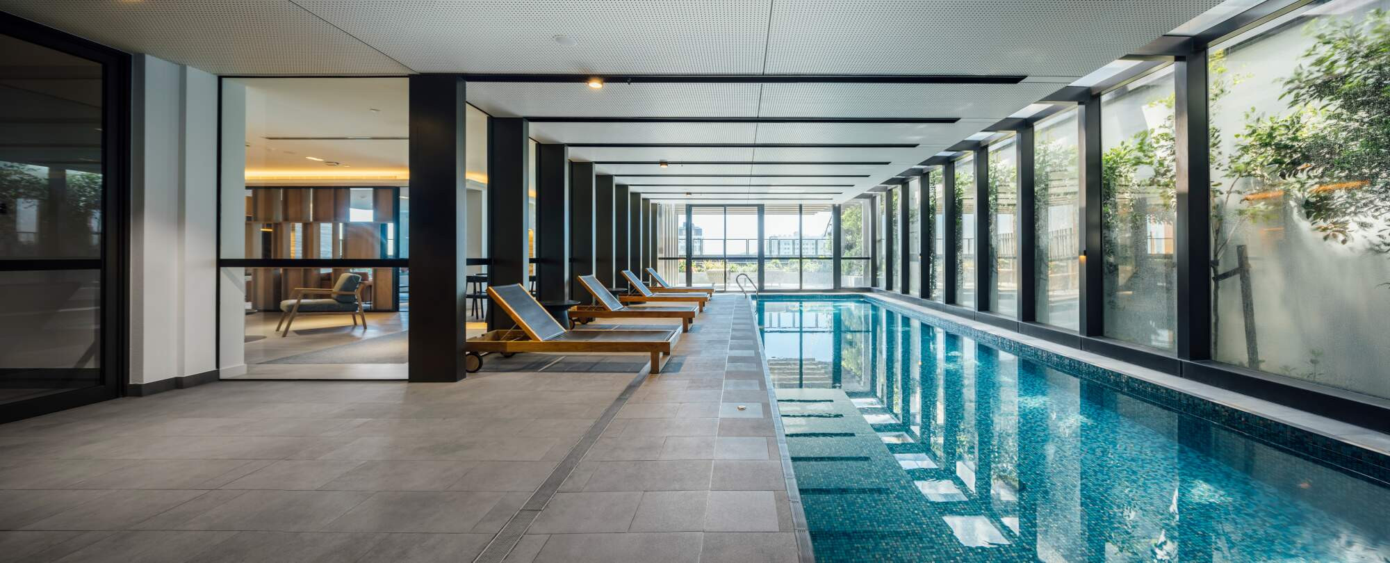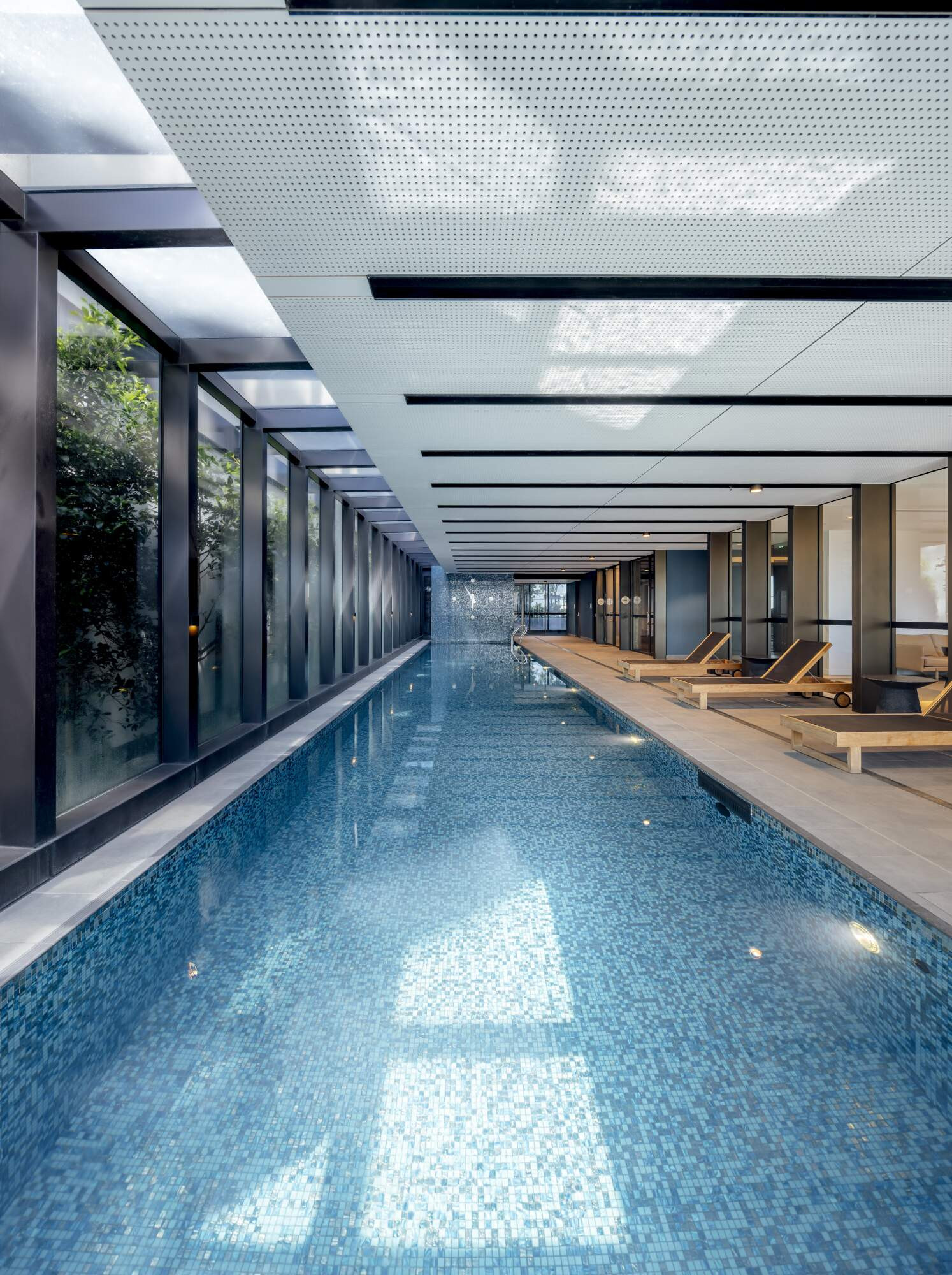 A sophisticated new arrival on Melbourne's eastern skyline, East Central Box Hill is a modern-day sanctuary and exclusive lifestyle destination. This luxurious indoor pool has been designed as a contemporary lifestyle statement that beautifully complements the building's overall style, which draws inspiration from Melbourne's vibrant culture and urban landscape.
