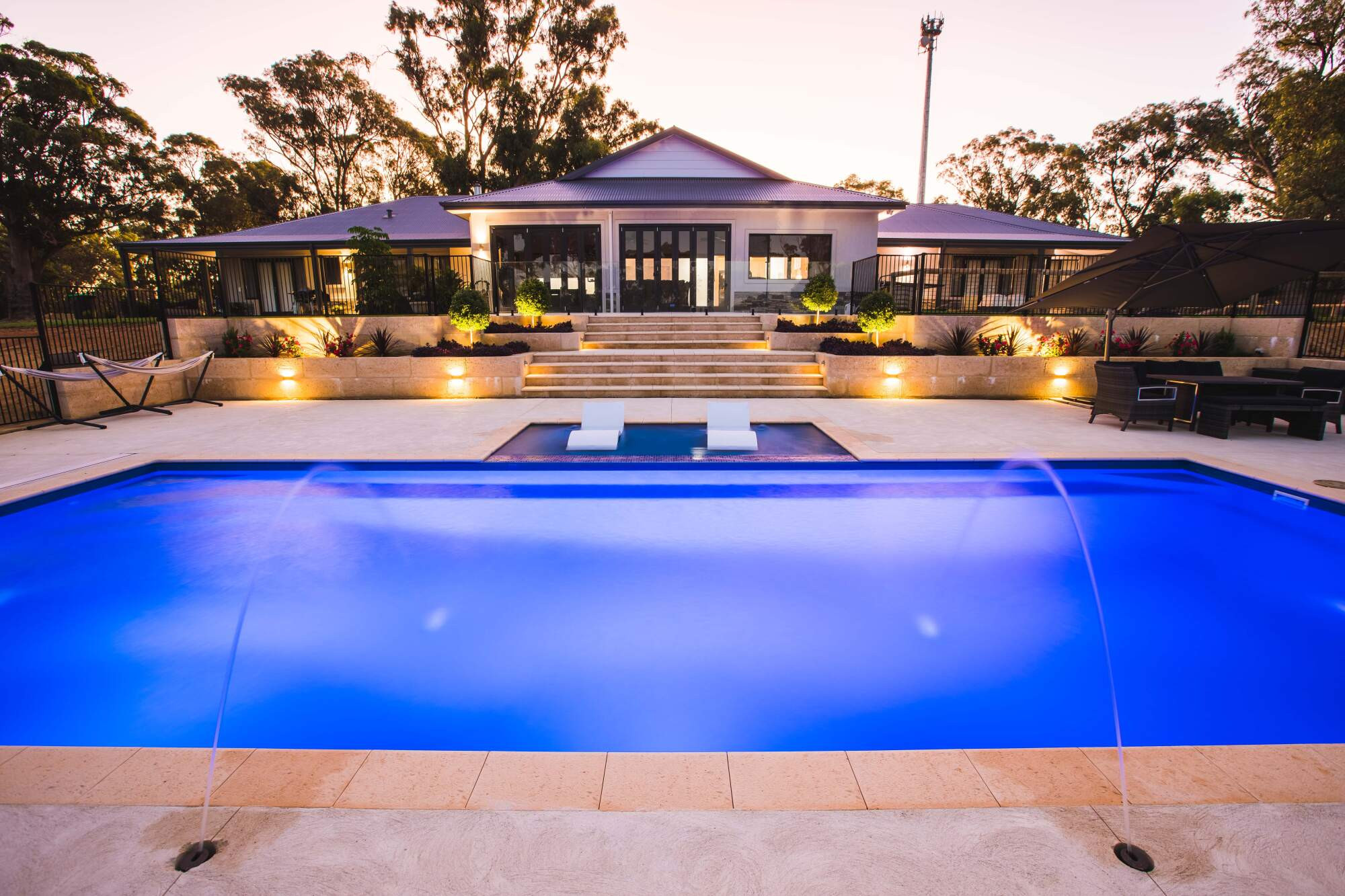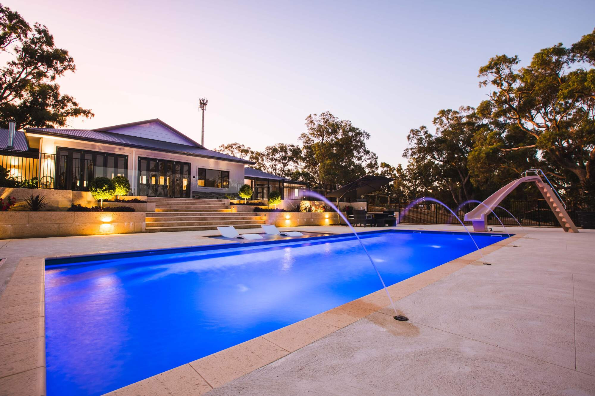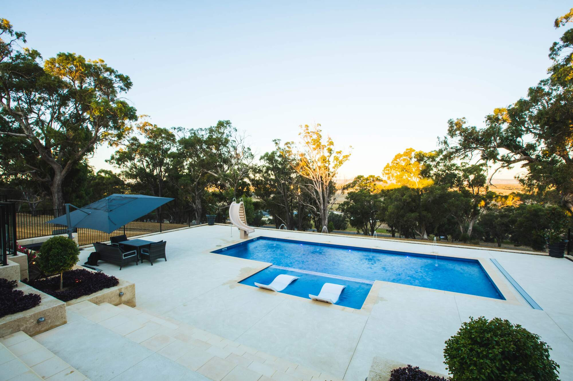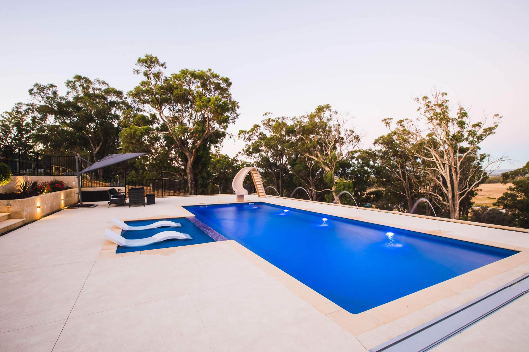 Descending the large sweeping steps, you are greeted by the stunning sight of an 11m x 4.45m fibreglass pool. With a wide range of features such as an Aqua Ledge and pool slide, this pool has all the luxuries you could ever ask for. The striking deep blue hue of the pool is a beautiful contrast to the light-coloured limestone and creates a truly enchanting atmosphere.