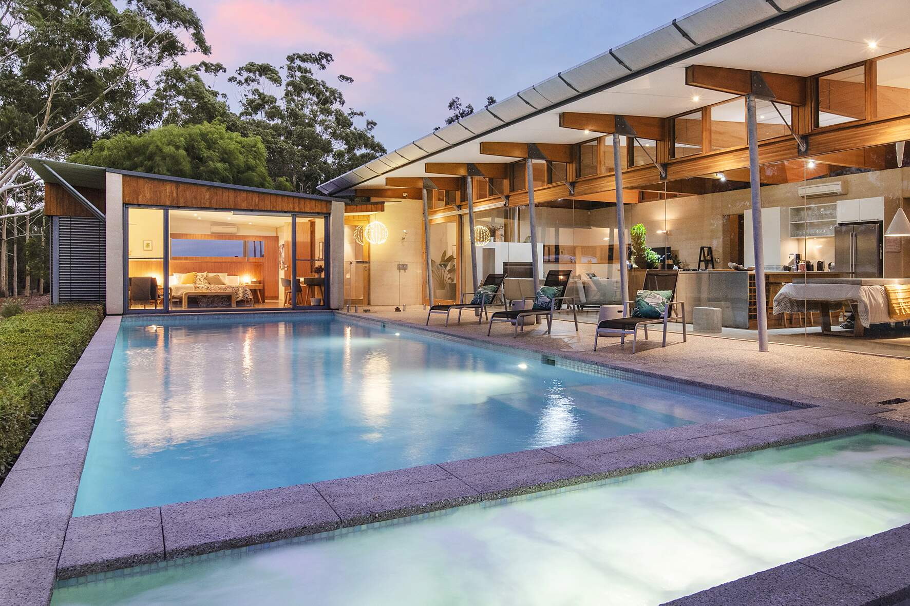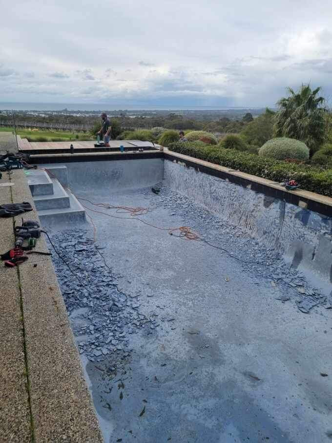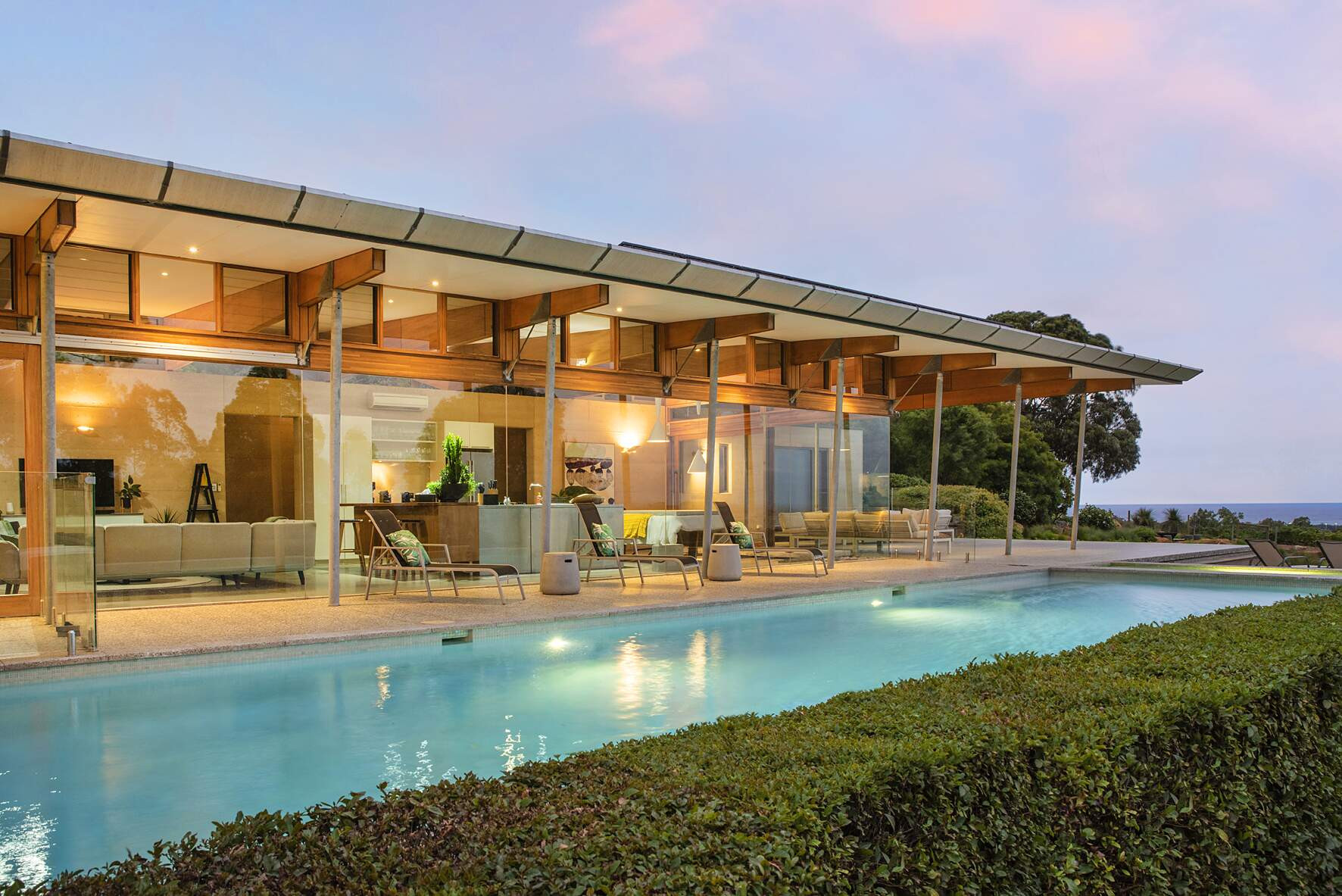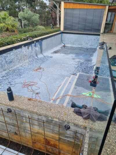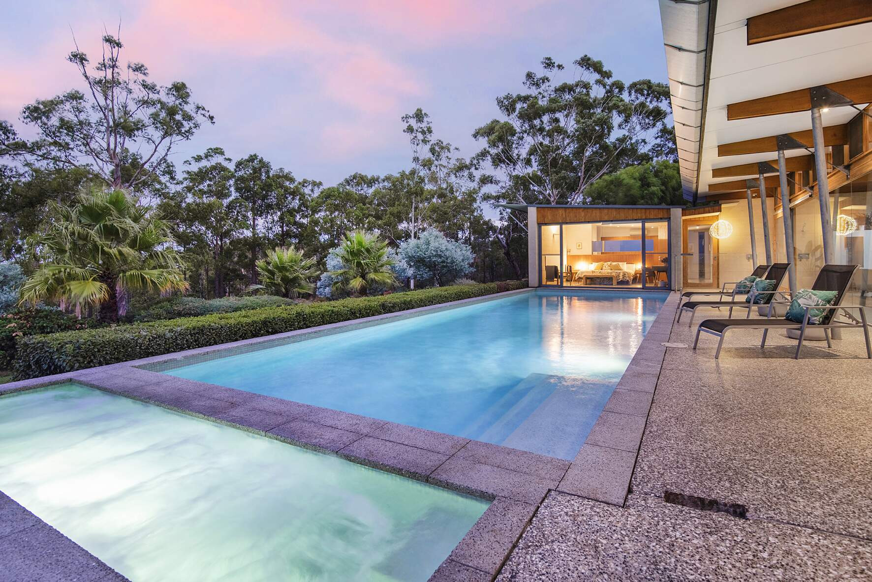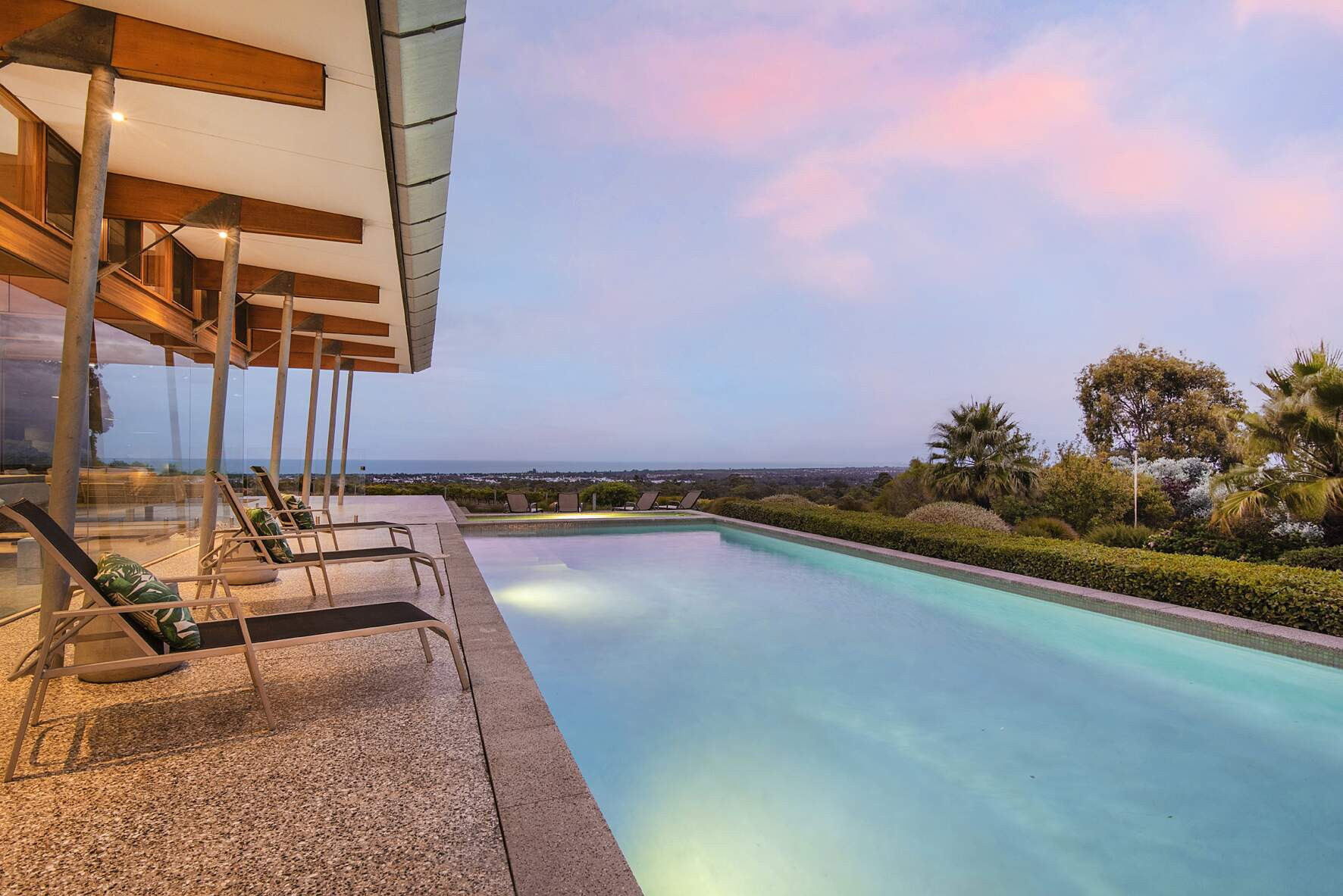 This magnificent house located overlooking Geographe Bay required a sleek designed pool to match. But the owners didn't stop their adding a small but functional spa to the end of the pool. With uninterrupted views to the Bay this spa and pool combination also blends effortlessly with it's bush surroundings. The pool waterline and steps along with the spa waterline and seating area is tiled in an Onyx Opalescent Verde Mosaic Tiles and rendered in Whitsunday Blue Glass Pebble render.