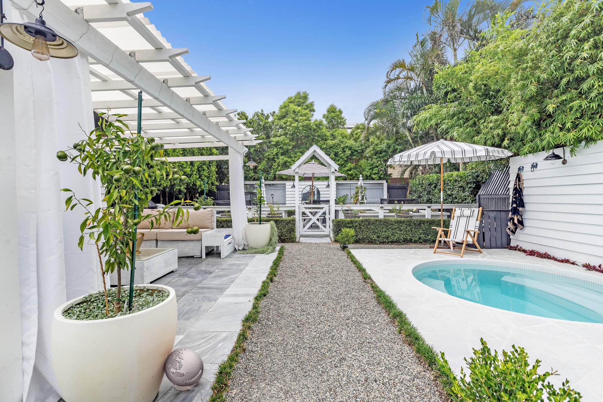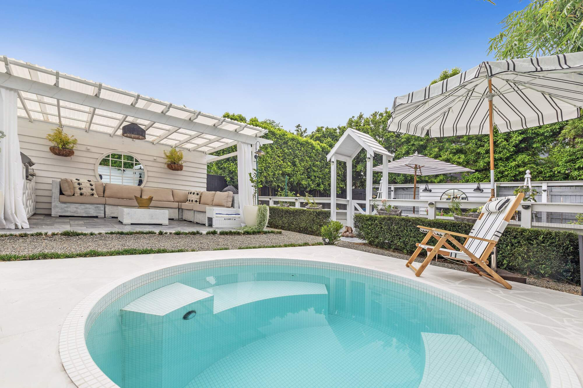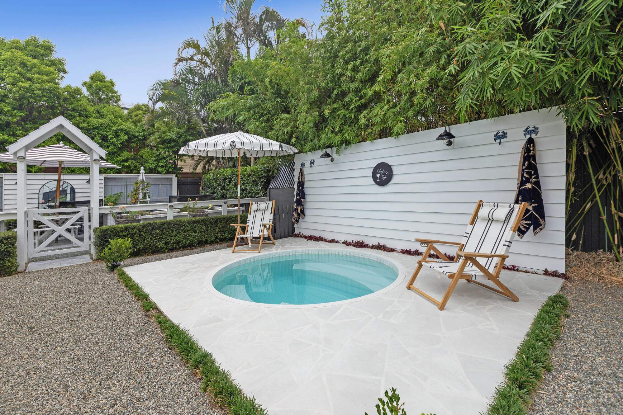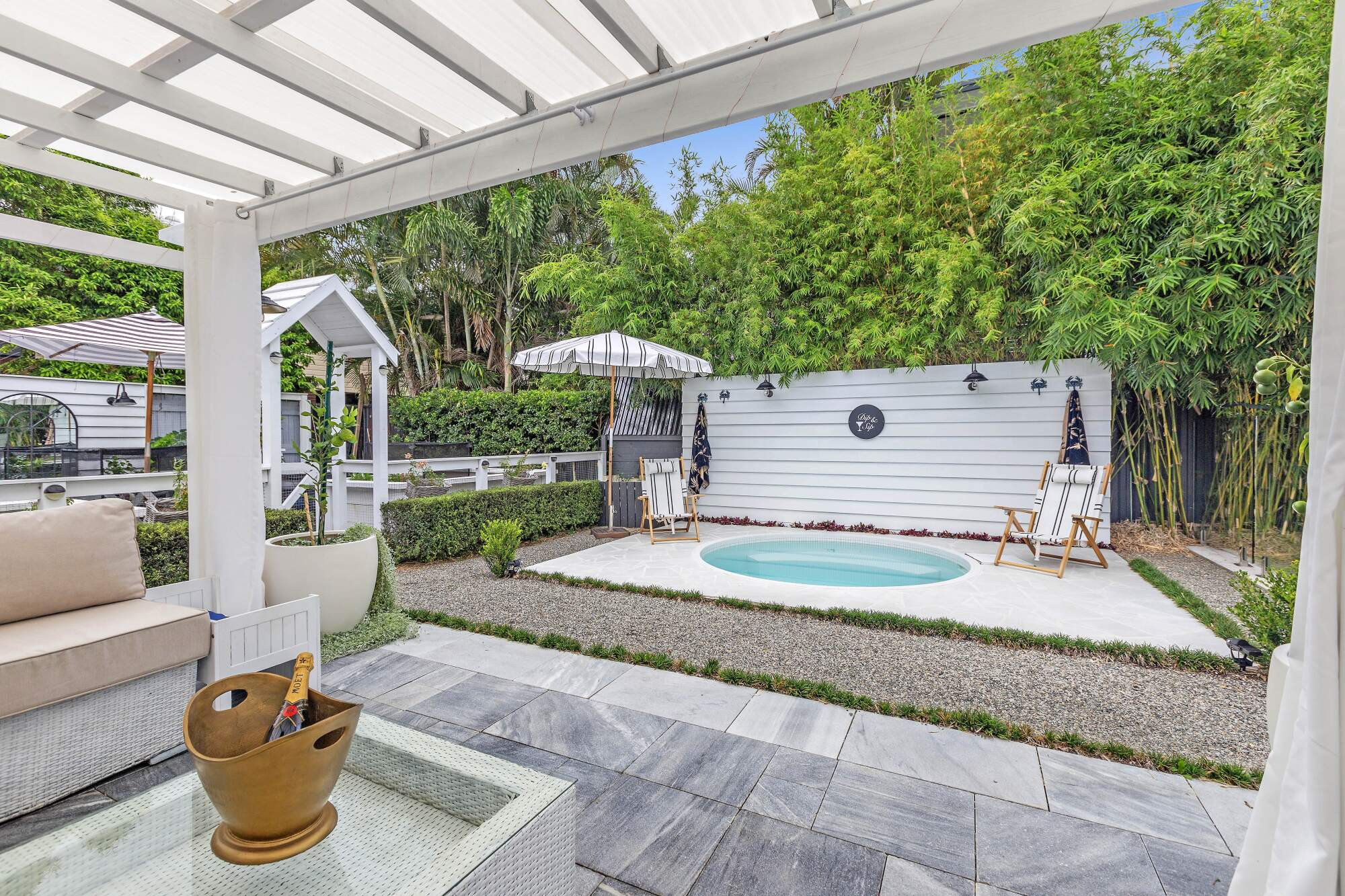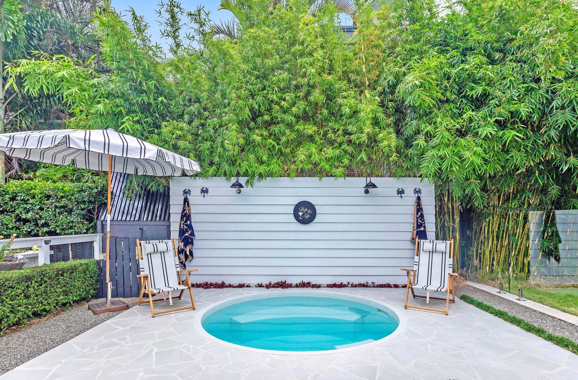 Private and secluded - yet only a stone's throw from the beach - this stunning coastal inspired poolscape evokes a natural, tranquil feeling that befits its waterside surroundings. The weathered charm and laid back vibe create a space that beckons you outside to relax and rejuvinate.