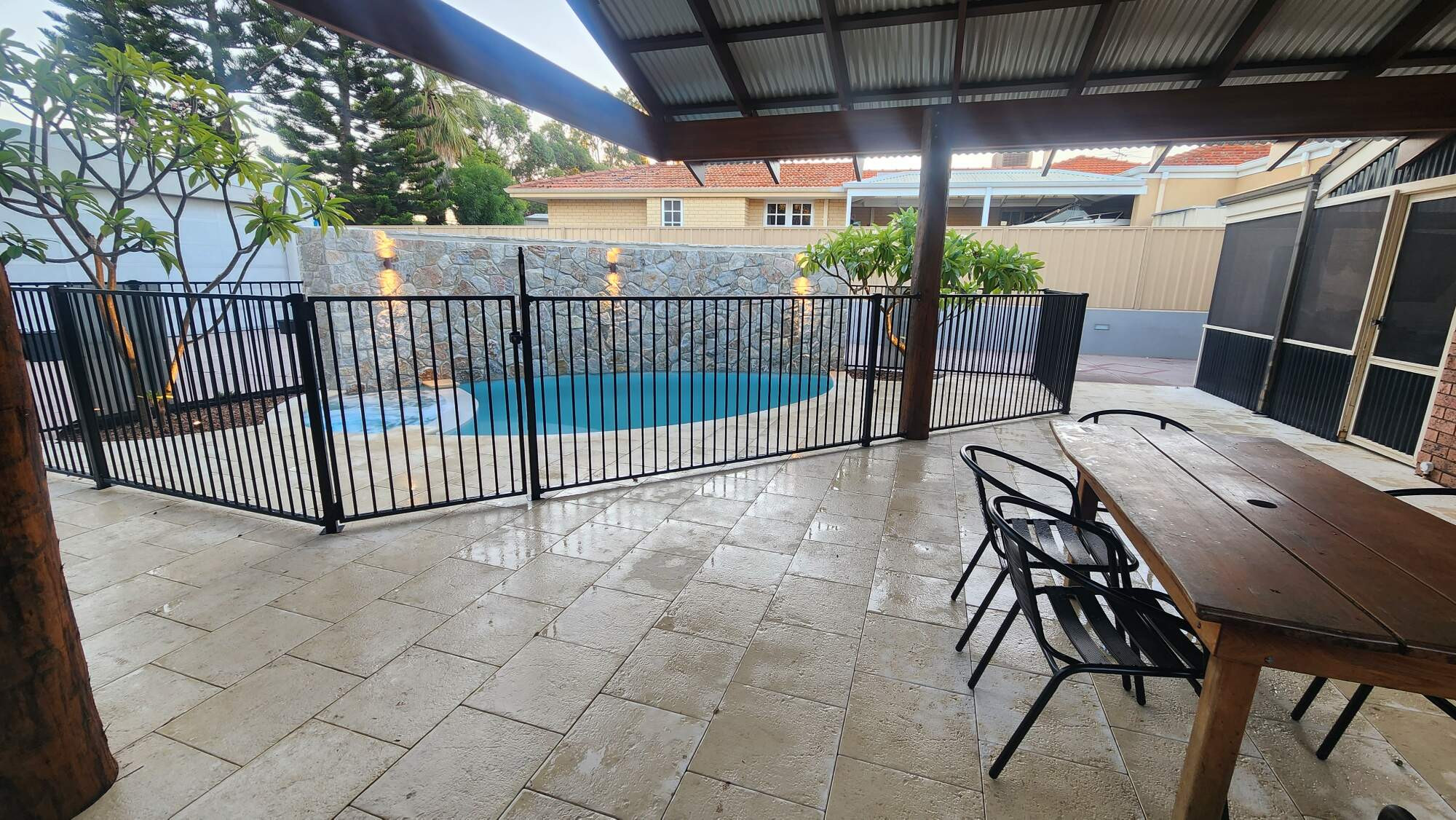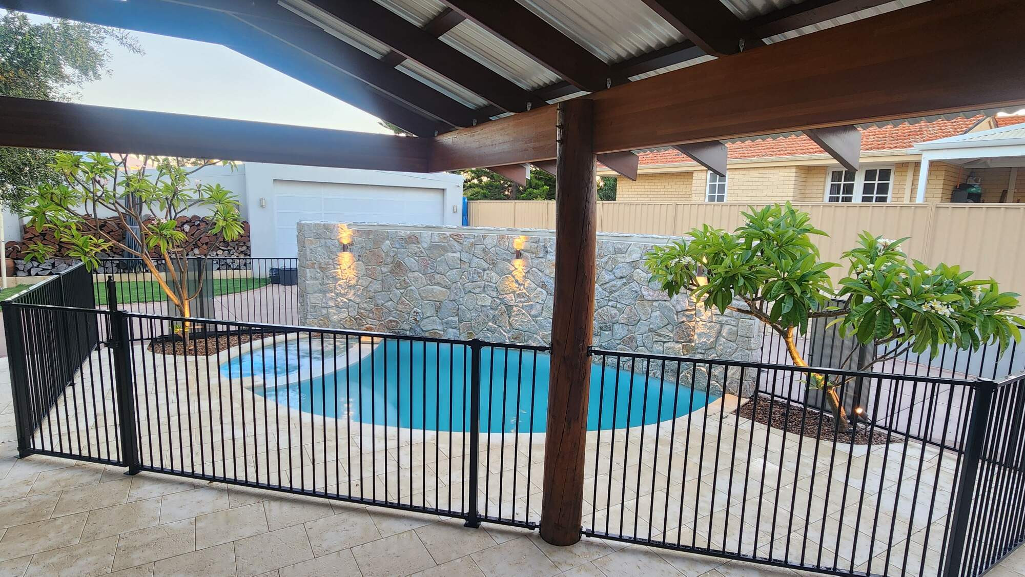 This rustic outdoor oasis is a visual and aural feast for the senses - a palate of pleasures where every turn reveals a unique and pleasing individual touch and representation of the owners style and desire. The water wall, lighting and pool/spa design creates an oasis of relaxation and relief that not only calms the senses but practically blocks the industrial uses at the rear of the property. The Bush Post Patio adds shade for the young family.