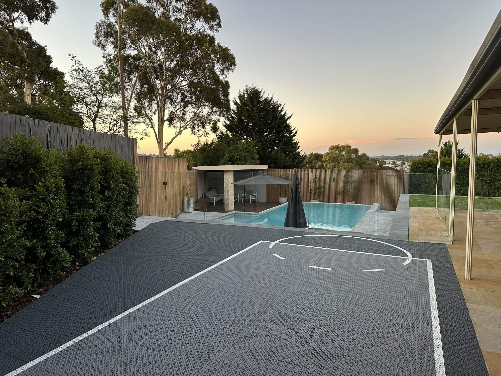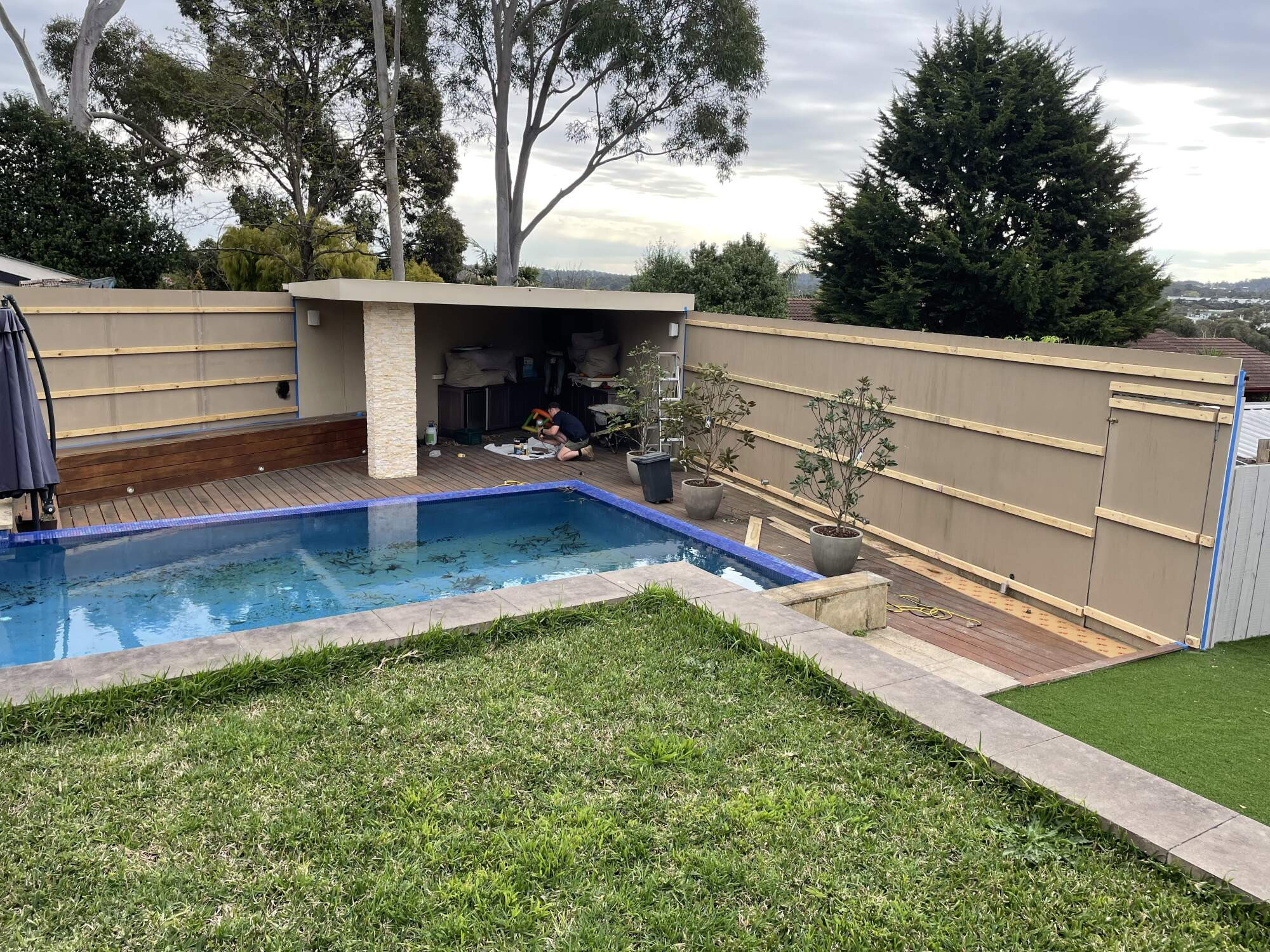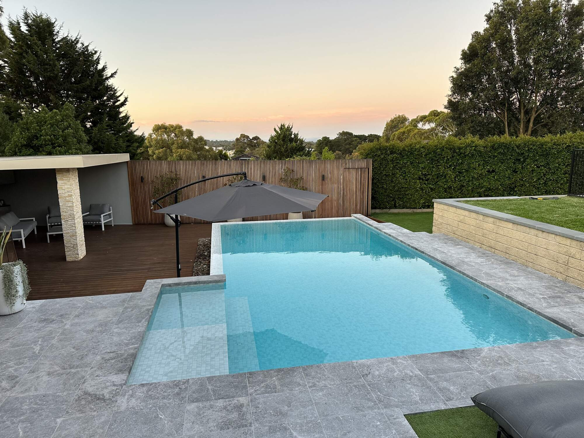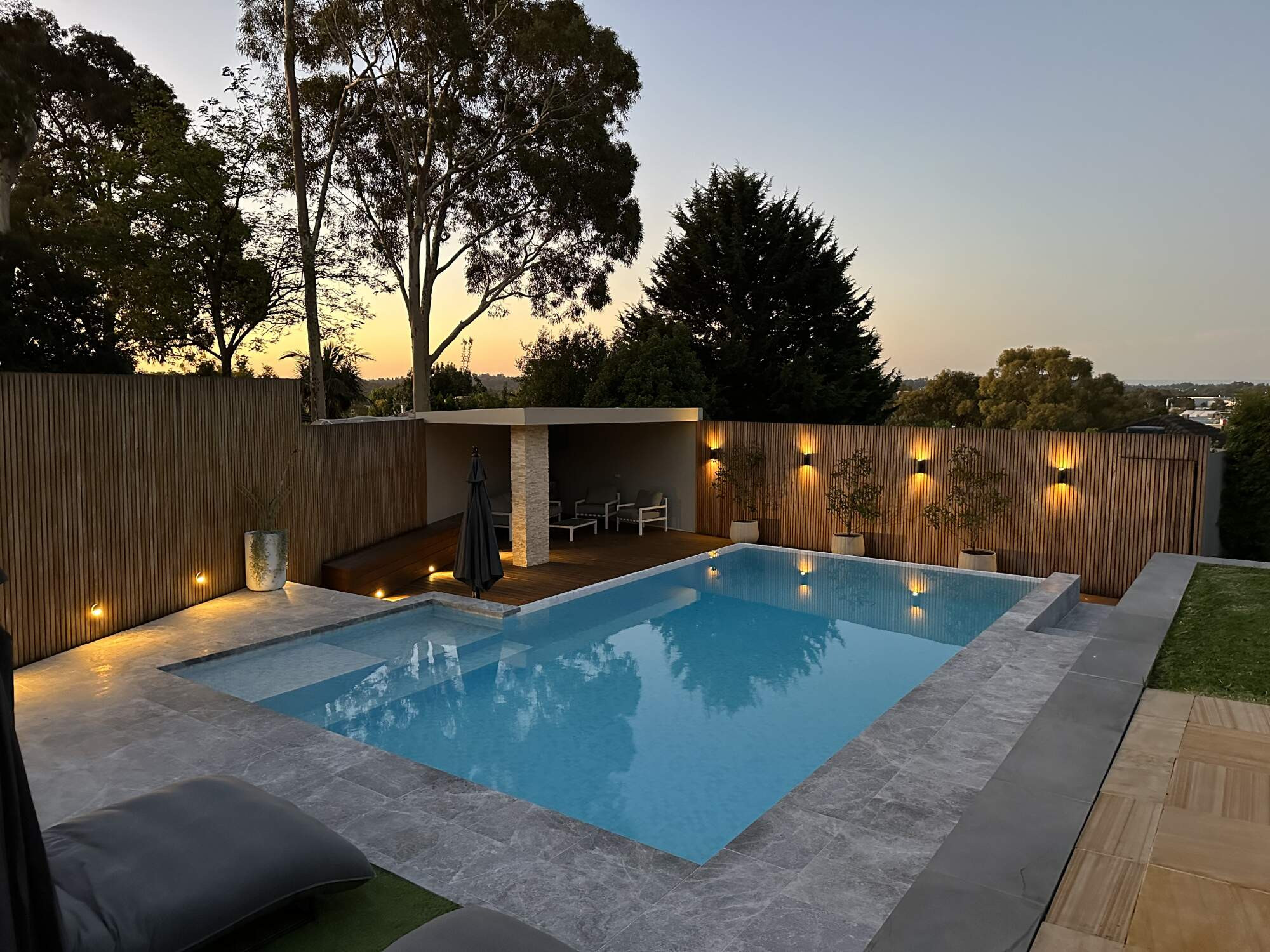 This pool and landscape renovation transformed this pool area from a dark, unused area into a dreamy family delight. The timber batten fencing frames the clear, sky-blue pool water with infinity edge perfectly, drawing the eye into the luxurious, spacious surrounds of the pool. The freshly stained, expansive decking and re-created pool house creates the perfect poolside abode. The upgrade to MagnaPools Minerals & a 24kw Heat Pump ensures the pool water is crystal clear and enjoyably swimmable!