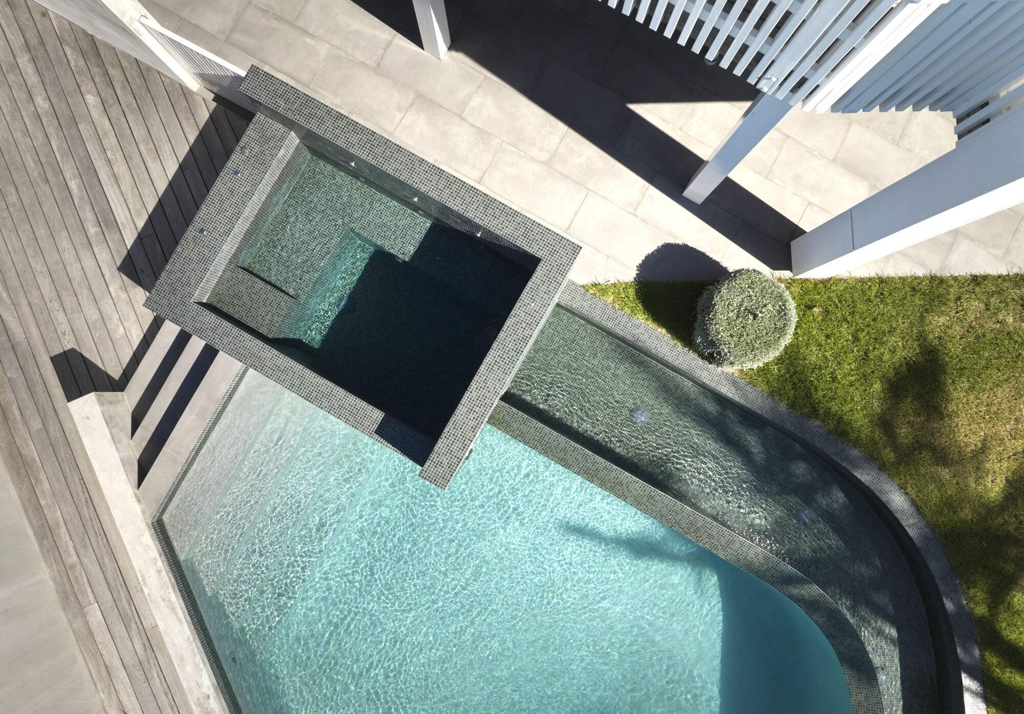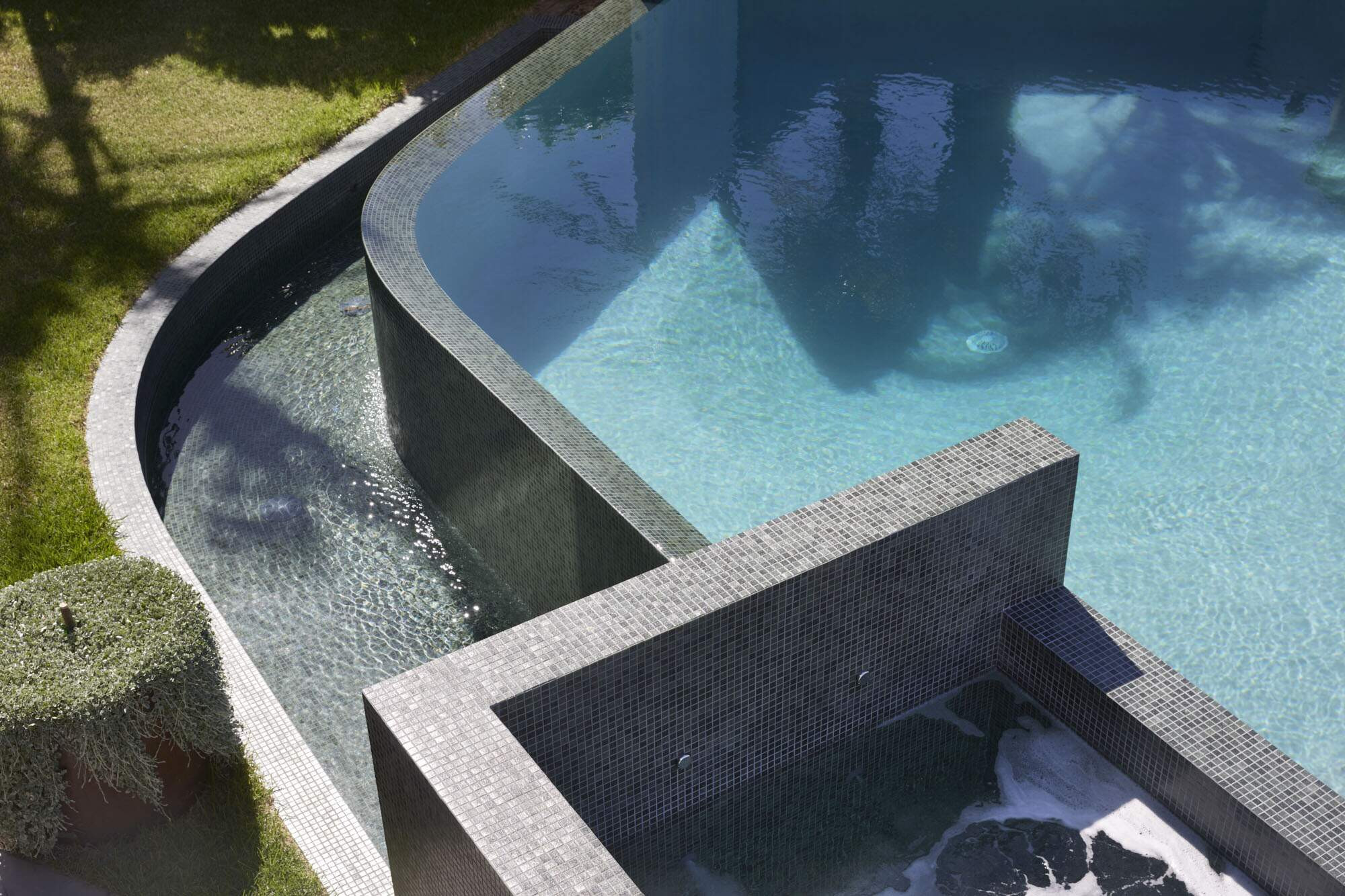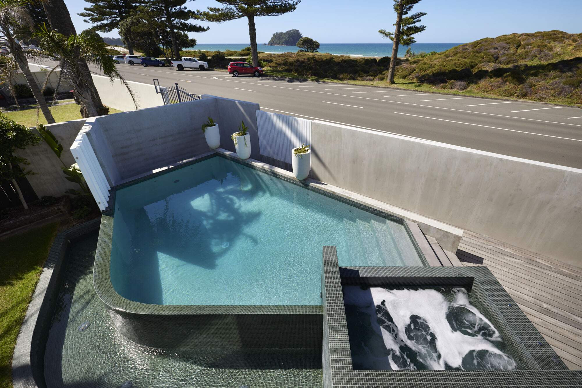 Elevated above ground level, this contemporary pool and spa design commands attention as the property's focal point. Its elegant curved water feature delights from all perspectives, seamlessly blending form and function to evoke the beauty of nature.