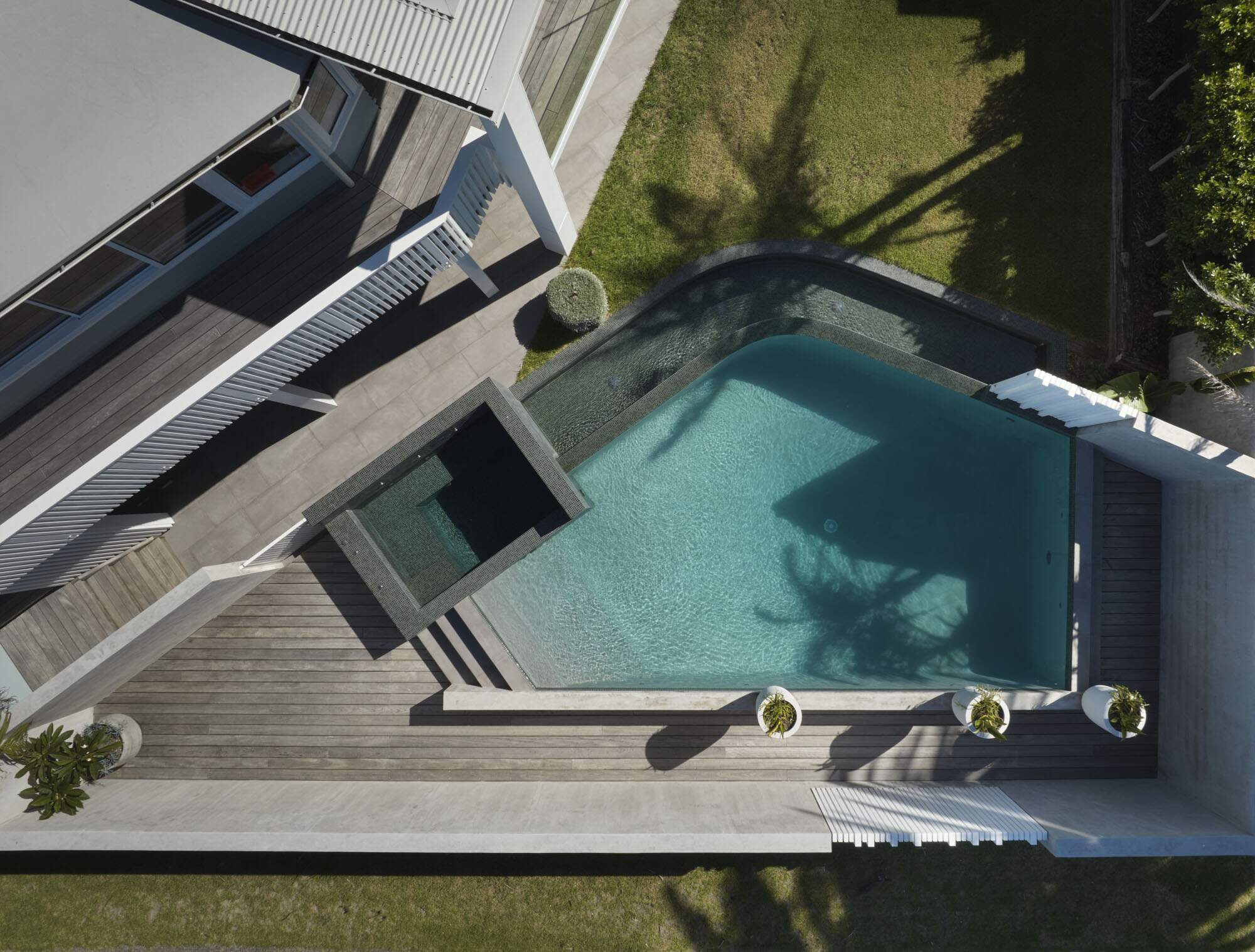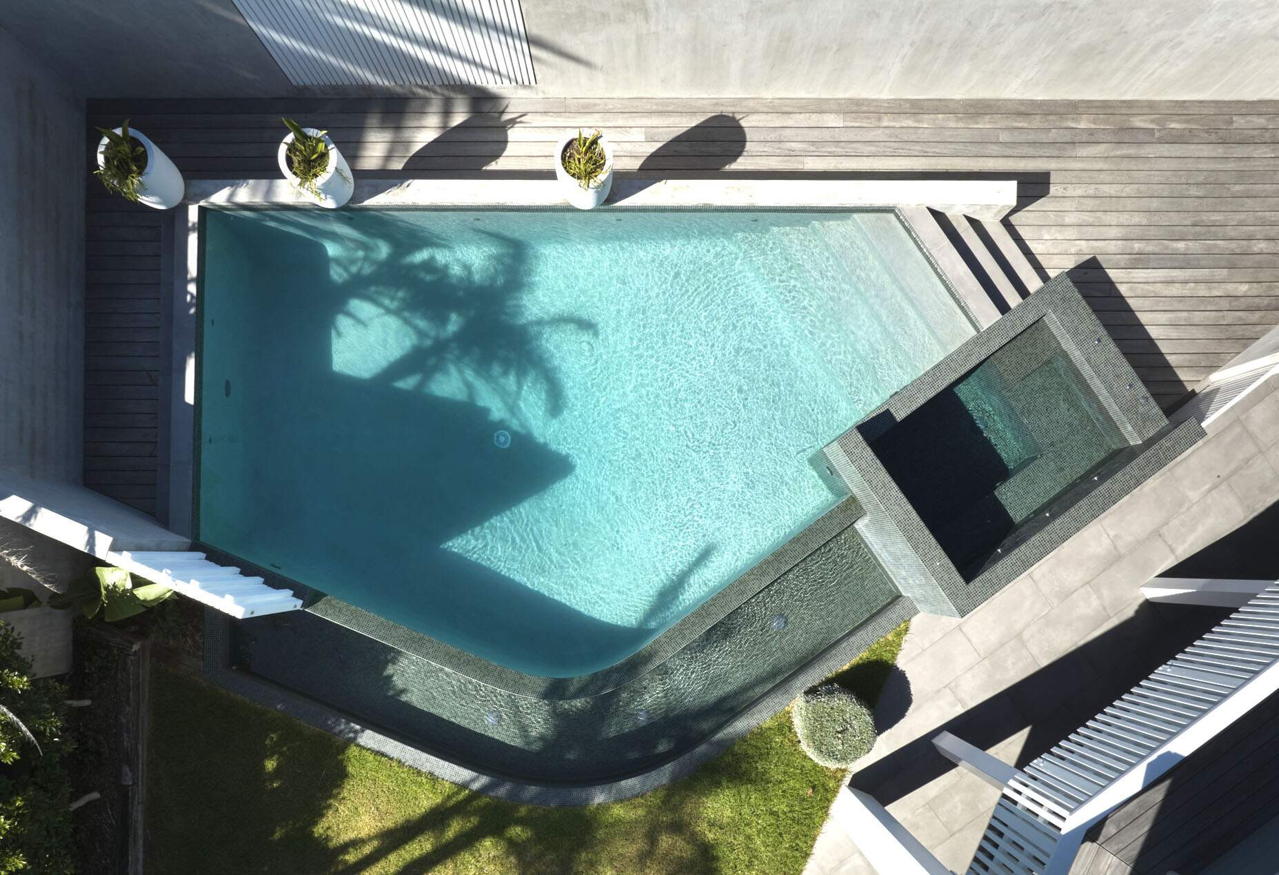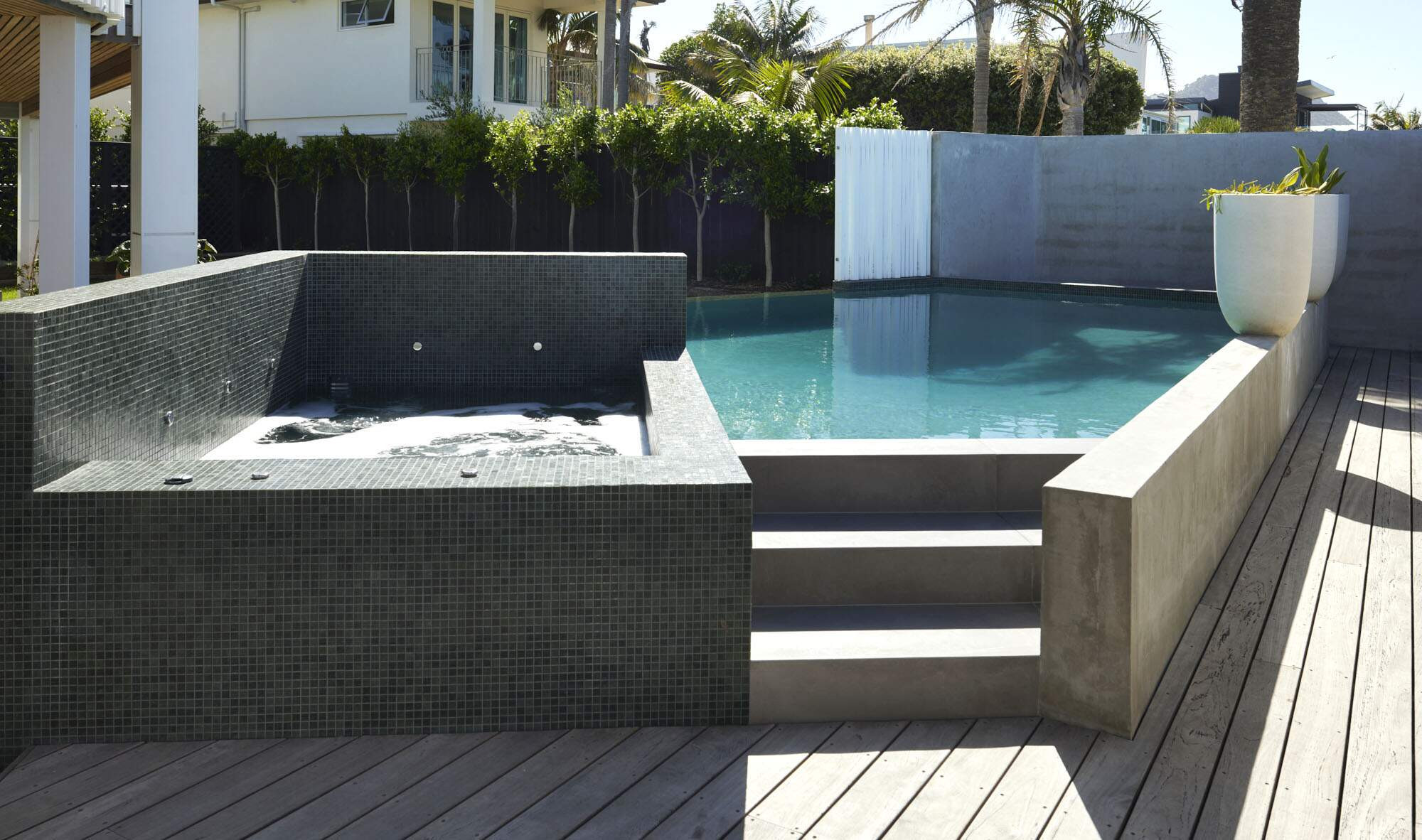 Elevated above ground level, this contemporary pool and spa design commands attention as the property's focal point. Its elegant curved water feature delights from all perspectives, seamlessly blending form and function to evoke the beauty of nature.