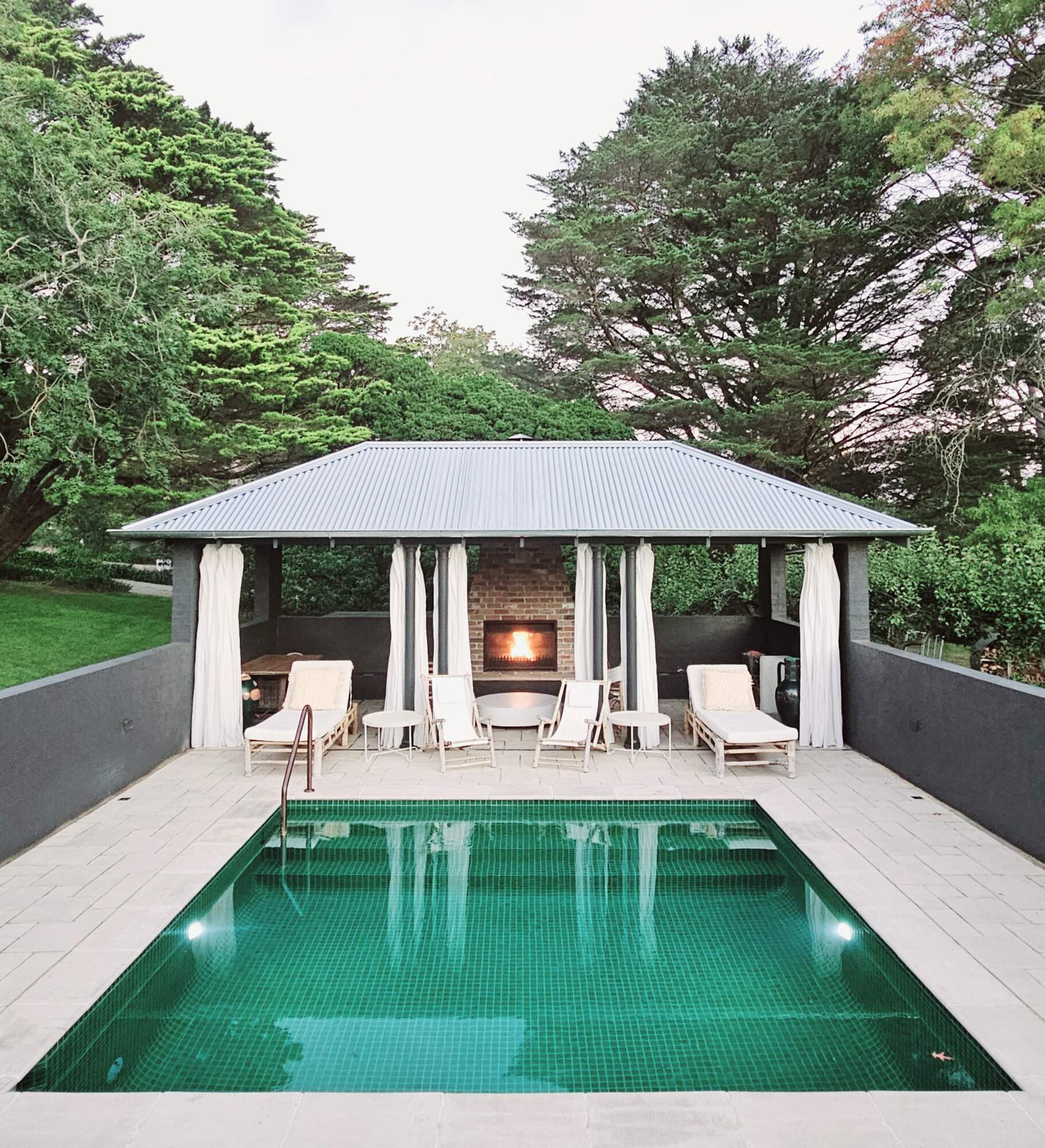 This gorgeous courtyard pool emulates a feeling of seclusion and poolside privacy. With extensive french pattern paved areas, adorning pool house, Moroccan influenced mosaic tiling and a cozy open fire retreat.