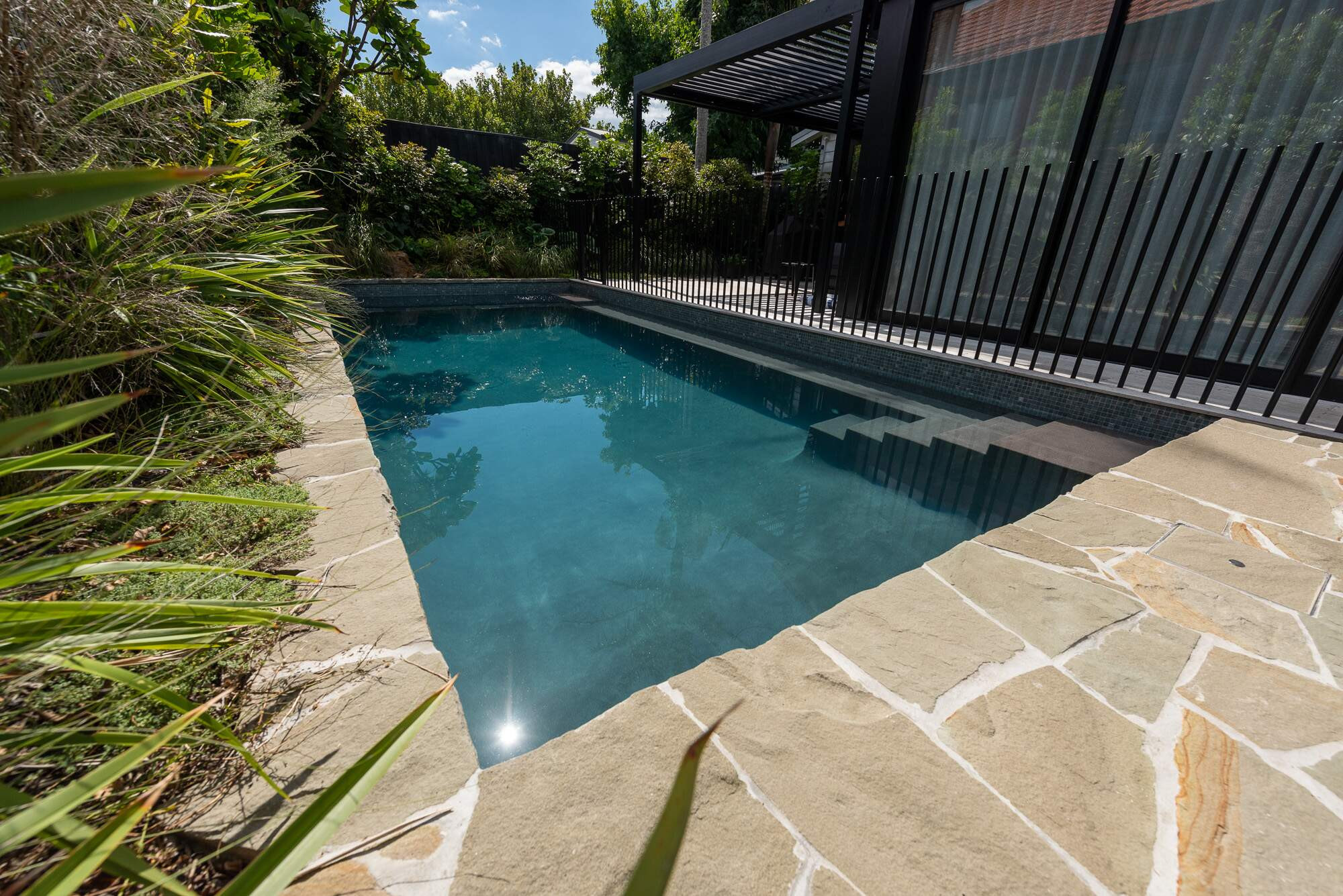 Bringing together the unique NZ quarried crazy paving, a custom coloured blended pool render, native planting and eco-friendly sustainable pool products, this pool became an instant hit with family and friends of the homeowner, epitomising the very essence of modern Kiwi summertime living