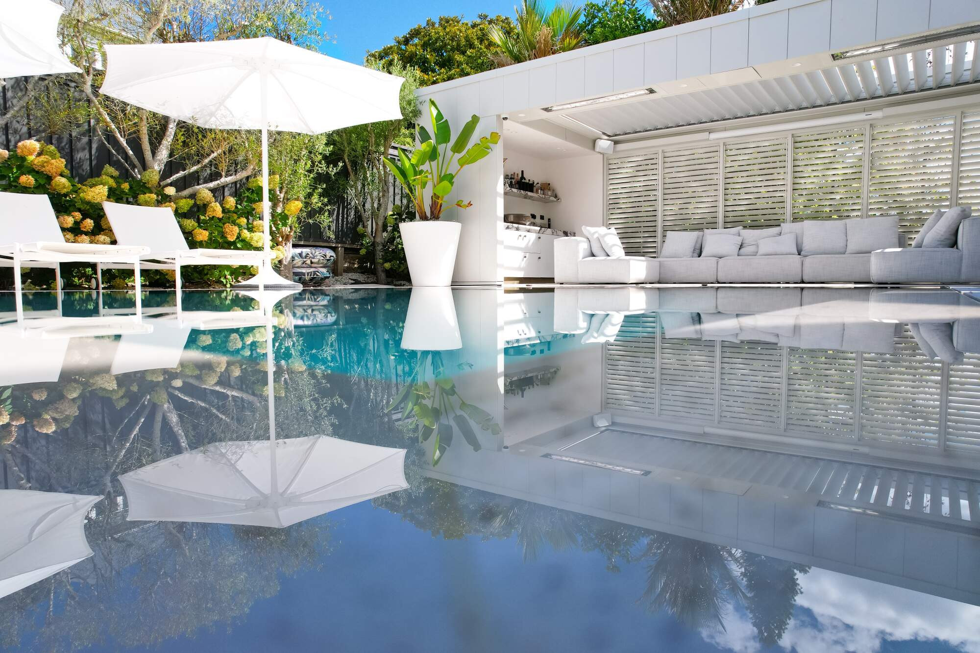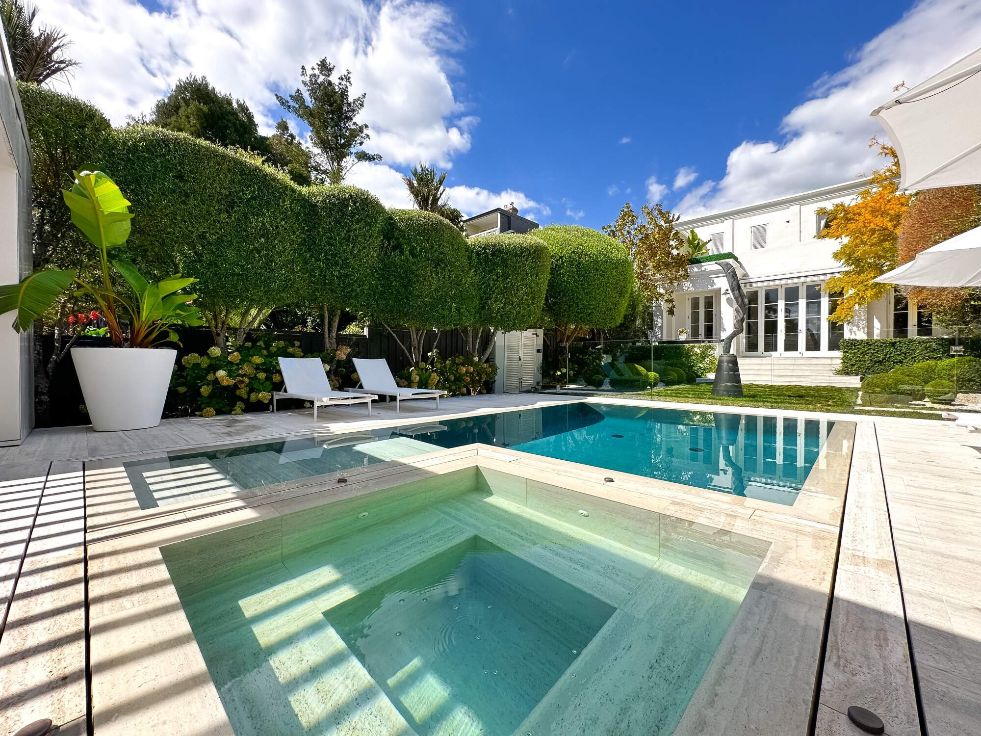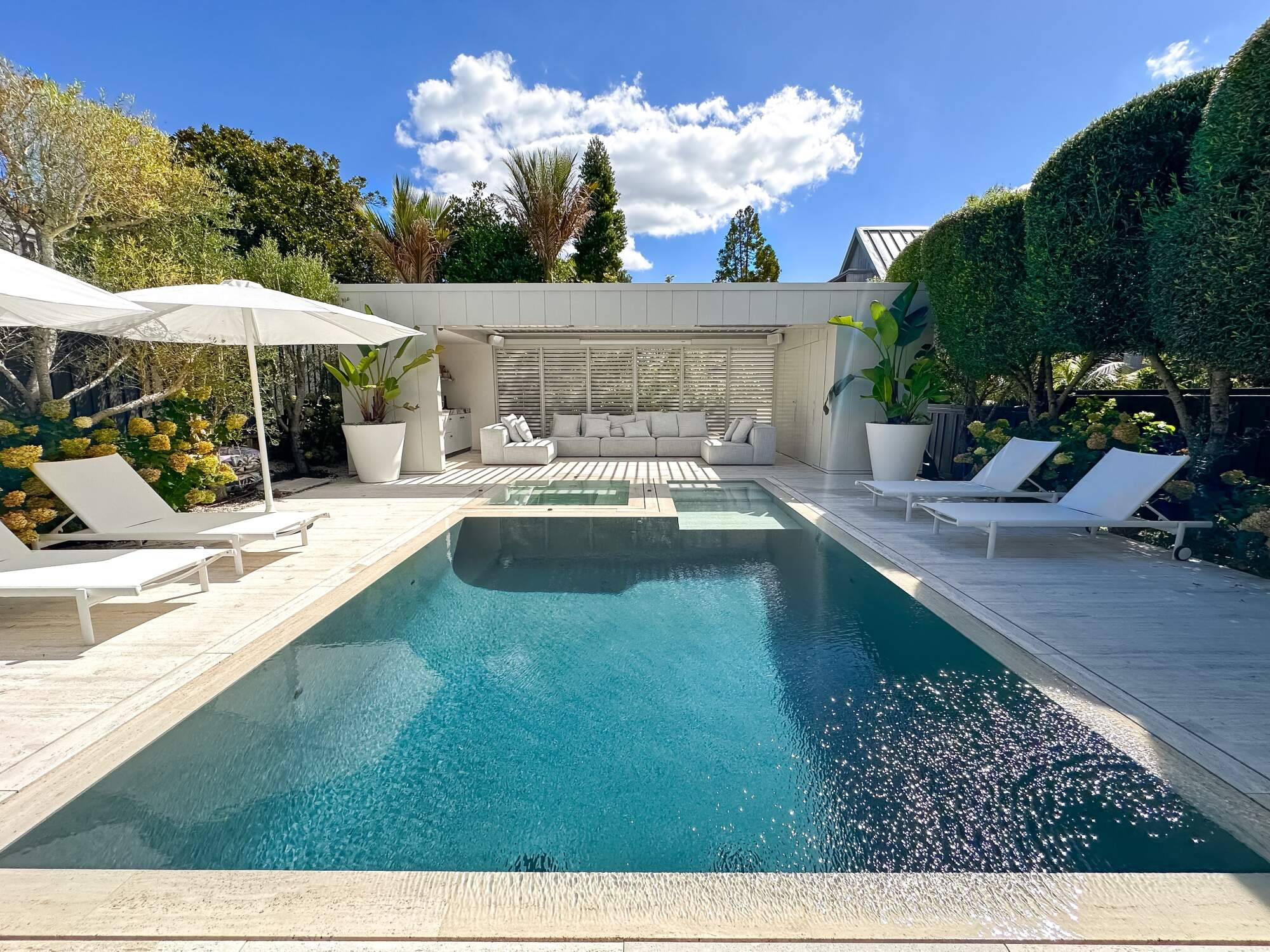 This exclusive hideaway in Herne Bay is simply stunning. Requiring meticulous structural engineering and solid construction methodologies this project is sophisticated in appearance with unparalleled structural requirements below. The intricate flush edge, with hidden dividers between the two bodies of water, this pool and spa is an unrivalled feature within an immaculate urban garden setting with manicured plants and trees, fully equipped cabana, and sculptural art.