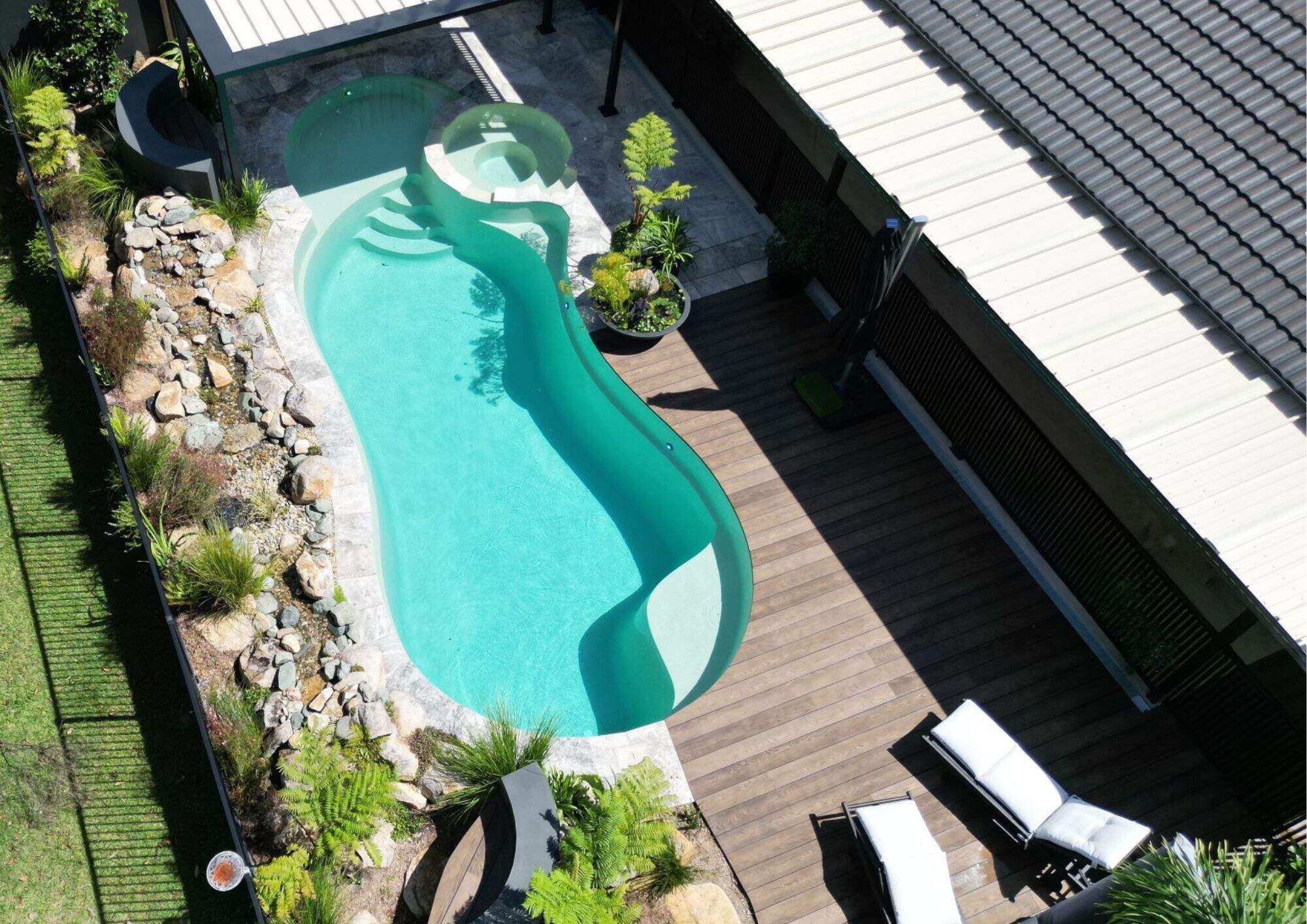 Presenting the 10m Allure in Diamond Sand: a beautiful freeform pool and spa combo in an island estate. With a striking rockwall water feature, it offers luxury and tranquility against a backdrop of golf course views.