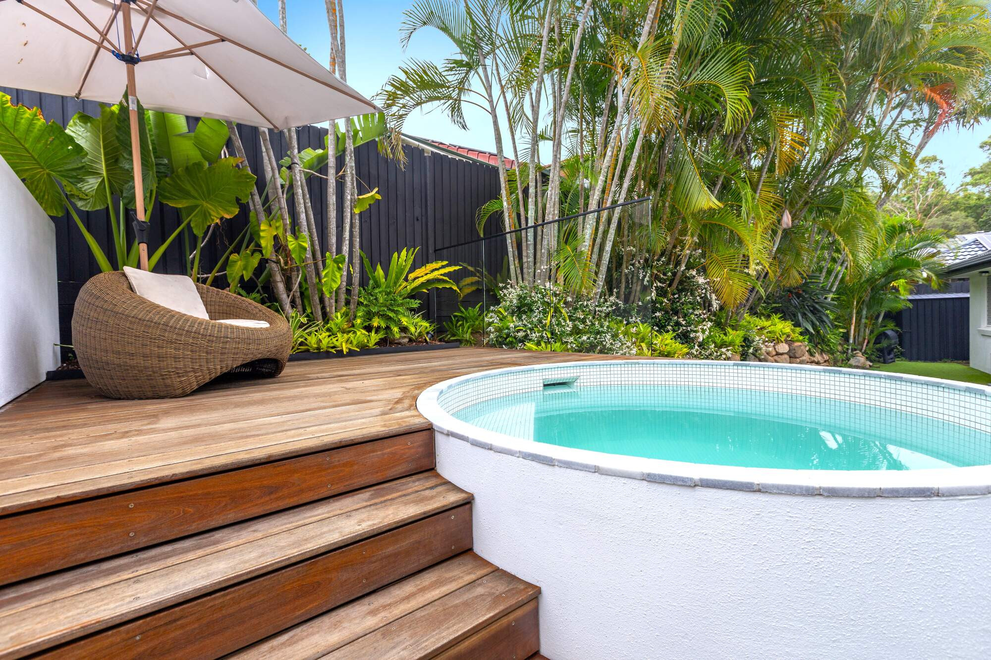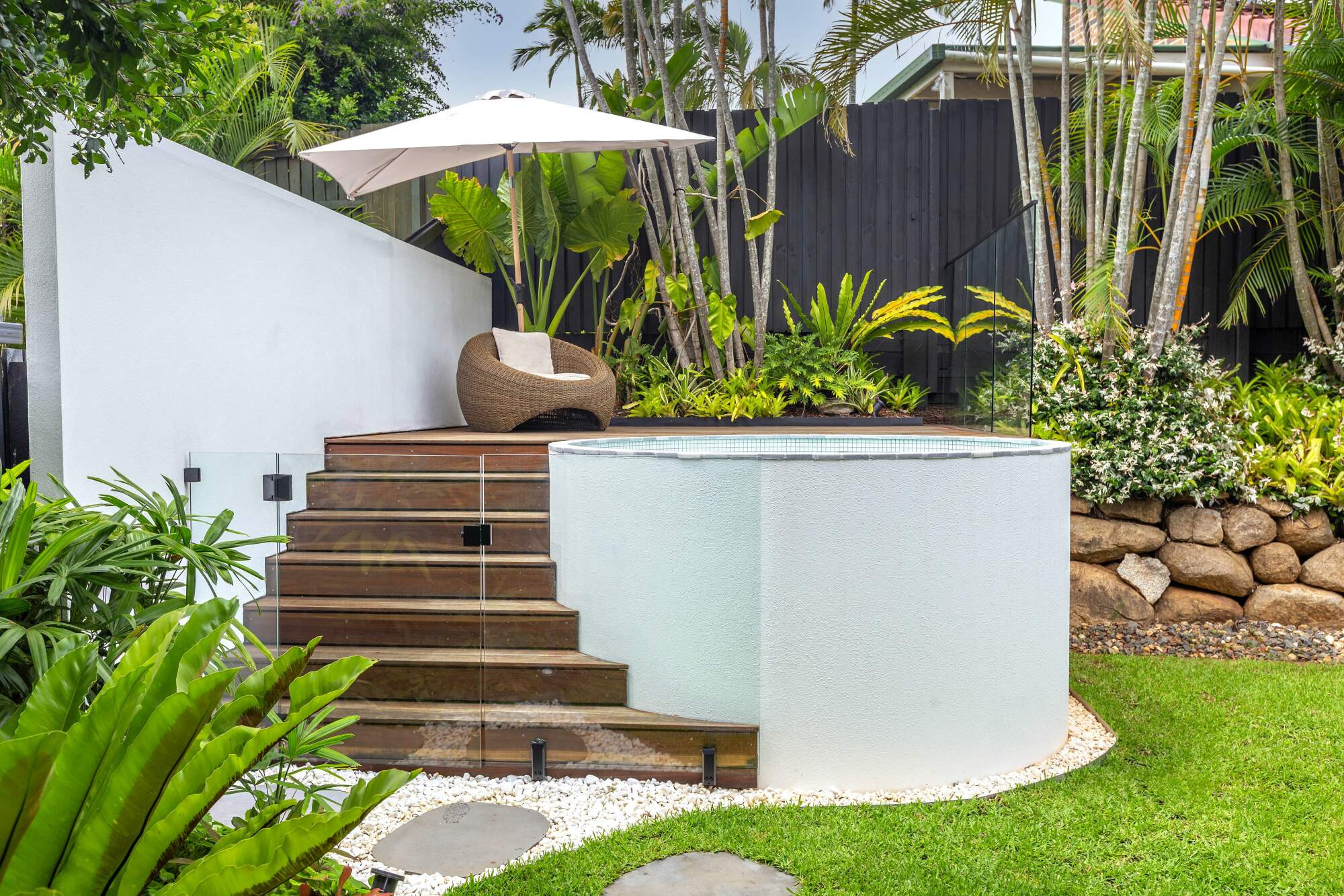 This stunning circular pool oozes relaxed sophistication and is both visually stunning and practical, using well-crafted, carefully chosen materials. The decking and foliage achieve a perfect balance between hard and soft finishes that effortlessly combine in elegant harmony to form an exceptional outdoor space.