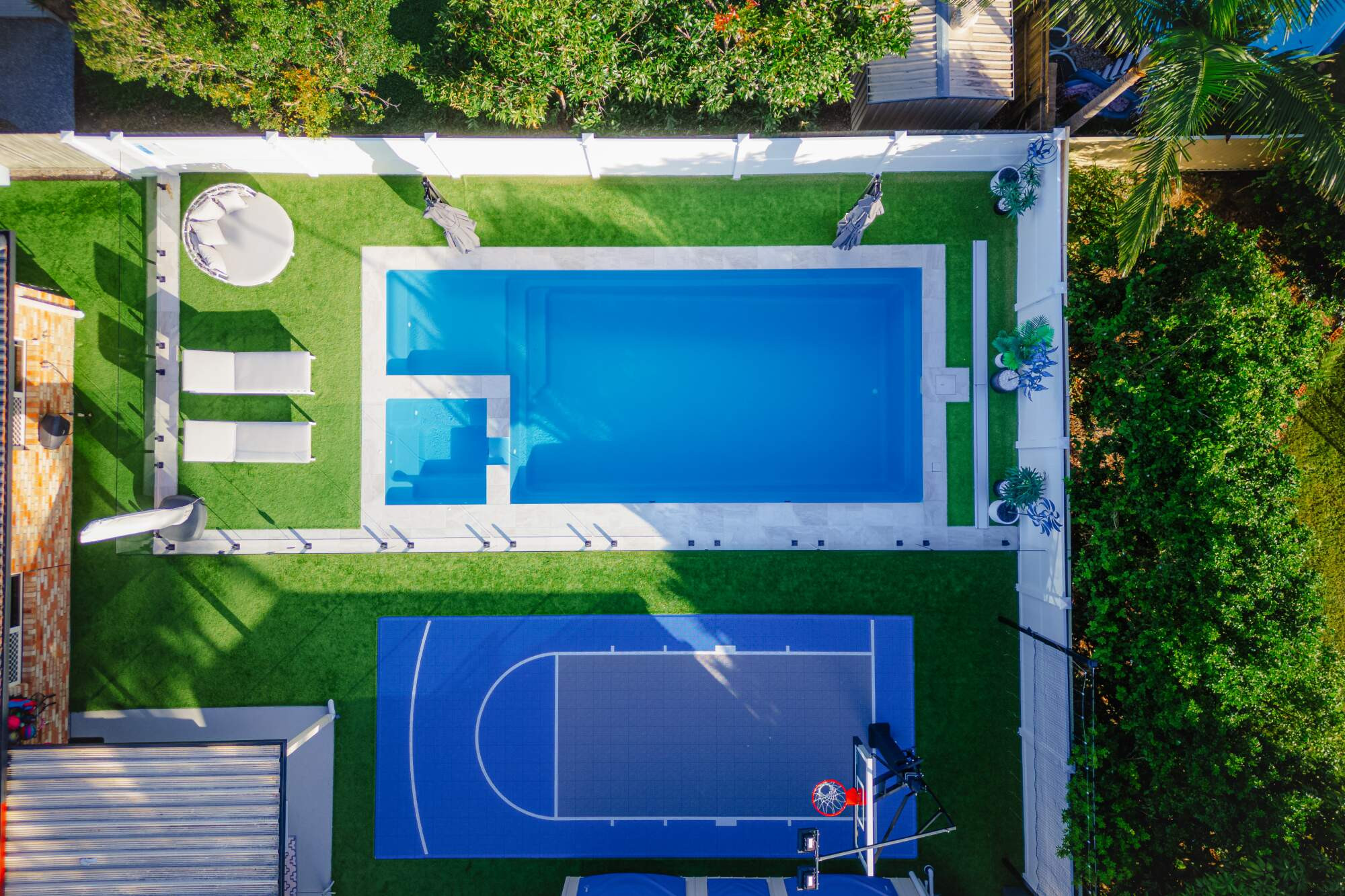 This 9.6 Manhattan pool & spa combo boasts it all. A shallow platform for the small kids, an uninterrupted main swimming pool area & a 6 person spa. To top it all off, the entire pool has been fully automated, all by the touch of a button on your phone. Adding a couple of oversized umbrellas & an underground blanket box, all surrounded by artificial grass... makes this backyard 'resort fantasy' complete!