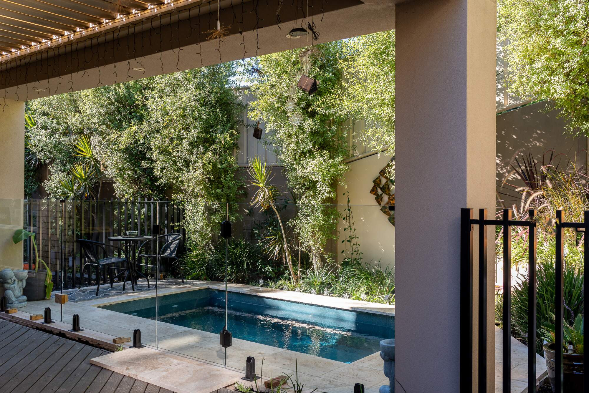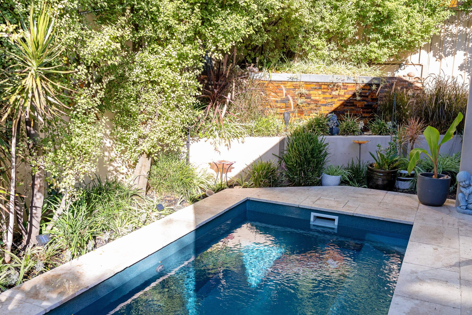 This sweet little courtyard pool exudes the charm of a private villa retreat. The build of this pool posed a unique challenge, with access limited to just one wheelbarrow width. Despite these obstacles, the result is nothing short of exquisite. Every detail of this plunge pool is a testament to dedication and craftsmanship.