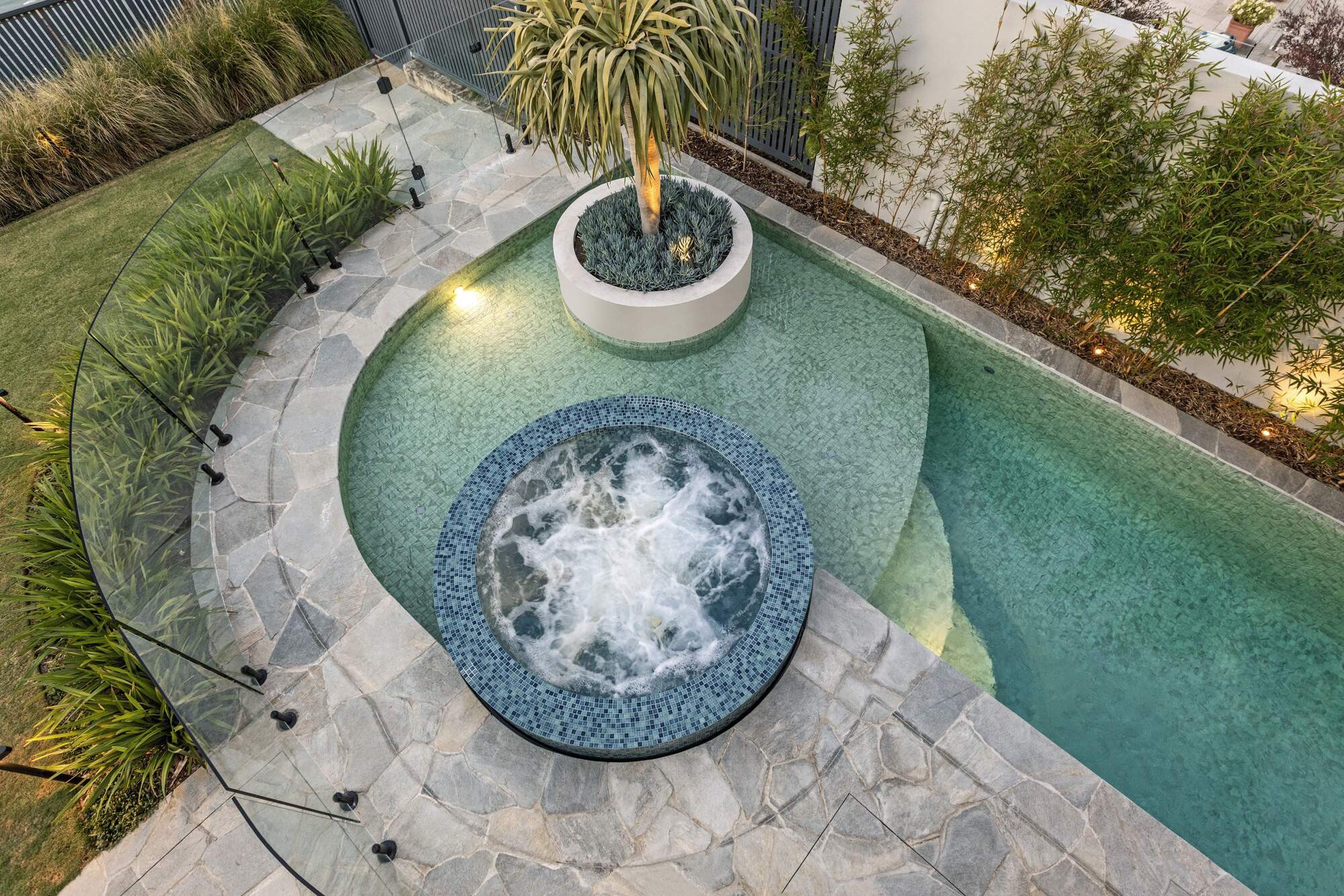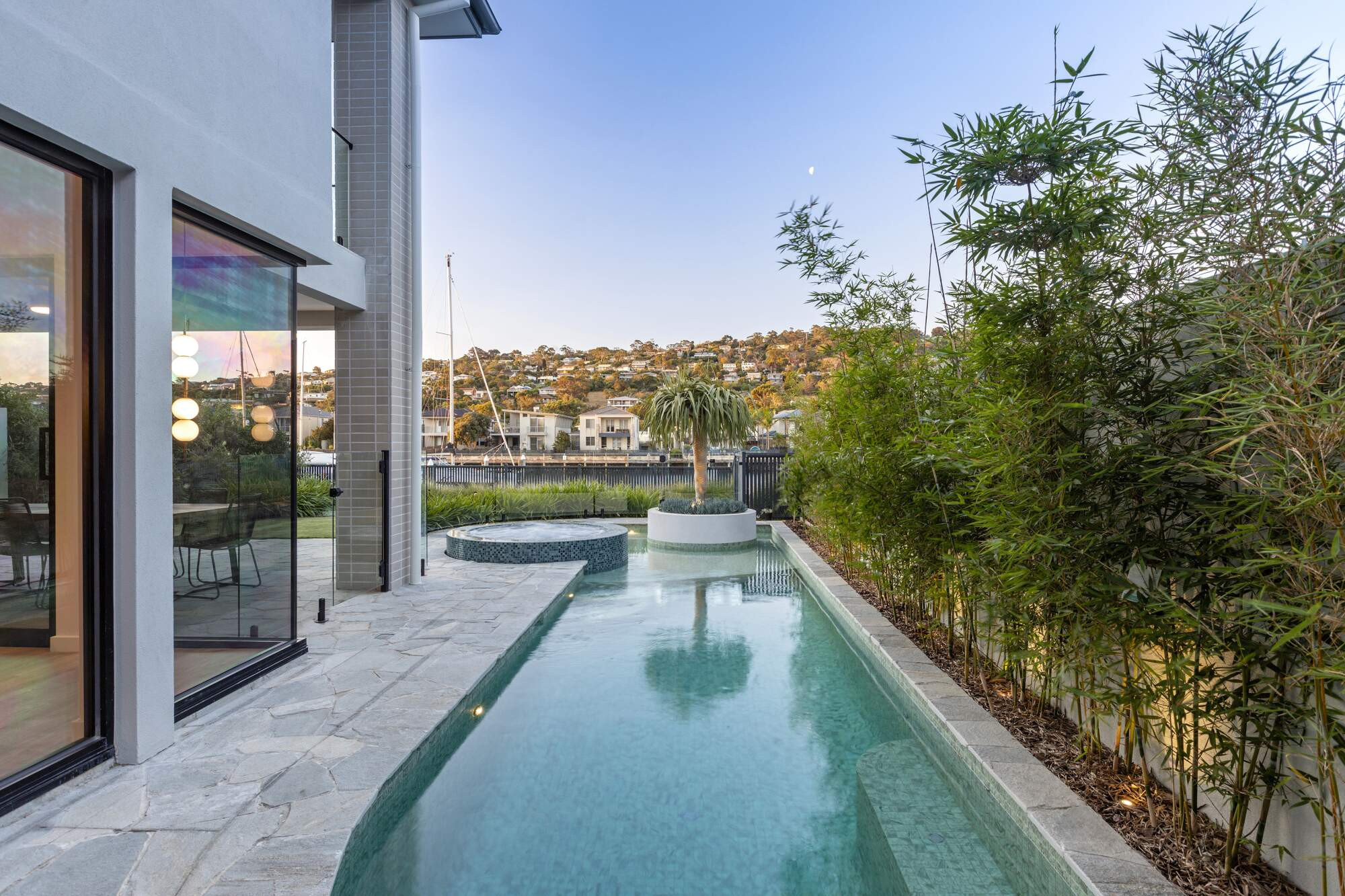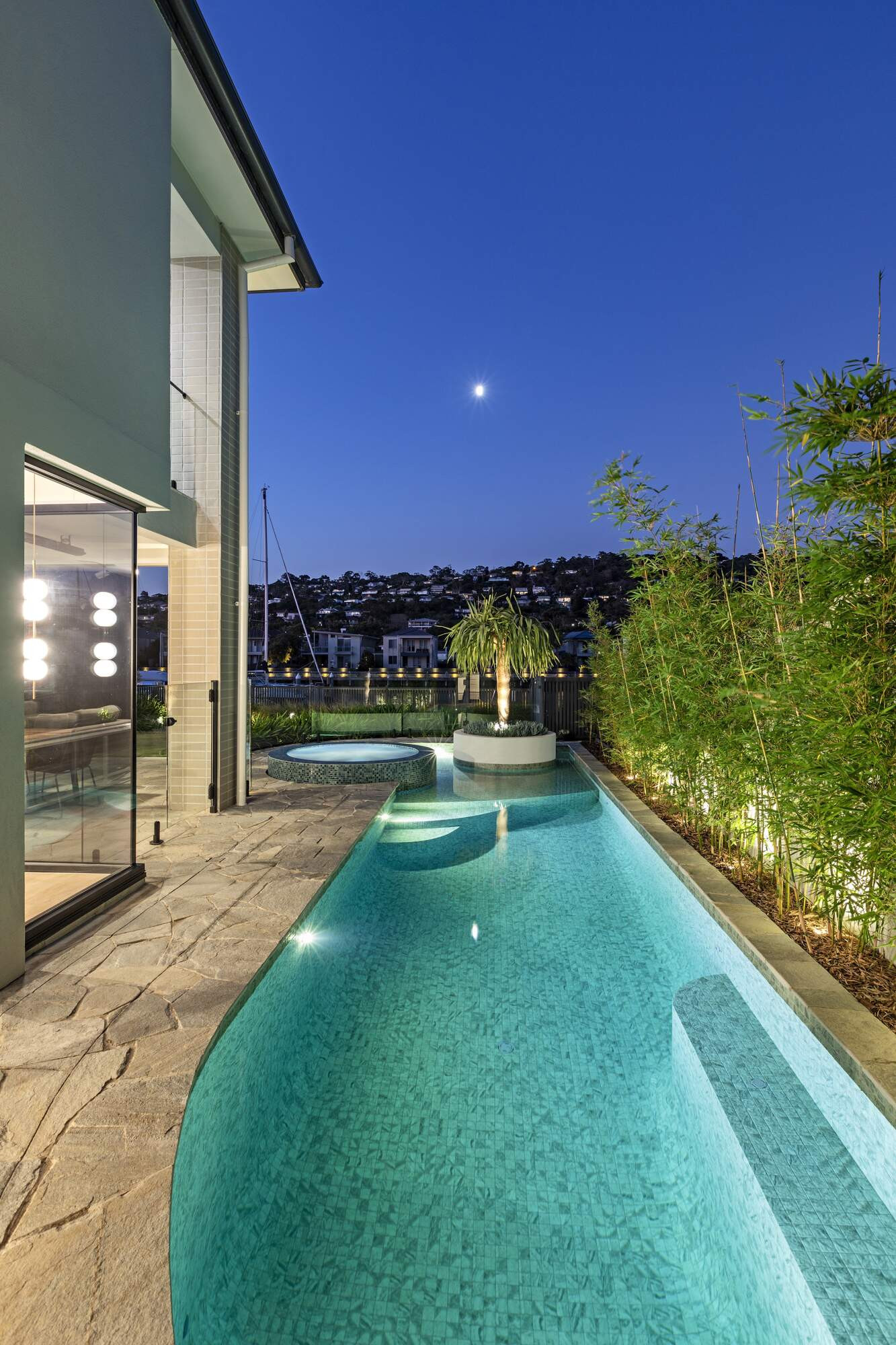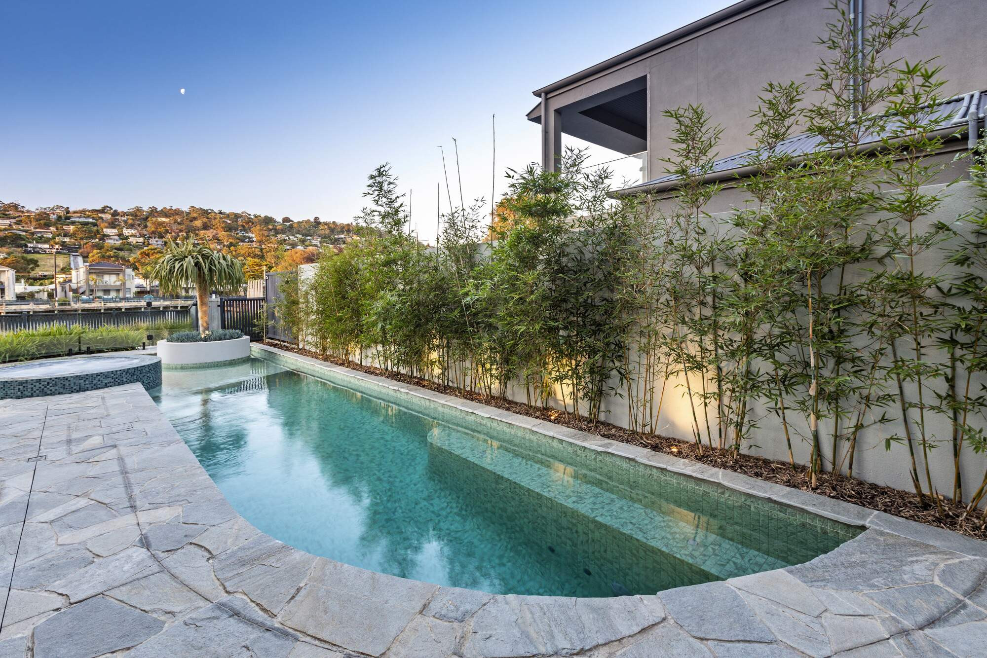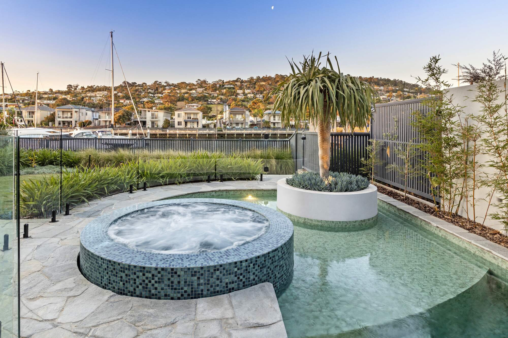Nestled in Martha Cove's harbor, this stunning free-form pool is more than resort-style luxury, it's a design marvel in perfect harmony with its surroundings. The planter box adds flair, showcasing ingenious space utilization. Enhanced by natural random stone and a complementing round spa, it embodies both beauty and function. Designed by our team, it complements the stunning modern home with the harbor as its backdrop, offering an enhanced swimming experience with its extended side length.