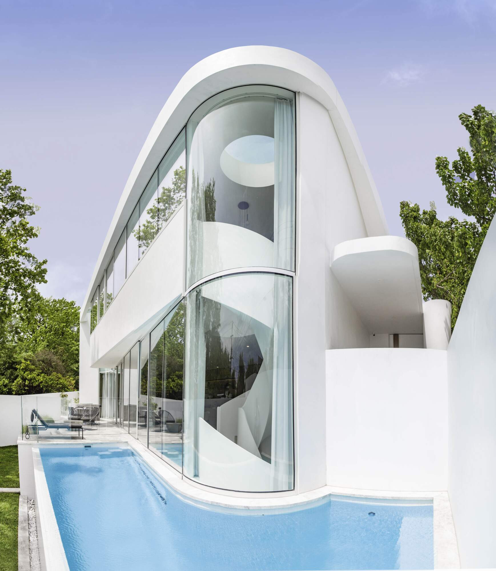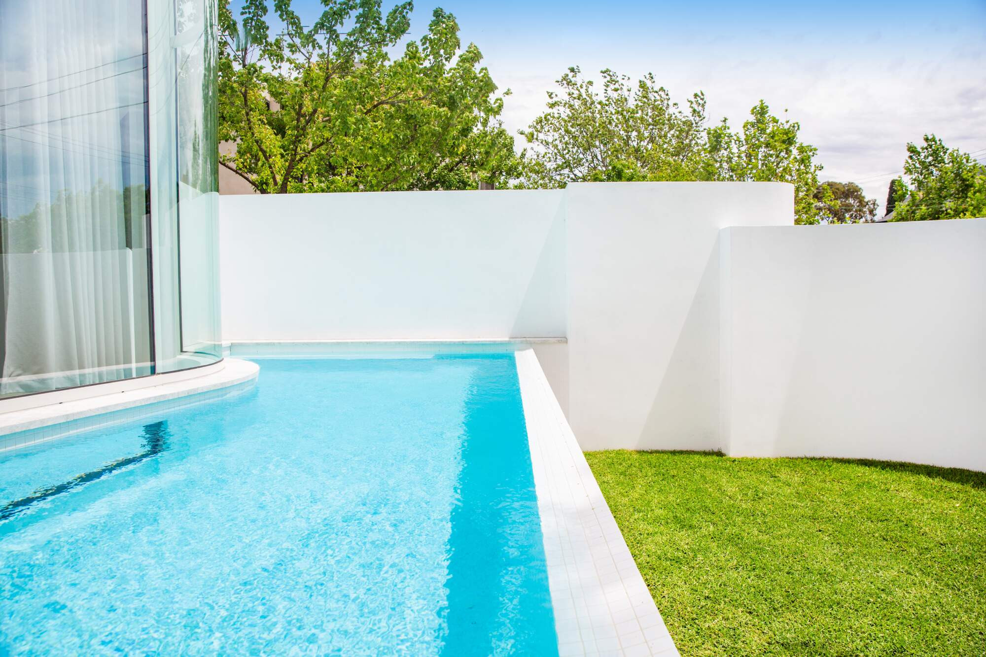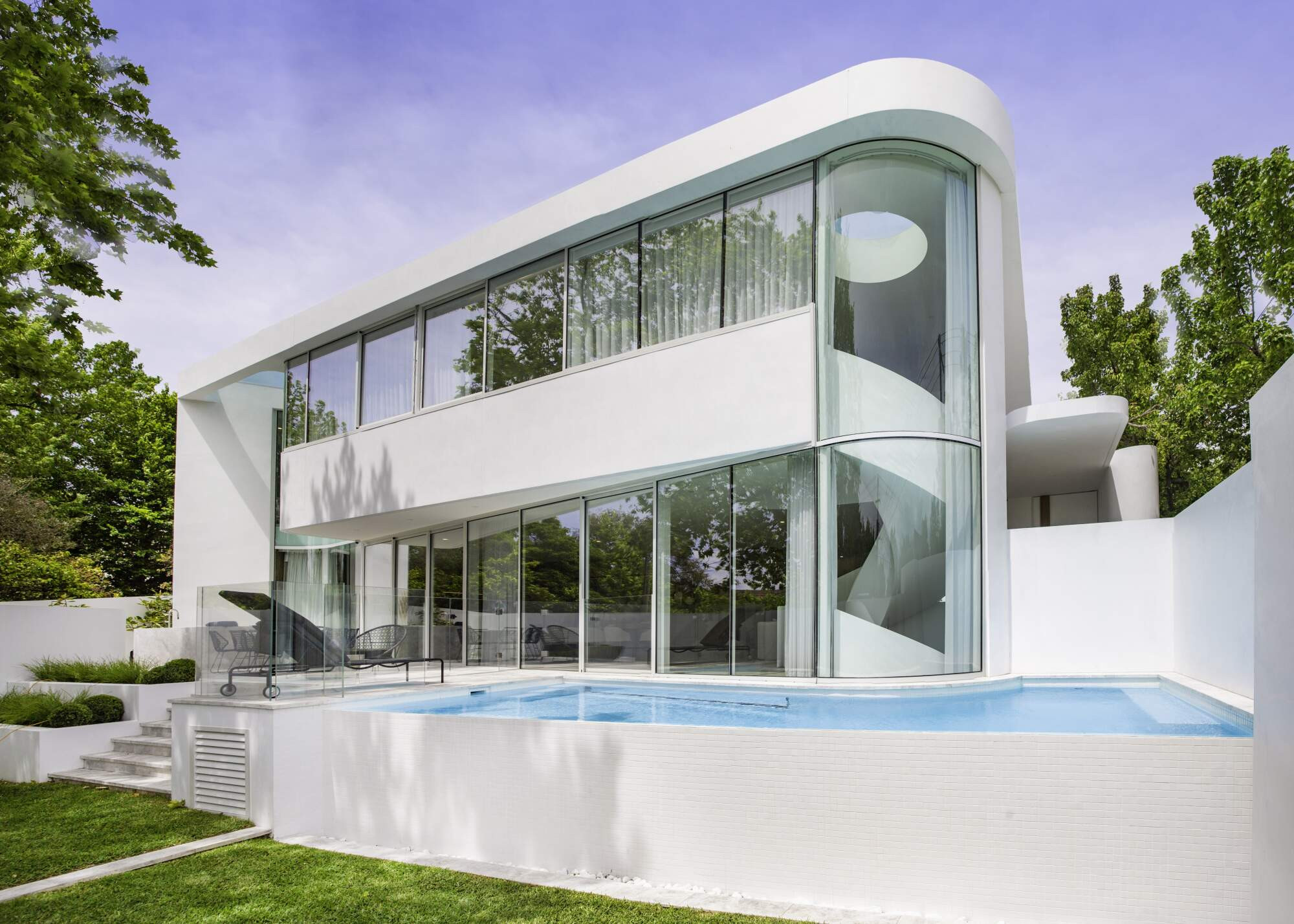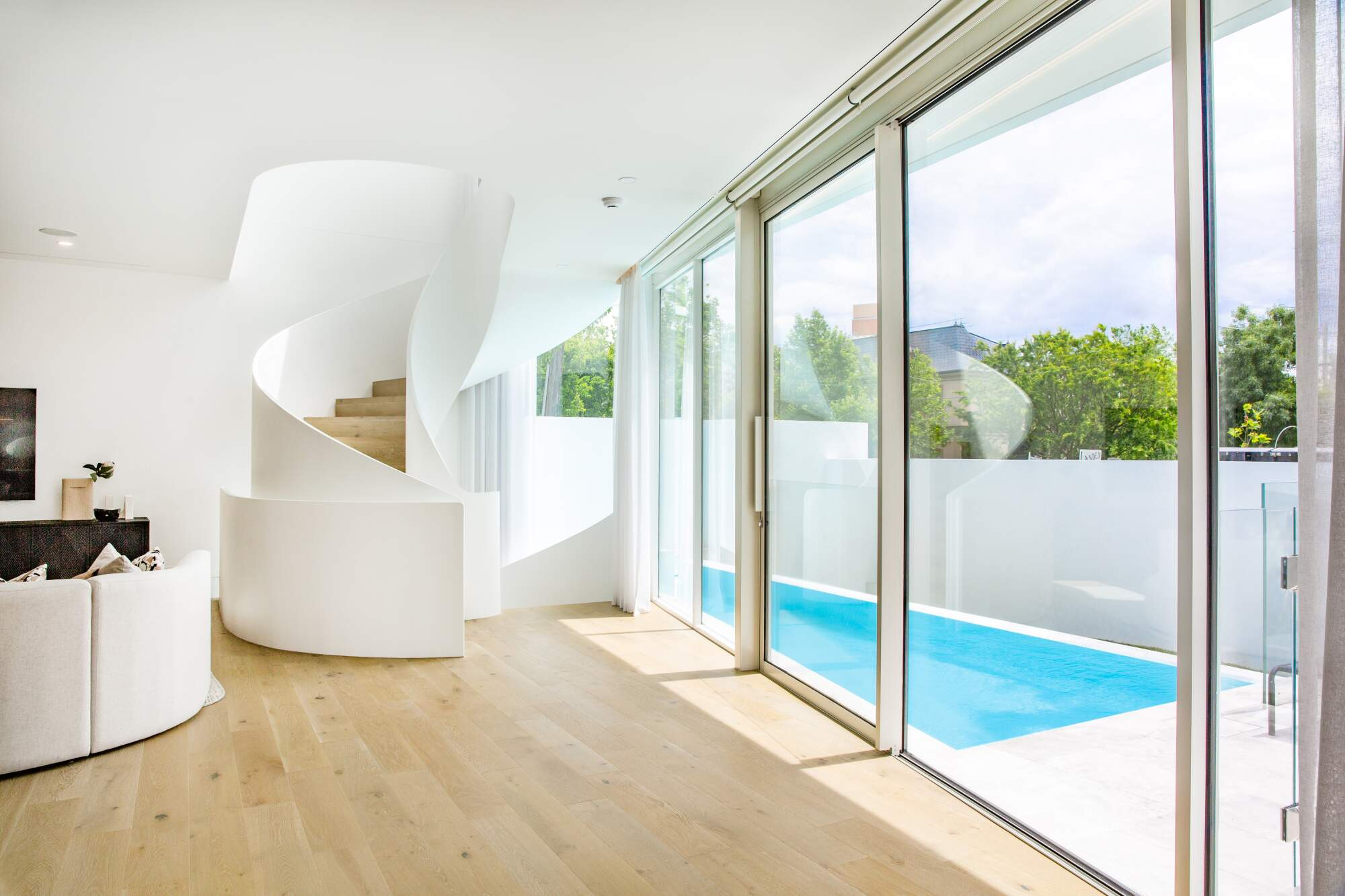 Take a dip into another dimension; ascend from the ground floor to the basement for a unique underwater experience. This crystal-clear fully tiled pool curves with the home, visible through expansive windows. Strategically placed in the front yard, it maximizes space while multiple heating sources keep the water cozy year-round. Featuring an infinity edge and an acrylic window, this design offers a perfect portal between indoor and outdoor spaces. Ready to level up?