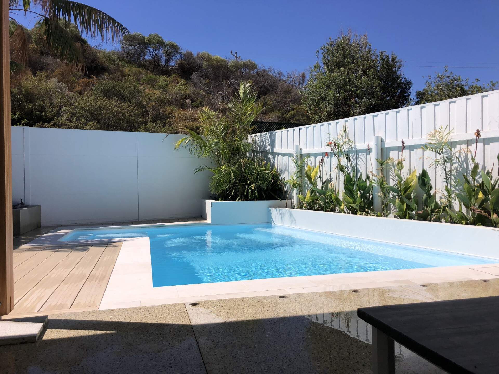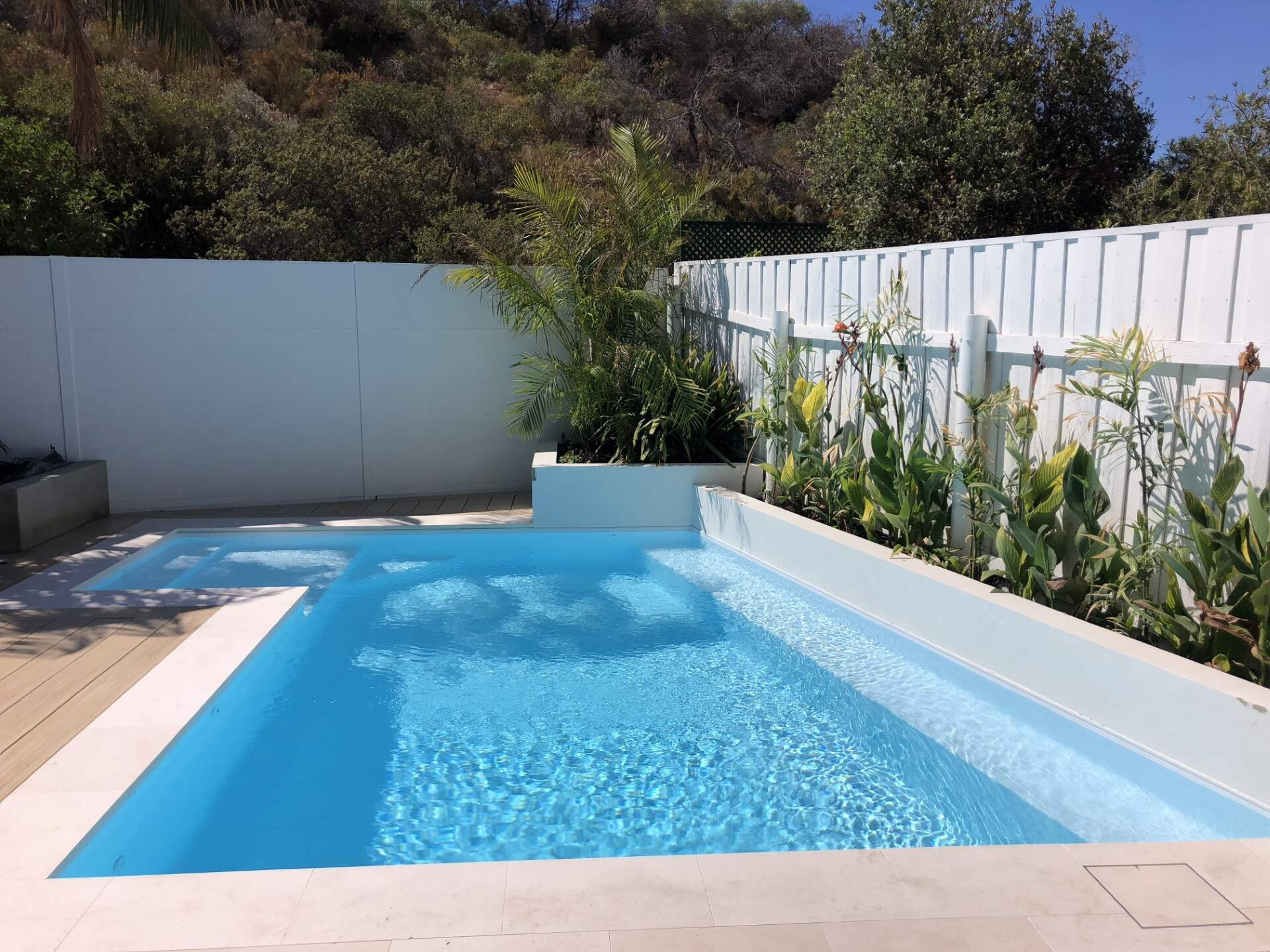 the request from this customer was simply white, so that we did, the dig was not challenging but required some permits from neighboring properties to gain rear access, the pool was then constructed following the boundary lines of the site to maximize the pool area in a unique shape, also requested by the customer was a swim out area for the young kids to grow in, the final white look was then achieved with white glass spigots and abgals new white haven liner
