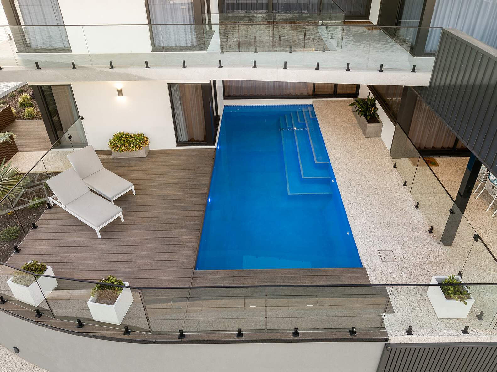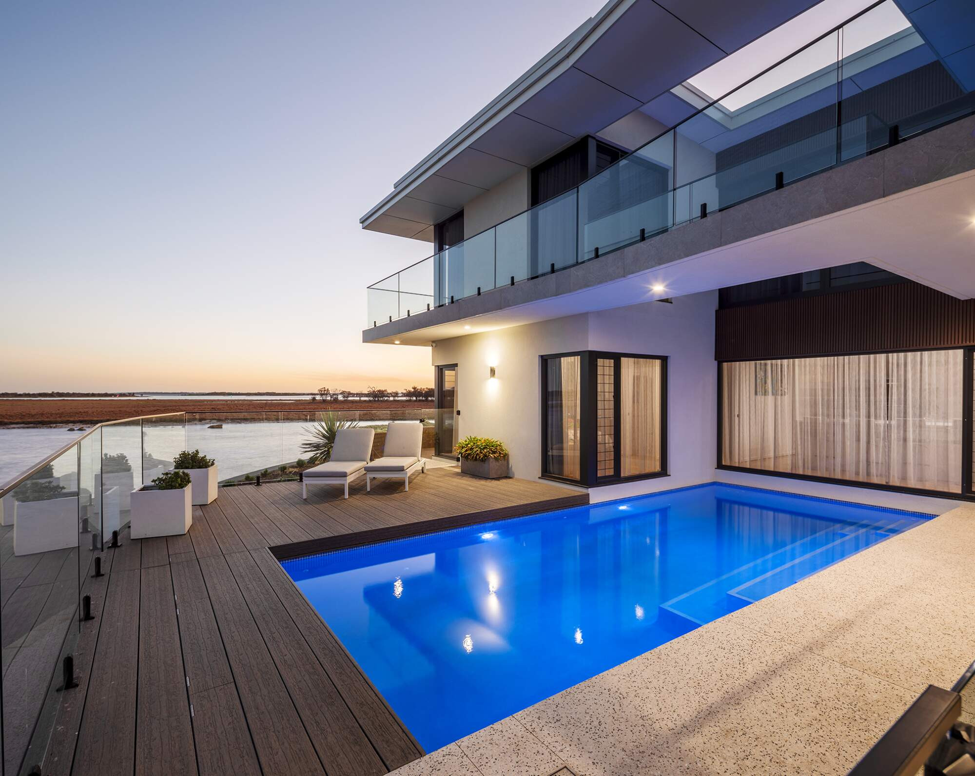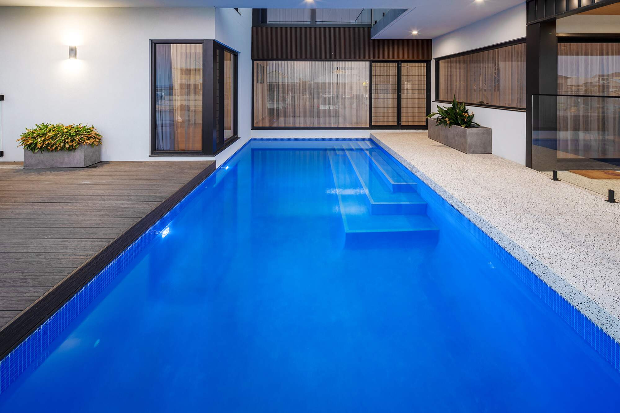 Nestled between the two wings of the home to protect from the canal weather, this traditional build is designed for the whole family. It features not a large set of step/ledges for entry and seating, along with a smaller set offering ease-of-entry. Finished with striking blue mosaics and duraquartz plaster, LED pool lighting and Viron pool technology, this one is simple yet very elegant and mixes well with the surroundings
