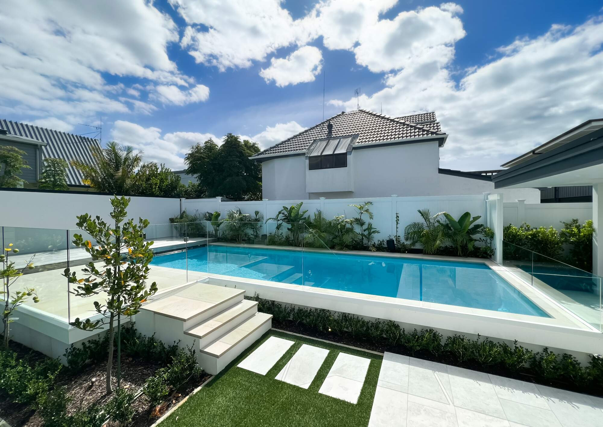 This entertainers back yard includes a purpose built pool, putting green, and an all weather outdoor living area with surround sound. The pool is in an elevated position connecting the outdoor living but also separate enough so swimmers have their own area, plus a hidden cover tucks away nicely under the deck! The lush green landscaping softens the space to create a relaxing/'holiday' feel. While the adults unwind and catch up over a few drinks, the kids play the pool.