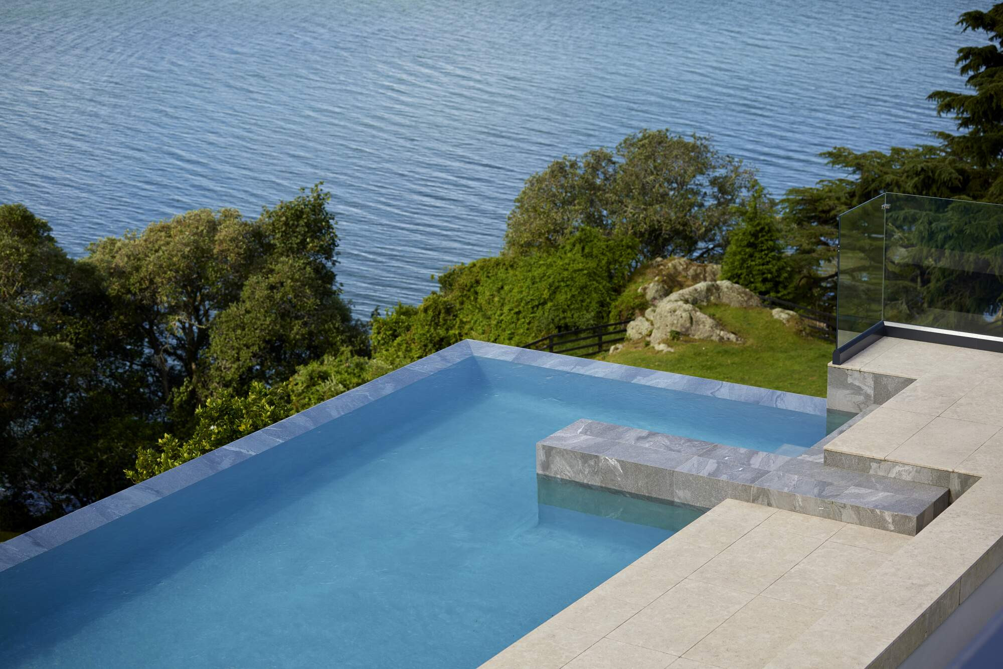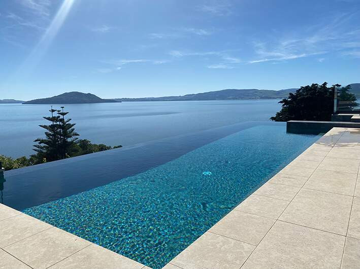Perched above the serene Lake Rotorua, this pool boasts a mesmerizing visual spectacle, blending seamlessly with the stunning water views and reflections to create an illusion of an infinite horizon. Our client's creative vision to integrate the steep drop at the edge of their property has resulted in a truly unparalleled sight. The pool appears to merge effortlessly with the lake, presenting an awe-inspiring scene where the water meeting effect is nothing short of dramatic.