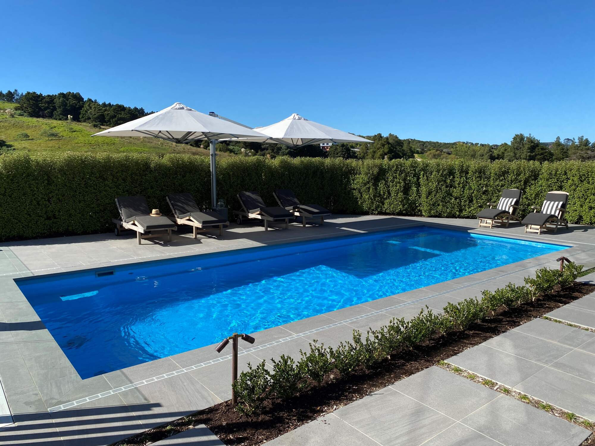 Maximising space in this urban backyard, the stunning 10x4m freshwater self-cleaning pool is the focal point of this relaxing oasis. Privacy, easy care, and 'enough room for all the family' were prerequisites for this busy client, and this space ticks all the boxes.