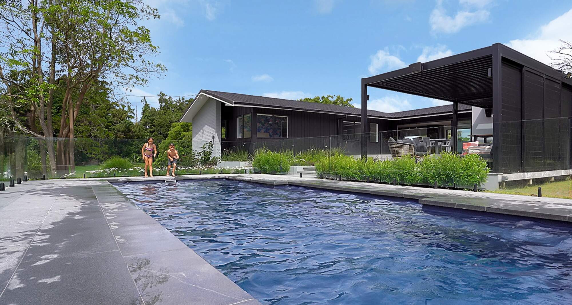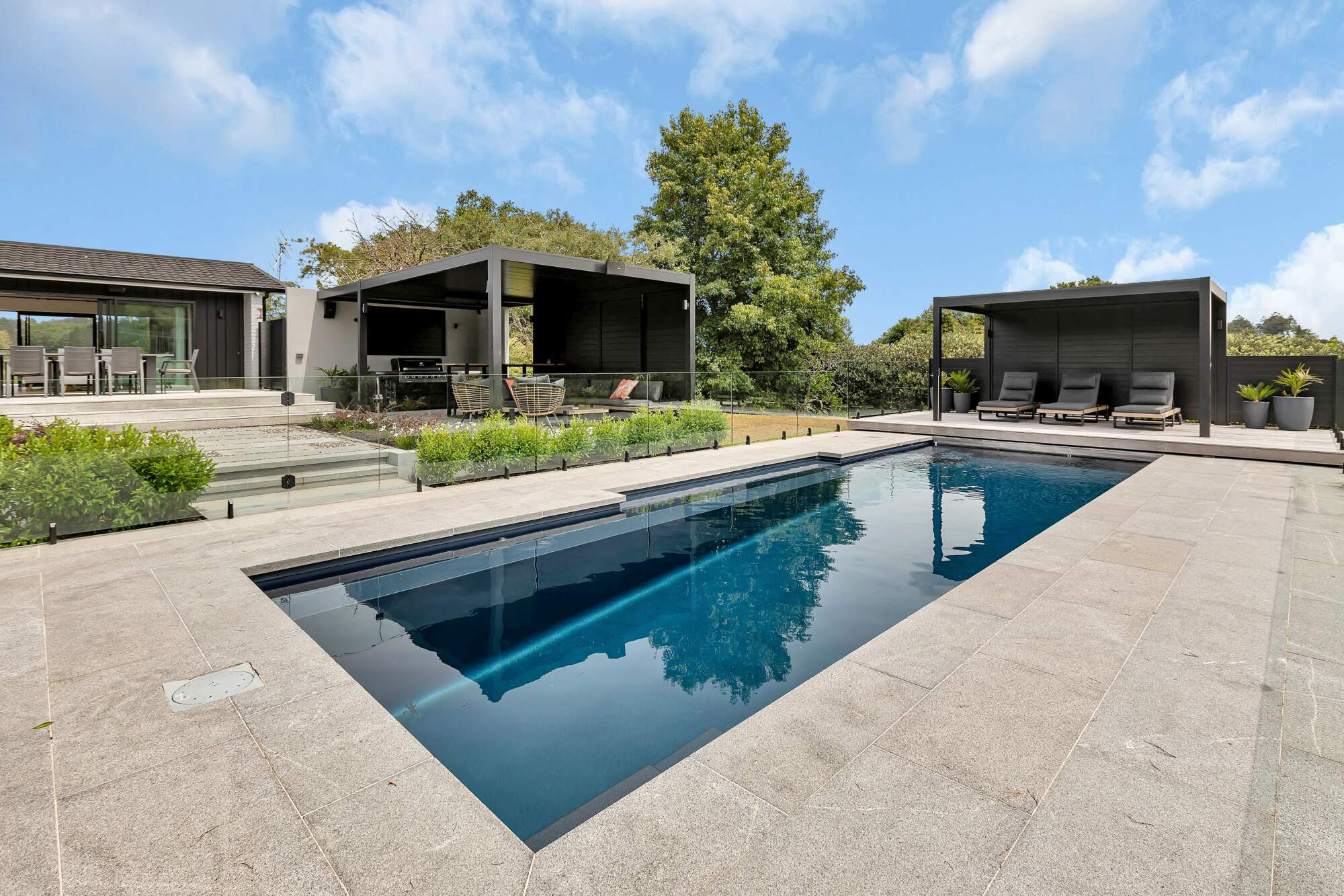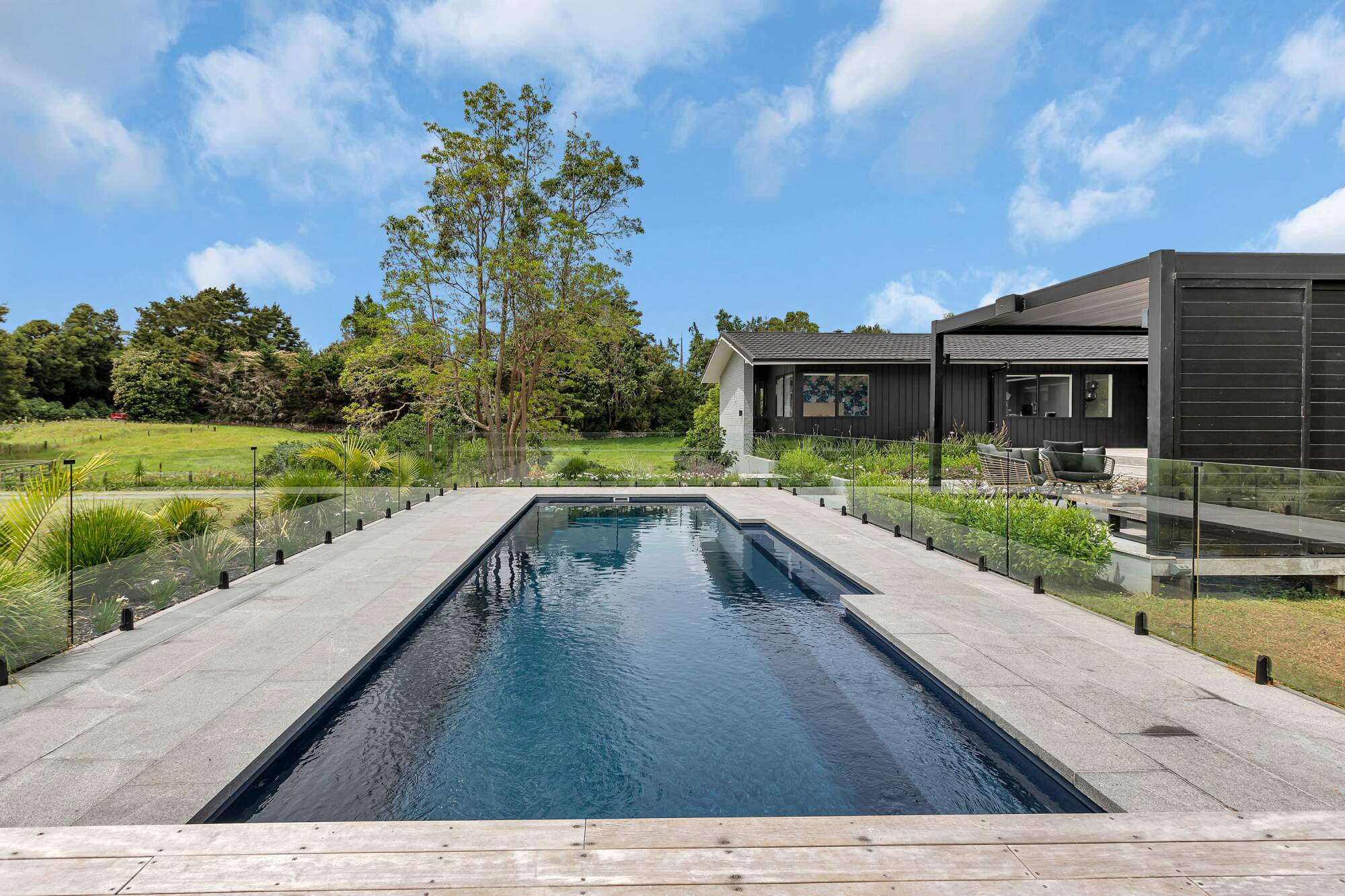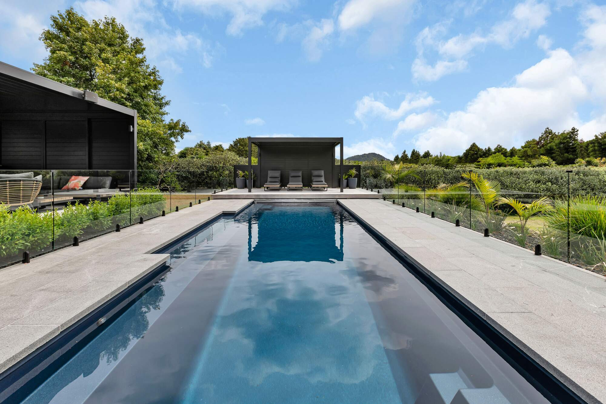 In a beautiful setting in rural Whangarei, sits this fabulous 11 metre pool in the deep colour of Blue Azurite, which compliments the surrounding home and outdoor entertaining area. The pool has become a key feature in the properties outdoor entertaining space and has made a huge difference to the owners lifestyle. A mineral pool, with robot cleaner and hidden pool cover creates a low maintenance pool, the addition of a heat pump means this young family uses their pool almost year round.