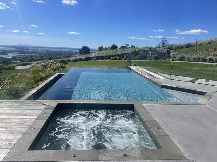 This project was all about creating a stunning pool and spa that would blend perfectly with the natural landscape and make the client feel completely immersed in the stunning view. Sustainability and energy efficiency were key features of this build as the property is semi-rural and has no town water supply. The pool and spa finishes were chosen to complement the features of the house and make it feel like a natural part of the landscape.