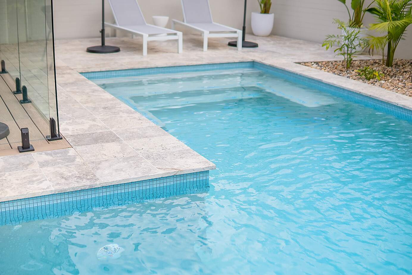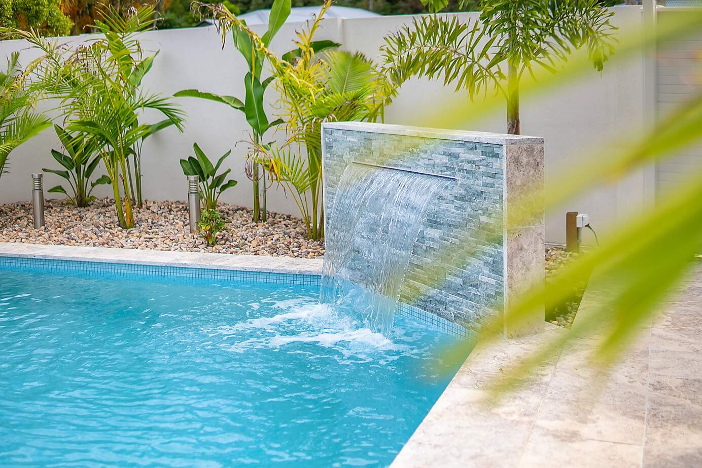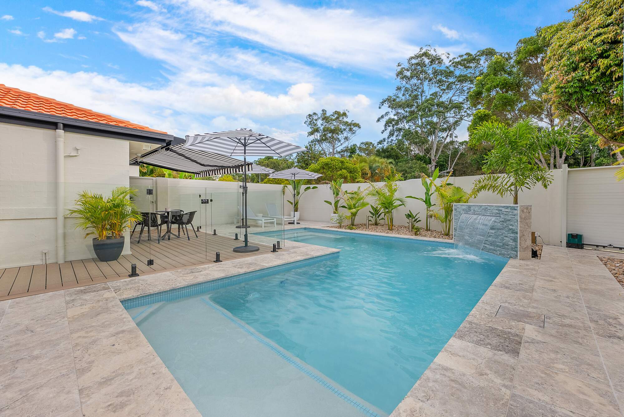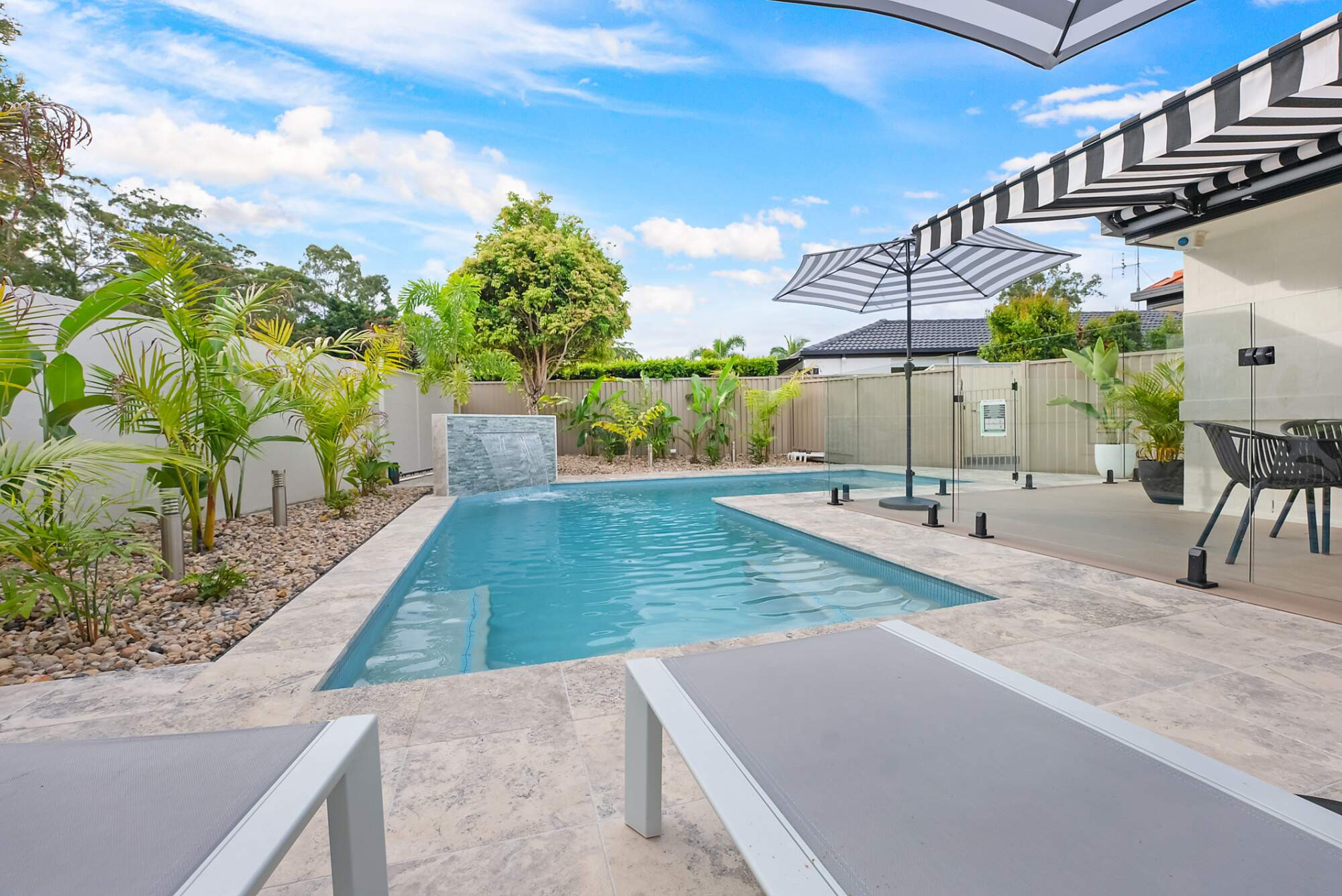 This timeless pool with a classic white interior accentuates the crystal clear water reflecting the sky. An exquisite stone finished water feature, silver travertine surrounds and monochrome accessories create a high-class resort style vibe.