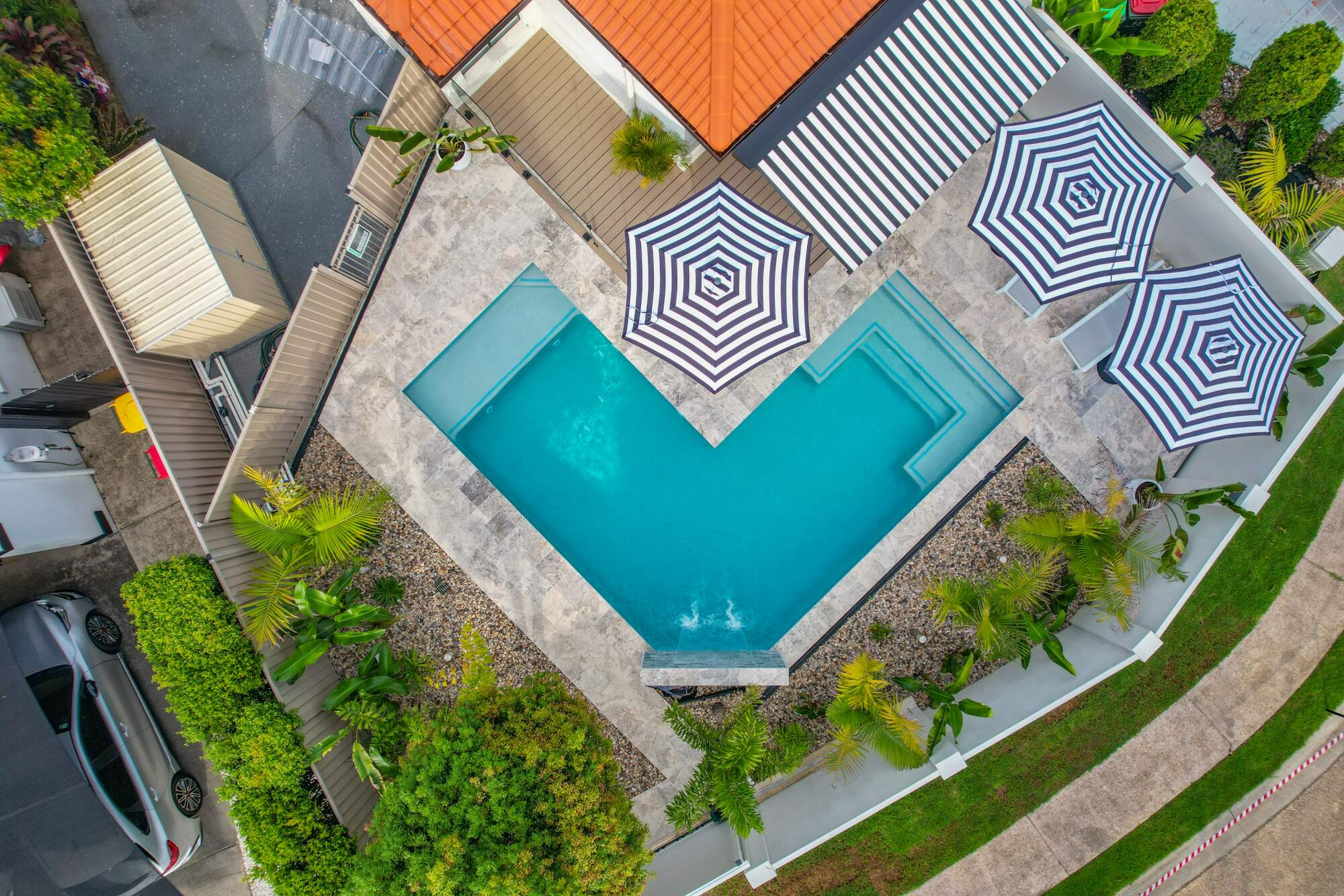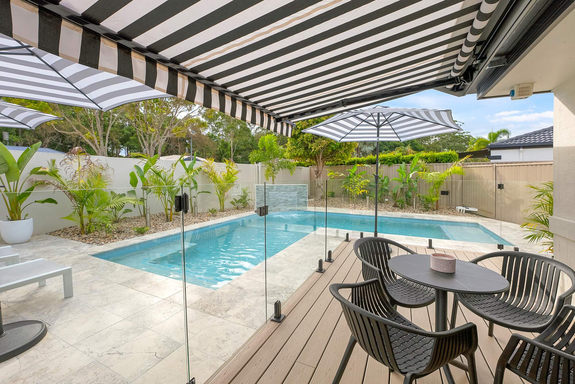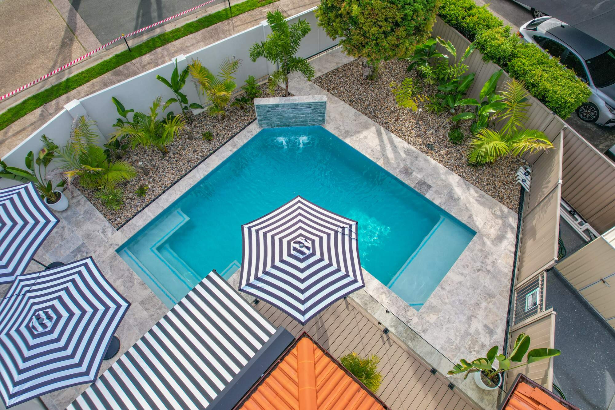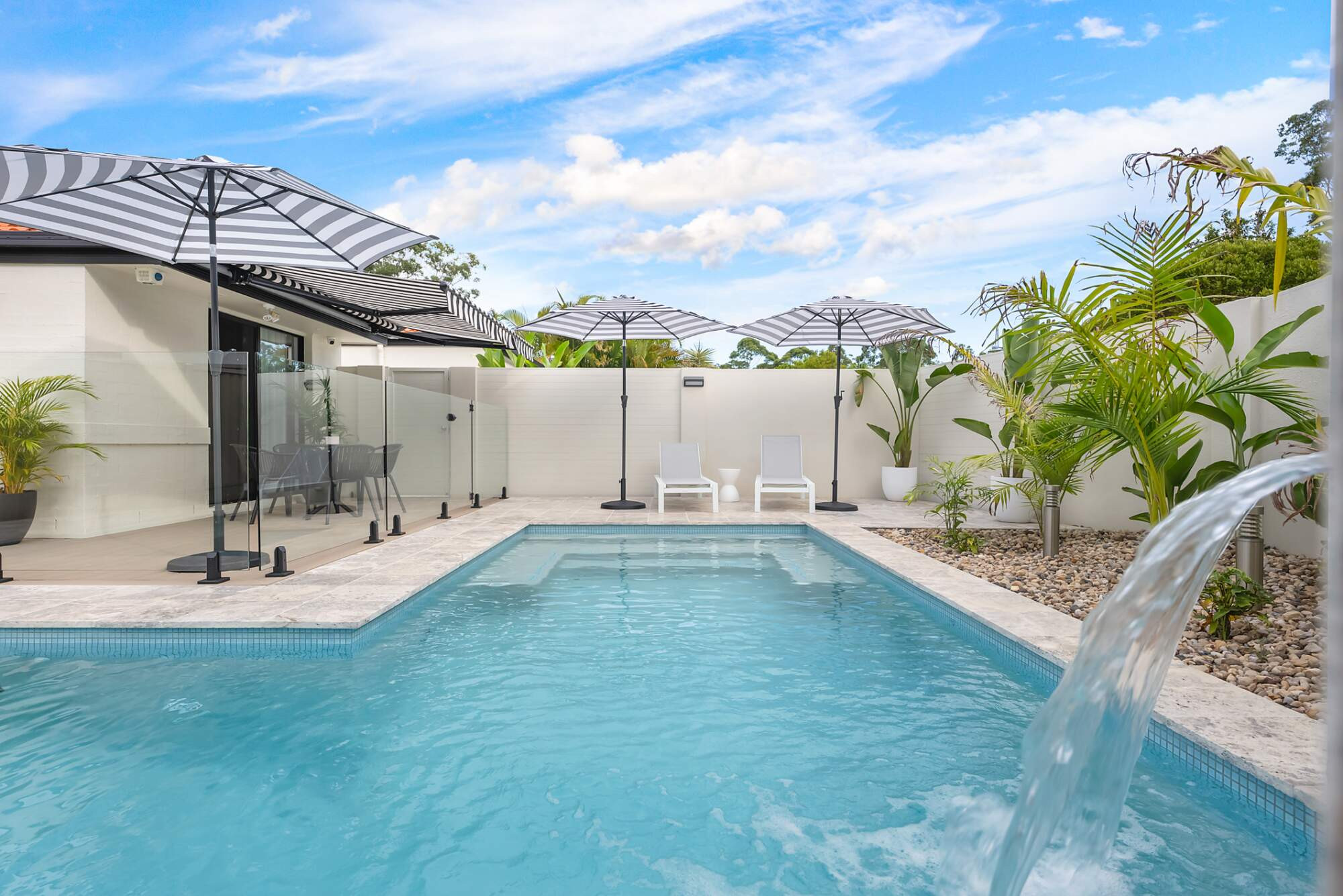 This timeless pool with a classic white interior accentuates the crystal clear water reflecting the sky. An exquisite stone finished water feature, silver travertine surrounds and monochrome accessories create a high-class resort style vibe.