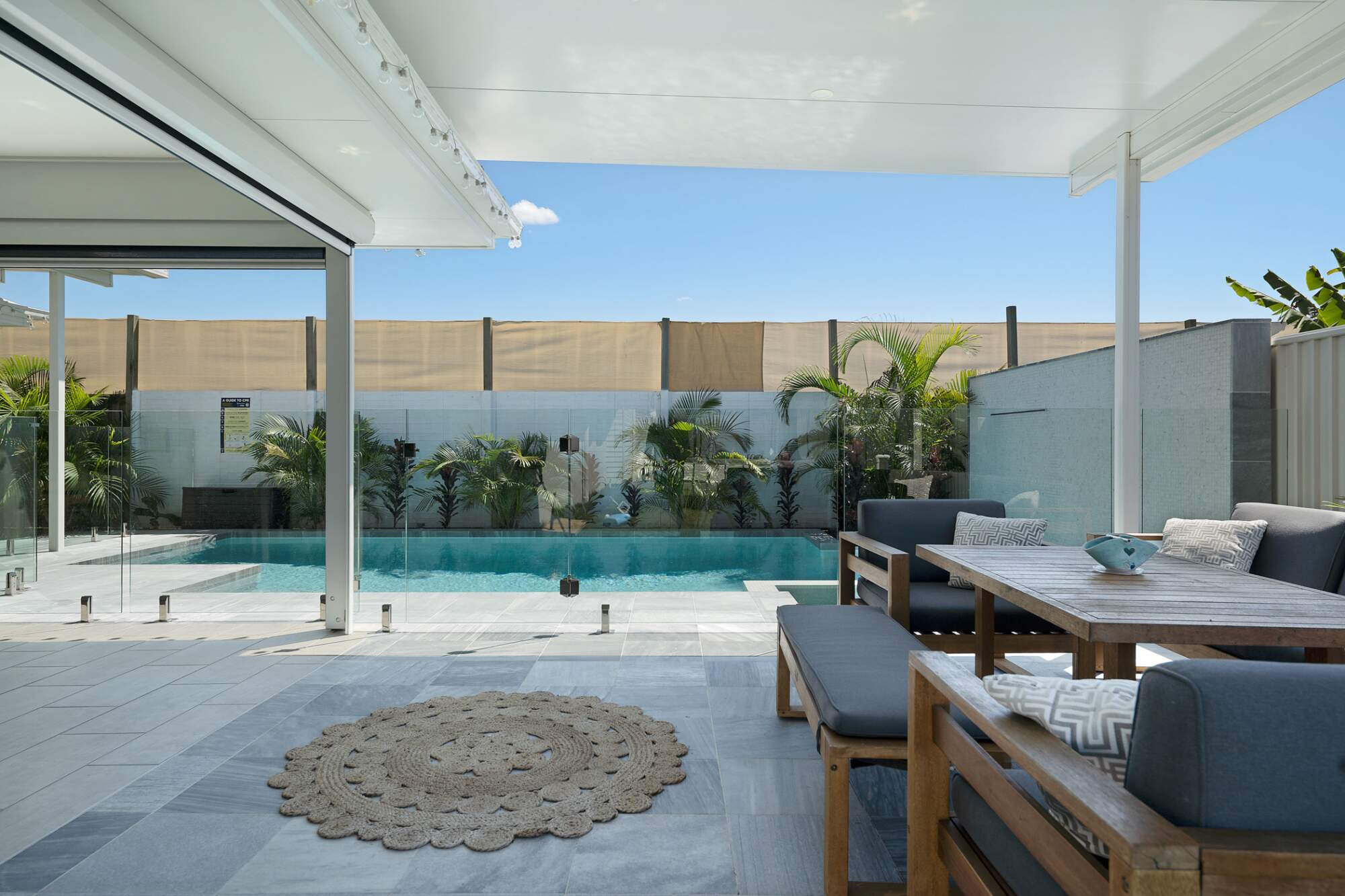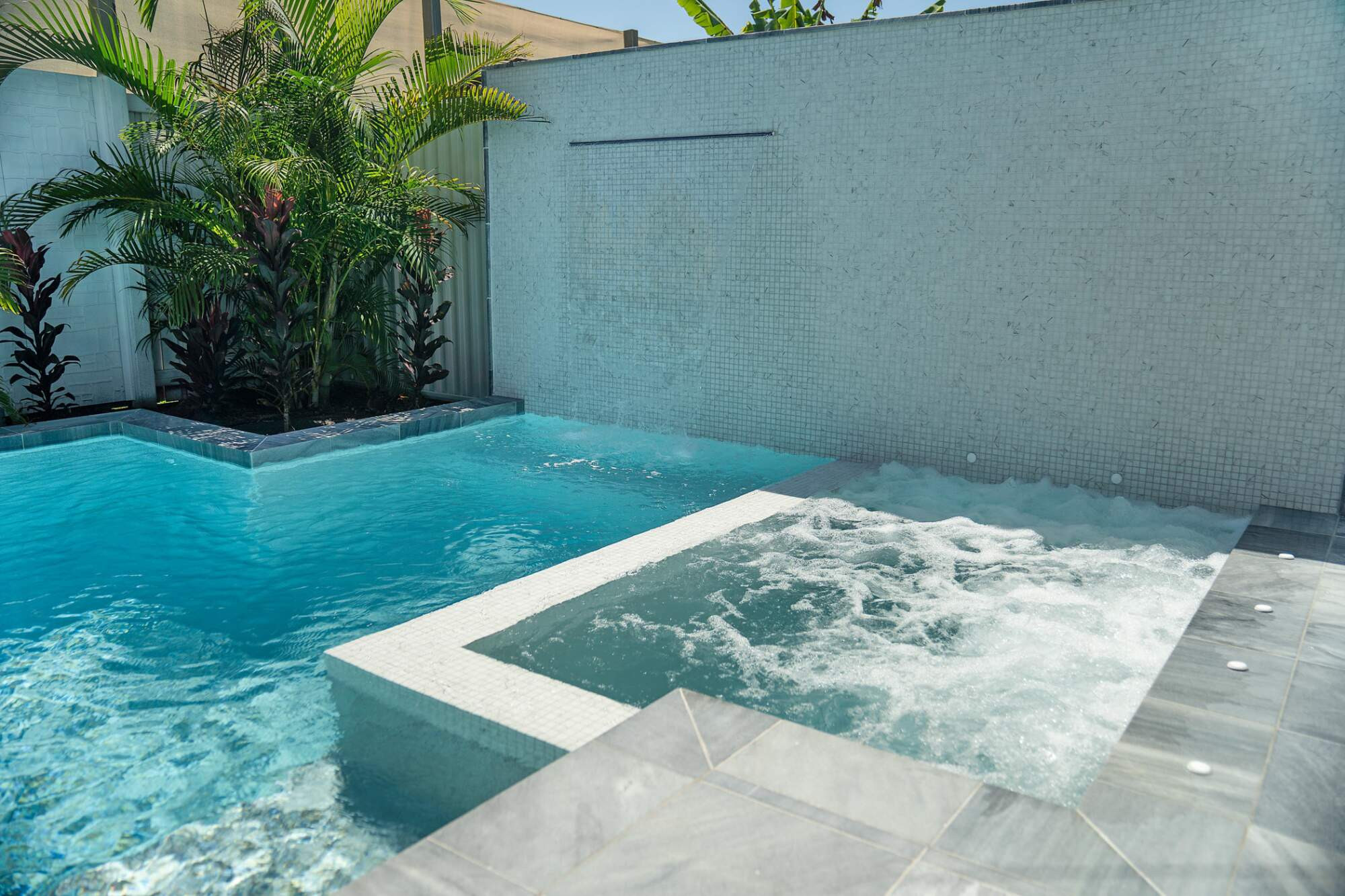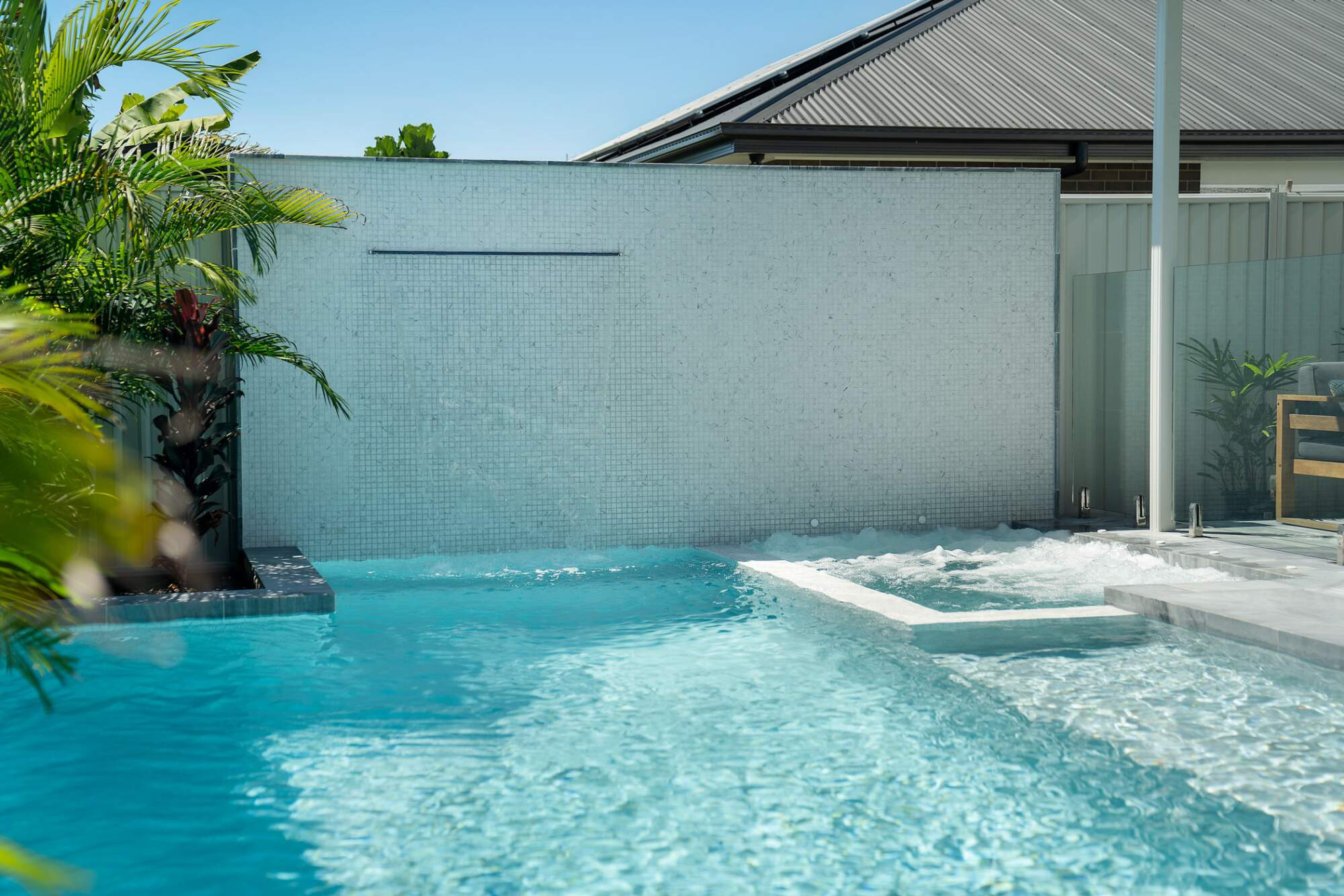 This sophisticated pool and heated spa allows you to soak up the views in a relaxing and soothing atmosphere. The cascading water feature wall adds a visually stunning element to the area and the sound of trickling water.