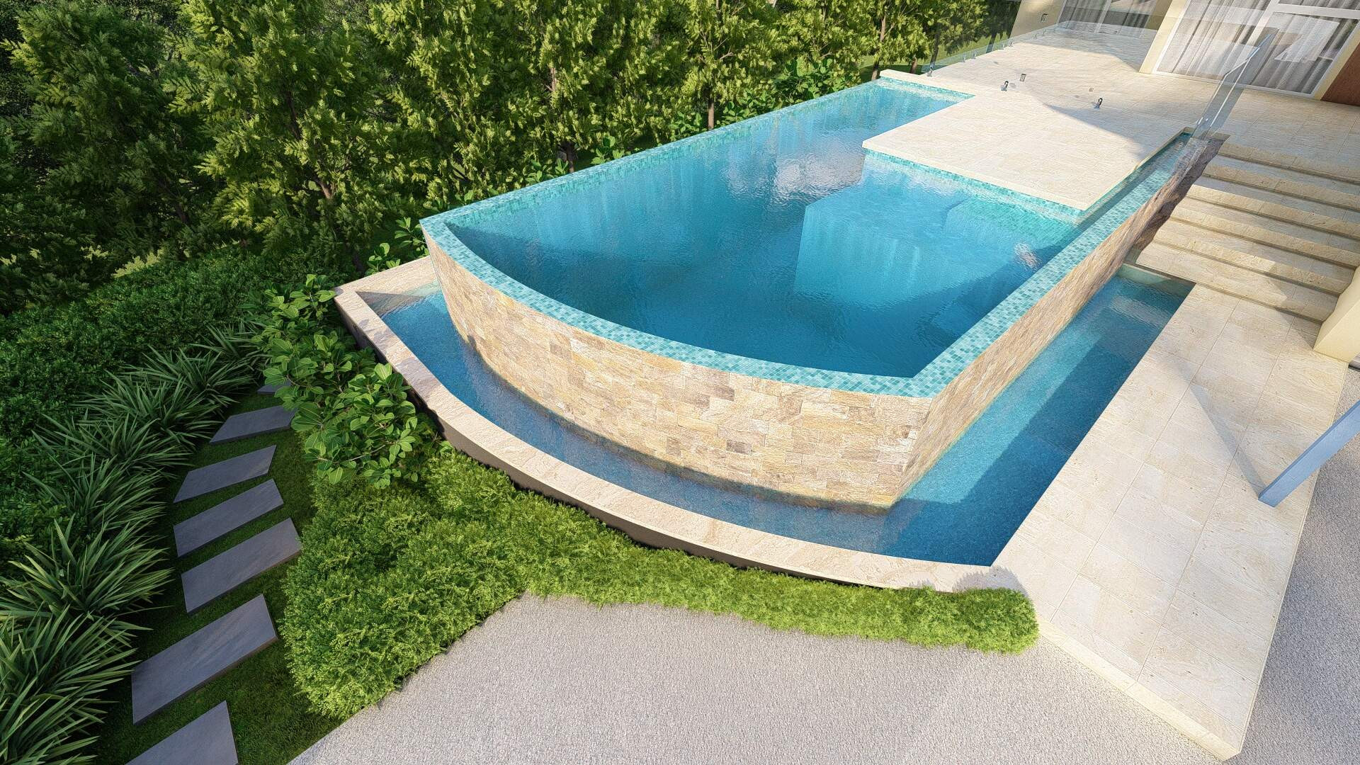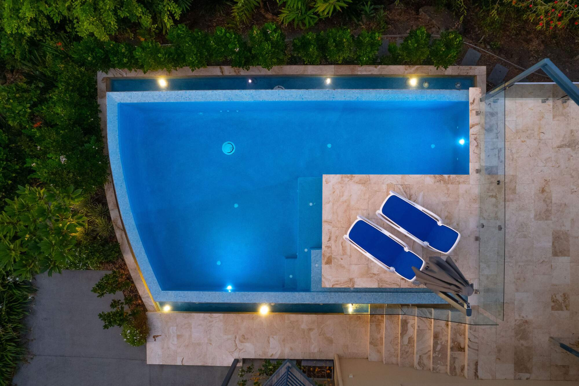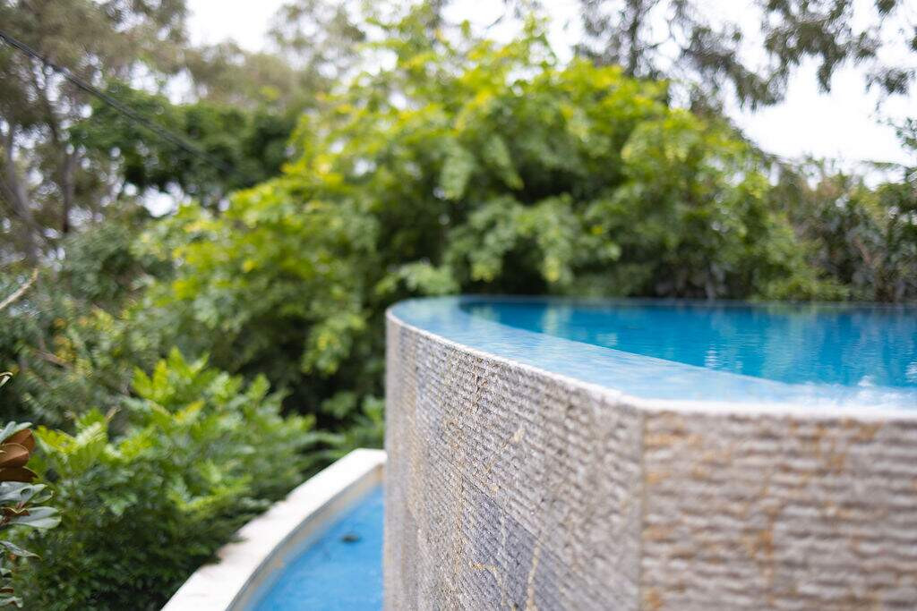 A striking architectural structure greets guests upon arrival to this Noosa Heads property. A challenging build on a sloping block , with 22 lineal meters of infinity edge and feature wet wall this pool Is truely unique.