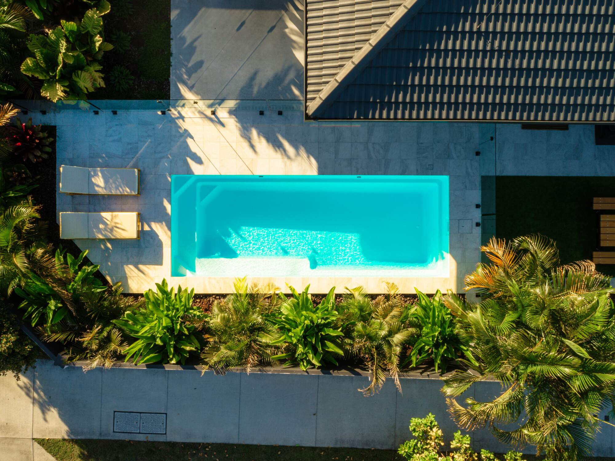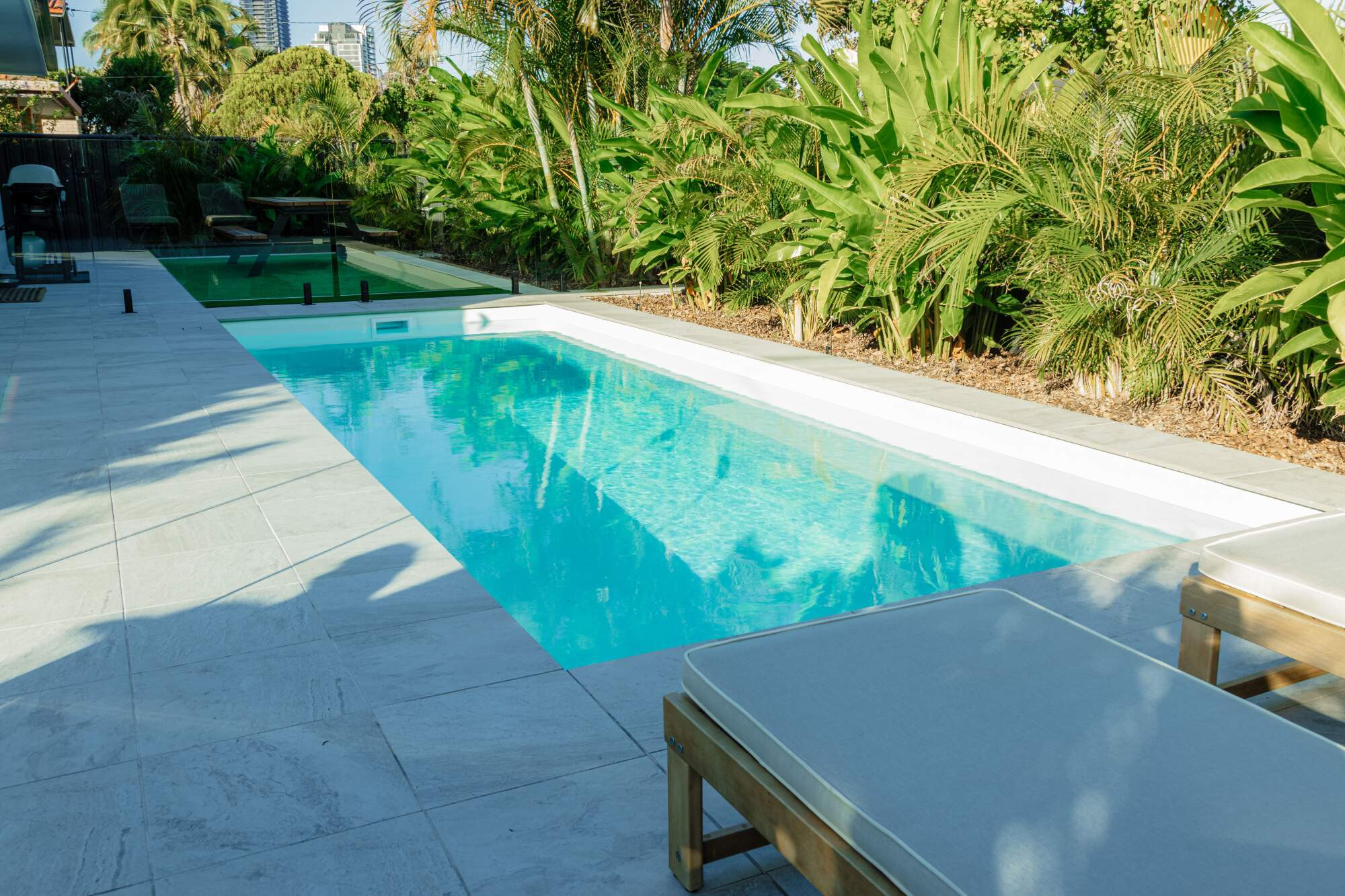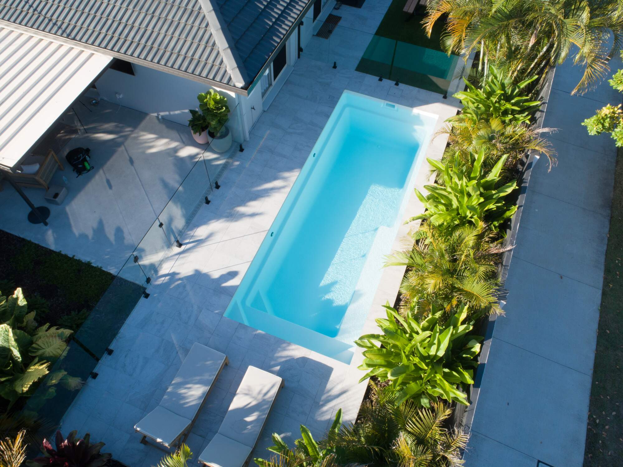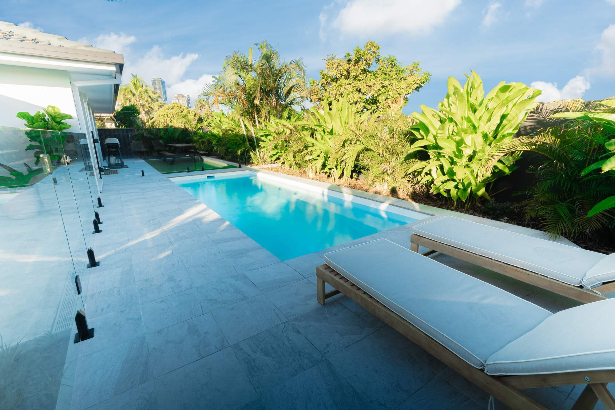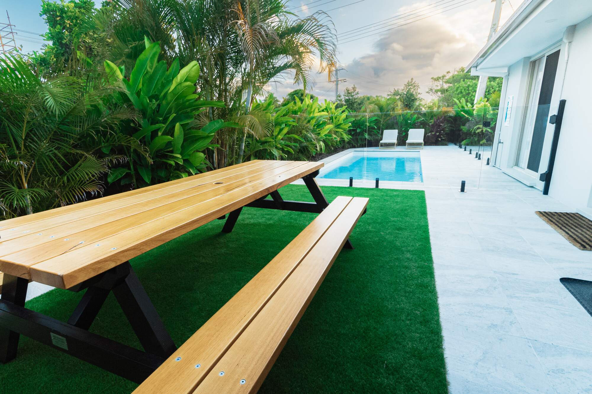 With its crystal clear water and inviting sun beds, this pool welcomes all for effortless and irroestiable relaxation. Artificial grass with bordered tile come together to create a well-rounded universal entertainment area that further compliments and elevates this space.
