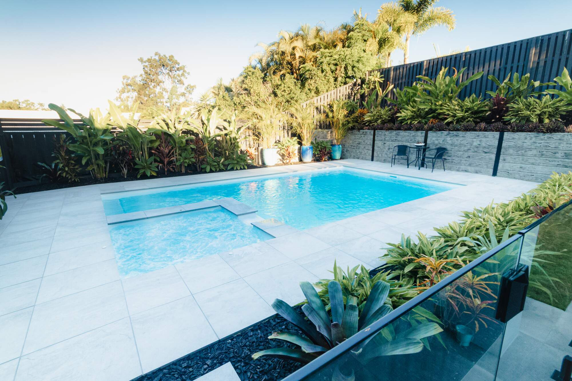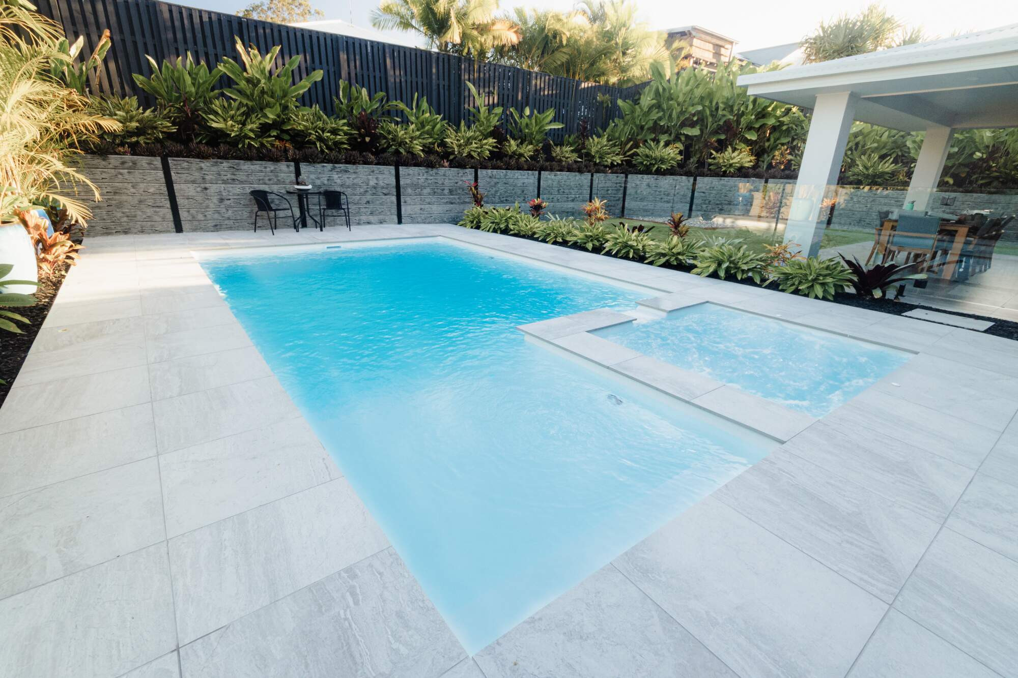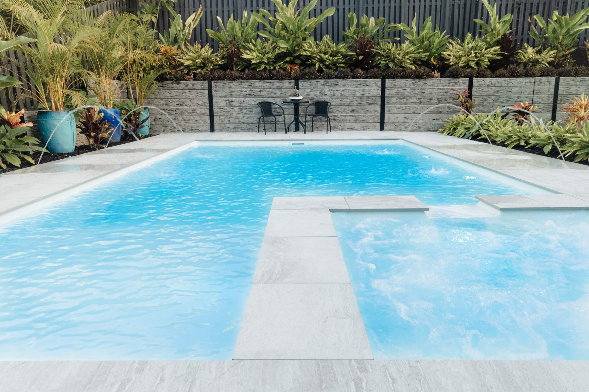 Bordered with Tropical gardens this 7.6 Manhattan pool and spa combo boasts it all with a versatile platform ideal for the kids, a seperate uninterrupted swimming area, and six person spa. Modern light grey pavers combine with the alluring alpine white of this shell, working together to create an inviting and beautiful transparent sky blue water.
