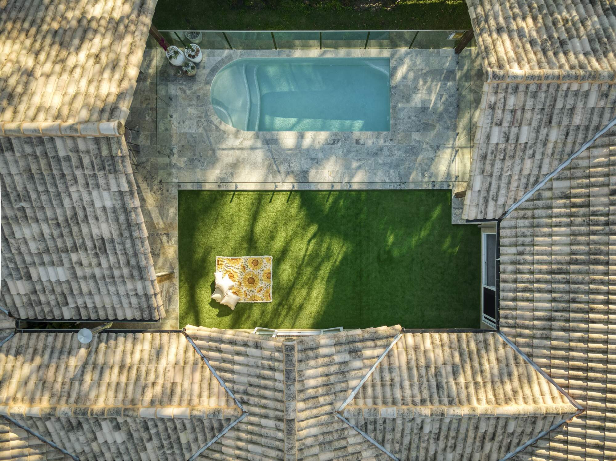 The central courtyard is the heart of this home, with the entire building molded around it. The pool has been purposefully designed and bucks tradition with its unique shape that features a curved entry to compliment the Spanish theme of the home.