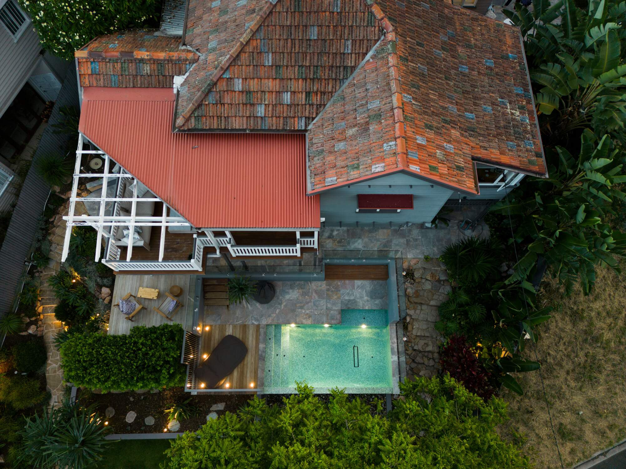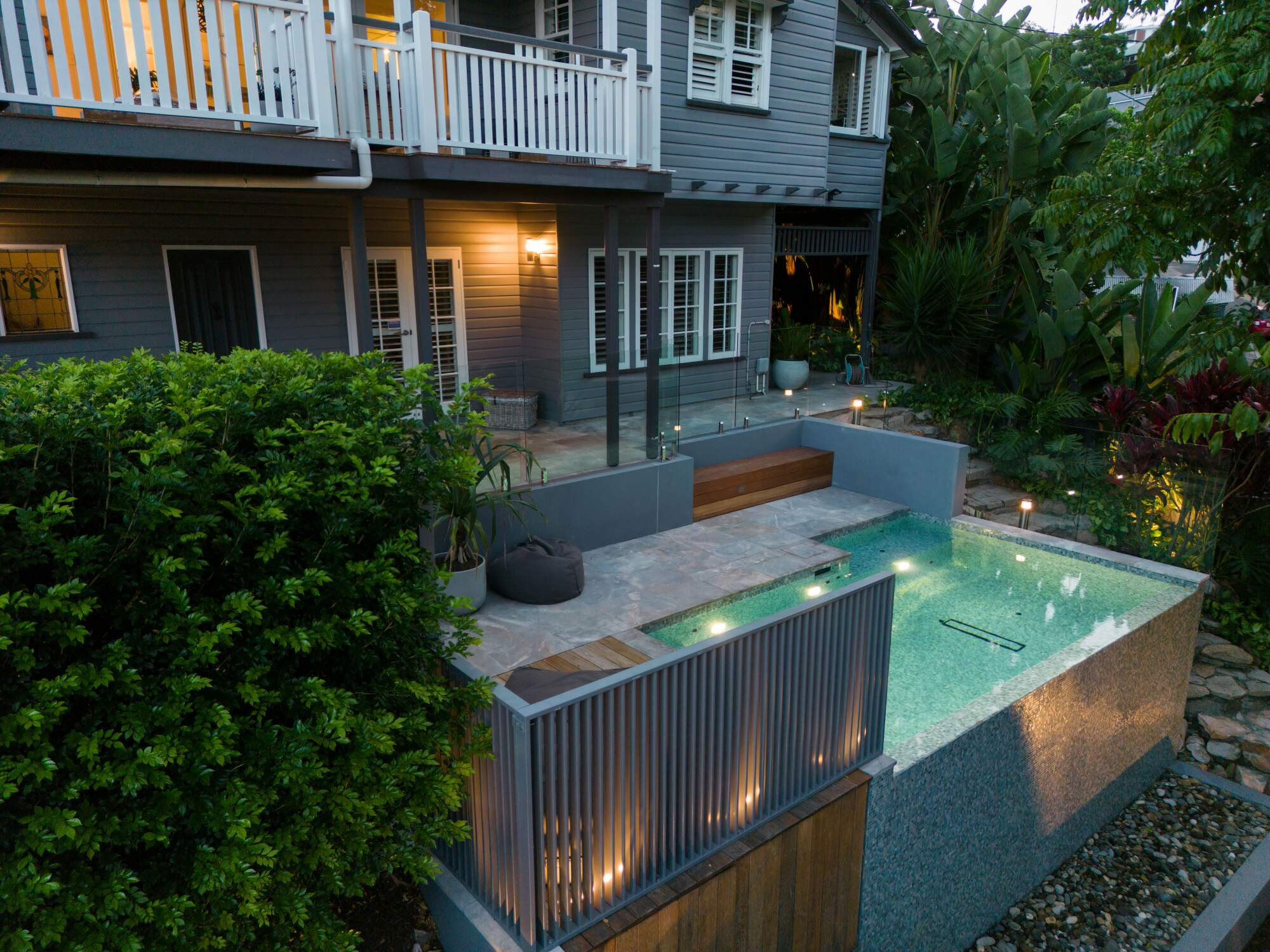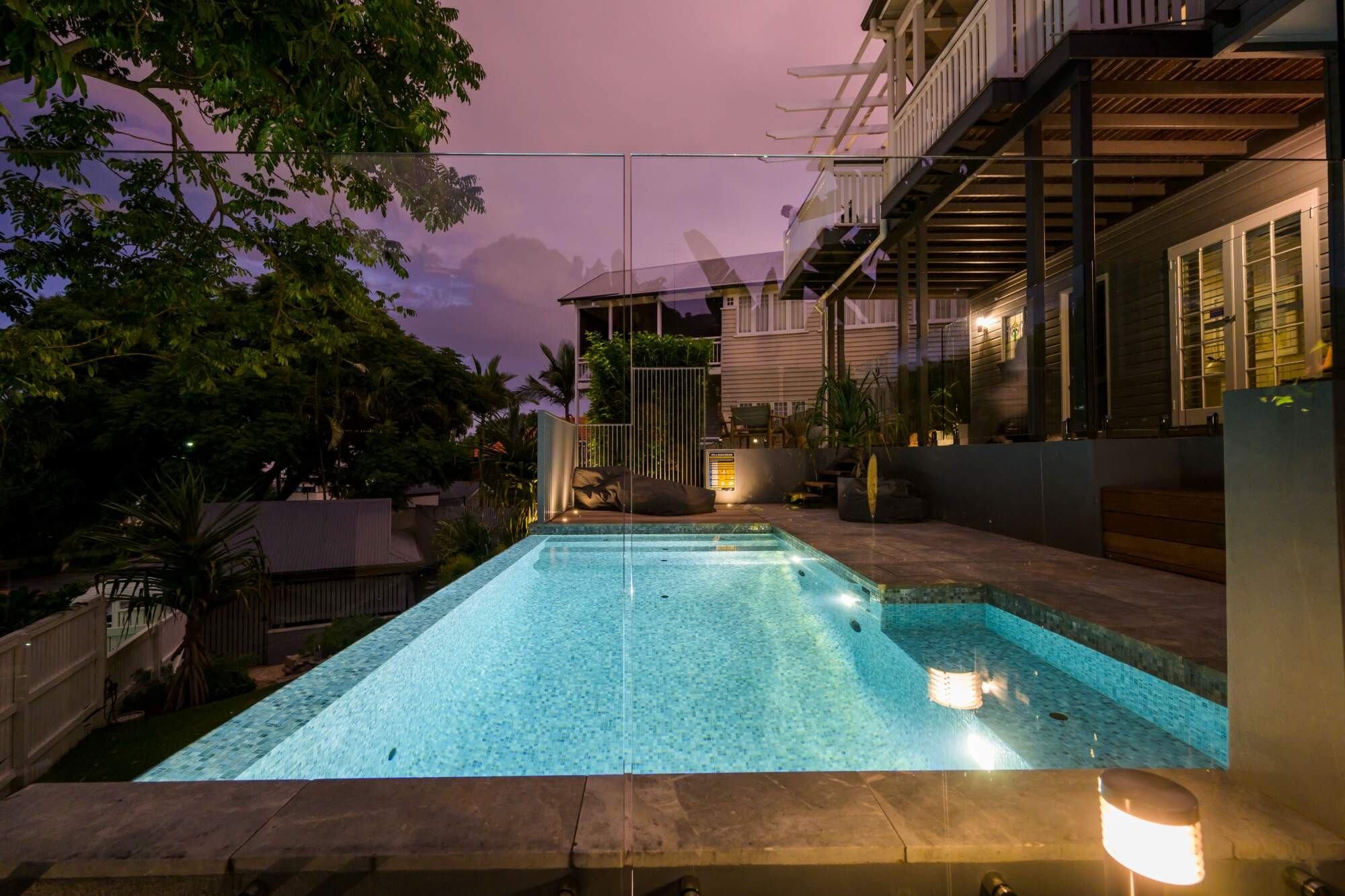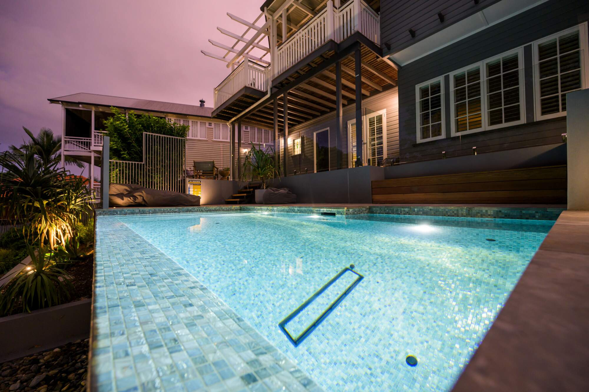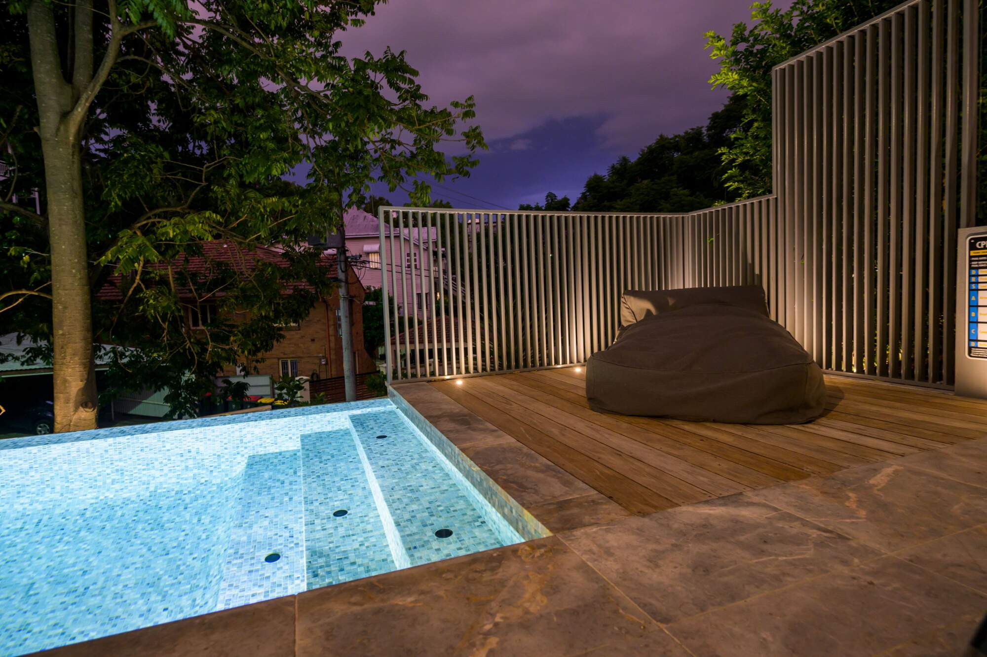 This inner city spectacle is 5.0m x 2.4m to 3.0m with a 5.0 lineal meter spillway edge, fully tiled in an amazing Glass Mosaic Tiles, complete with heating, in-floor cleaning and the latest in smartphone control technology.