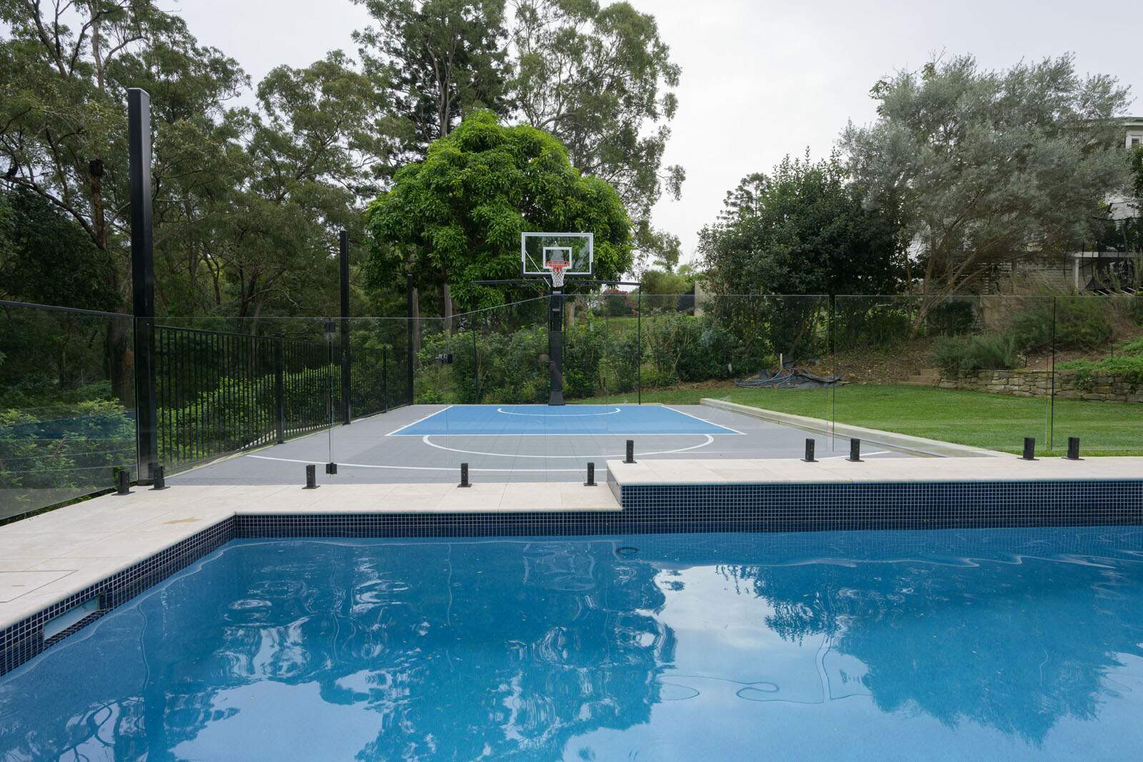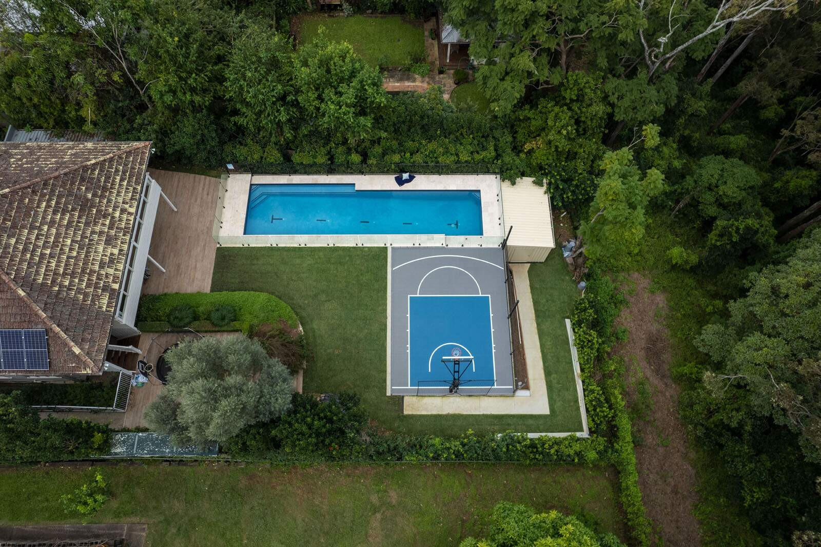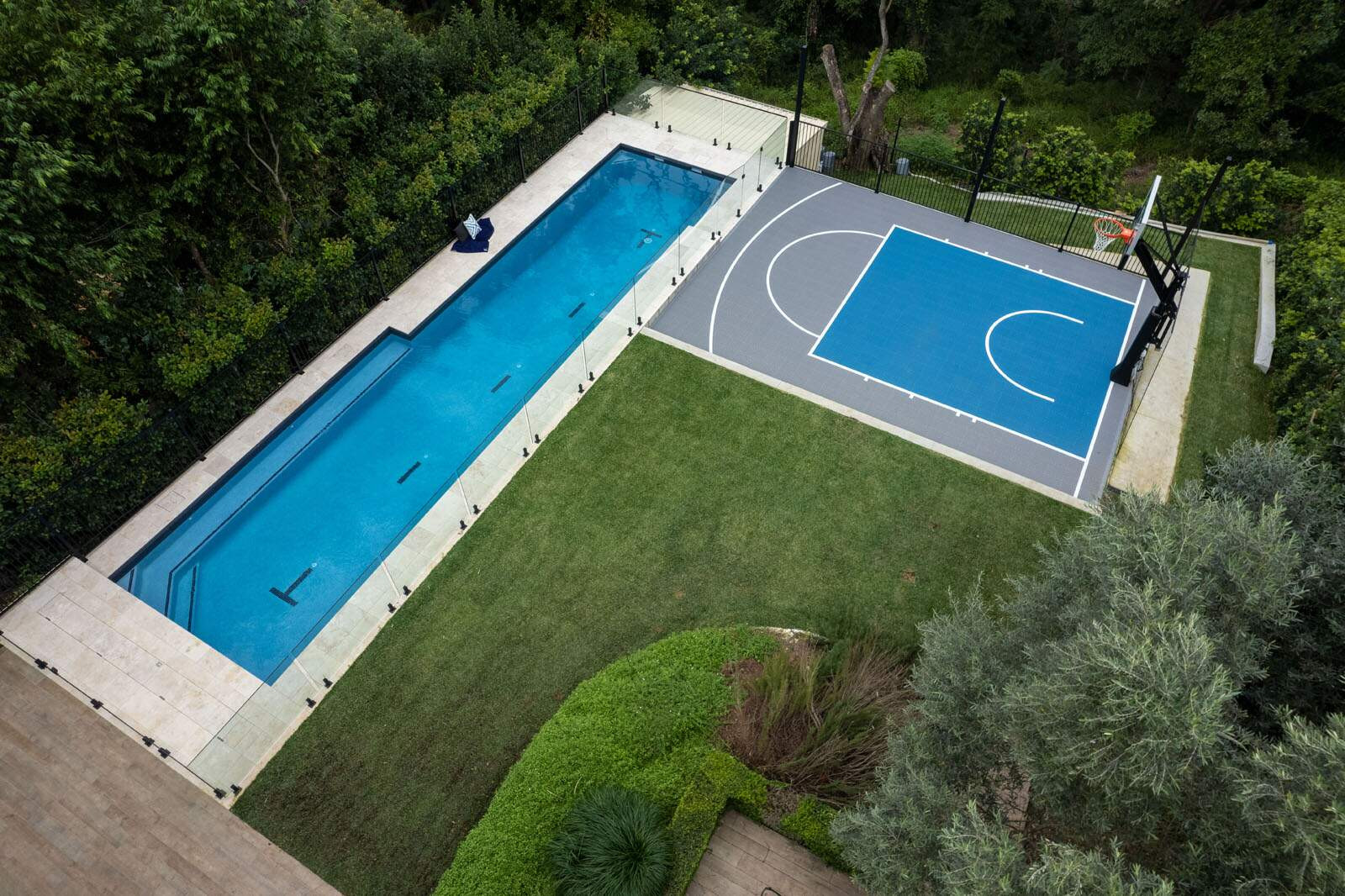 This 15m lap pool utilises what was a dead and unusable space in this large backyard, to create a zone for both exercise and family fun. Linking seemlessly with a half court, the split levels on the pool create a point of difference and draw your eye to the horizon and the forest behind.