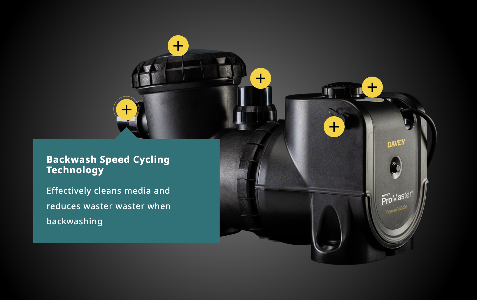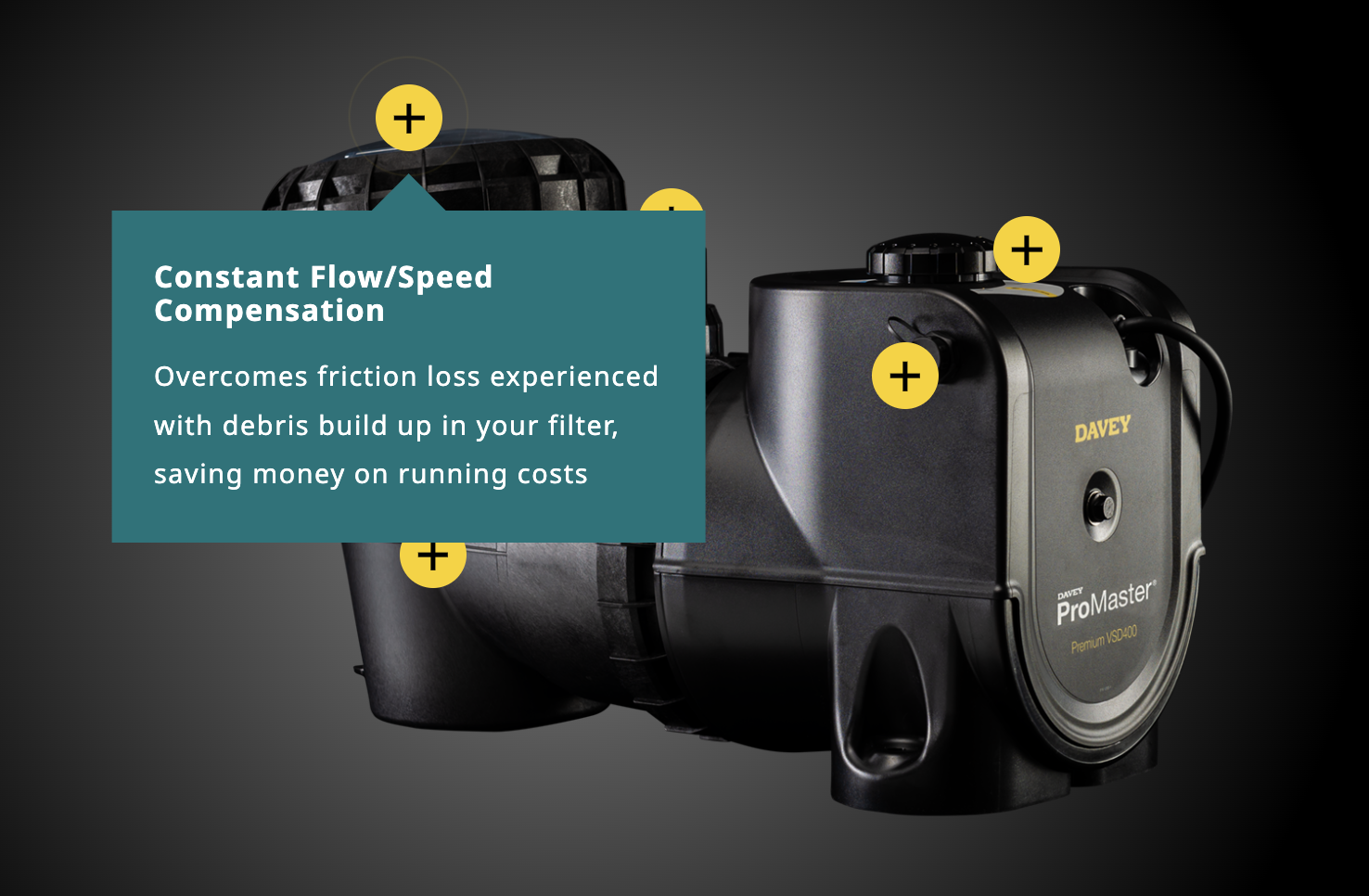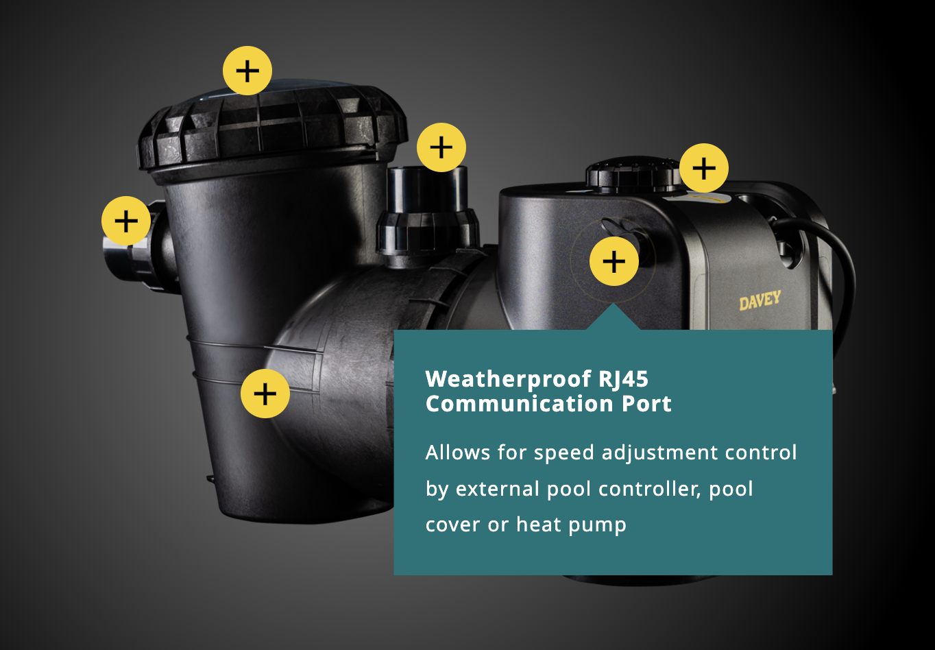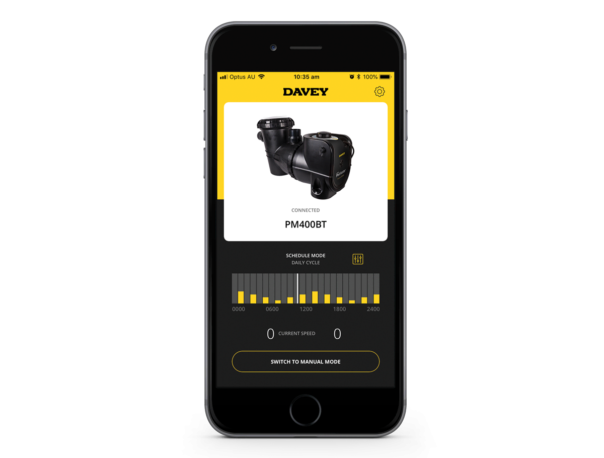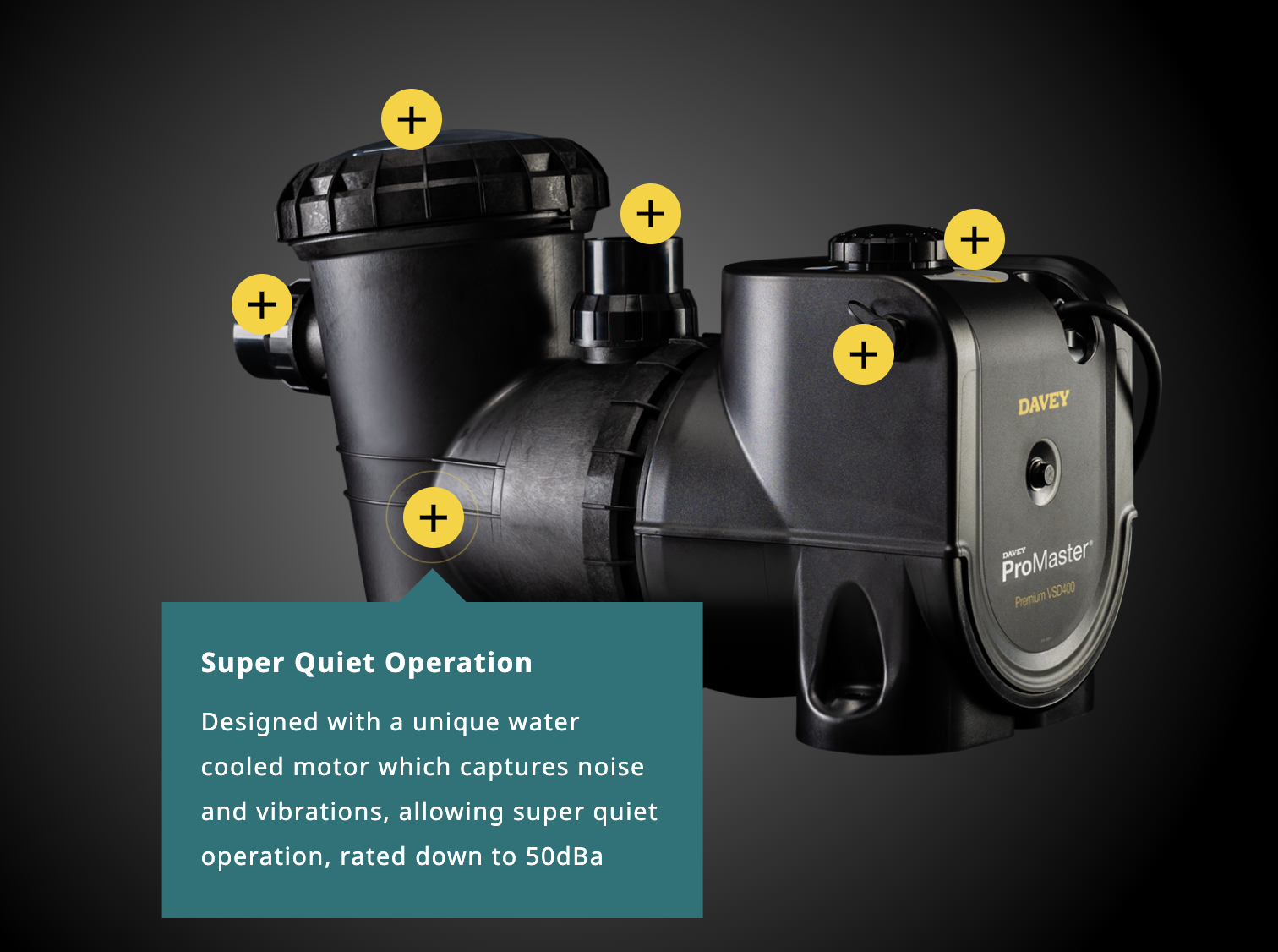 With a MEPS 6-star energy rating, iOS and Android app control via Bluetooth®, the efficient and super-quiet water-cooled Davey ProMaster PM400BT with variable speed control is suited to a wide range of applications. It's the perfect solution for pool filtration, solar heating, gas and heat pump heating, as well as suction and in-floor cleaning systems. Designed and Made in Australia for superior performance in tough environments.