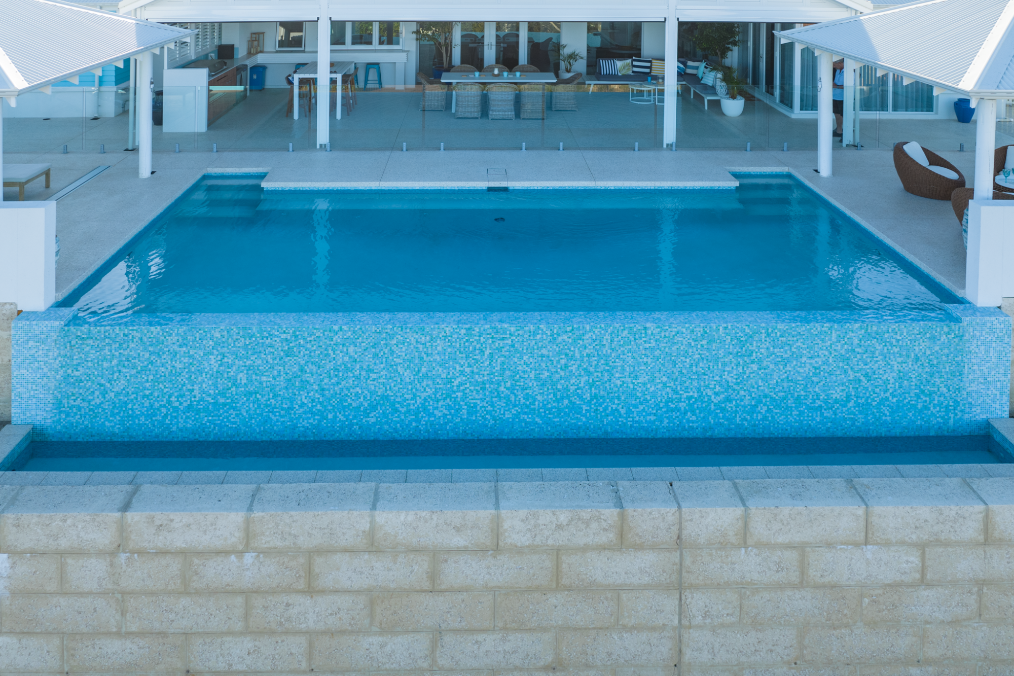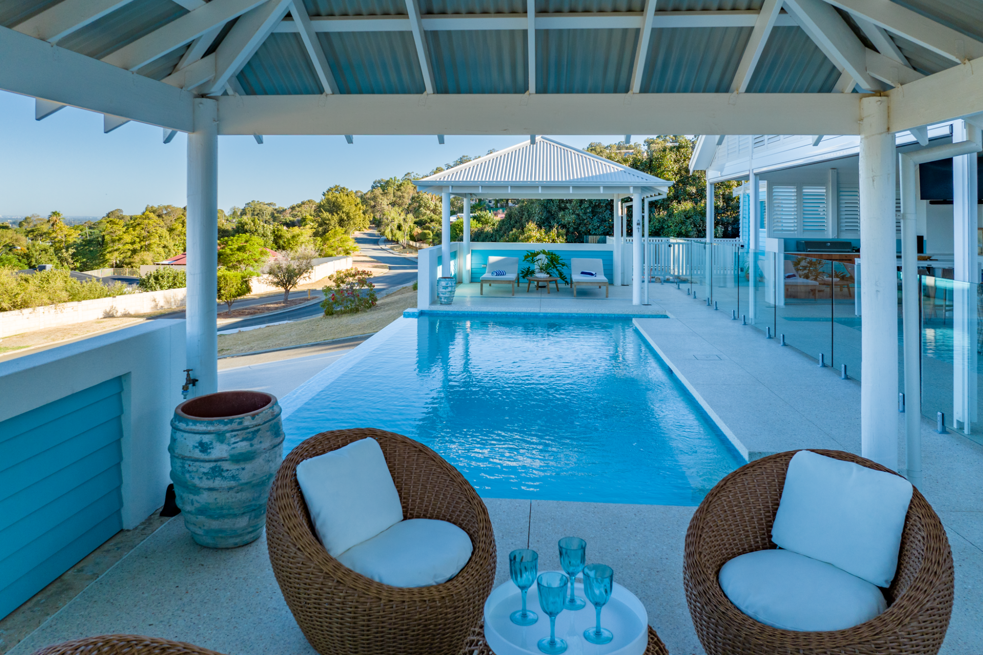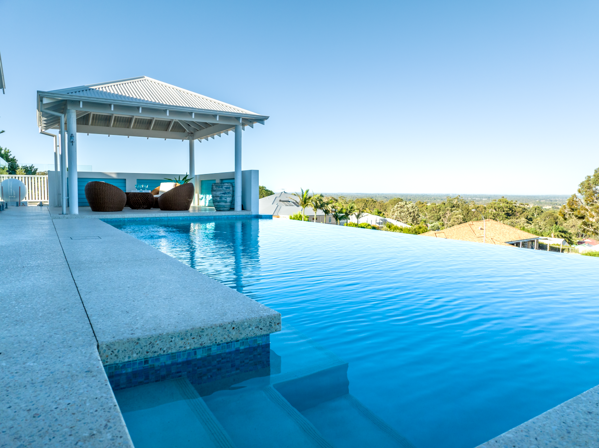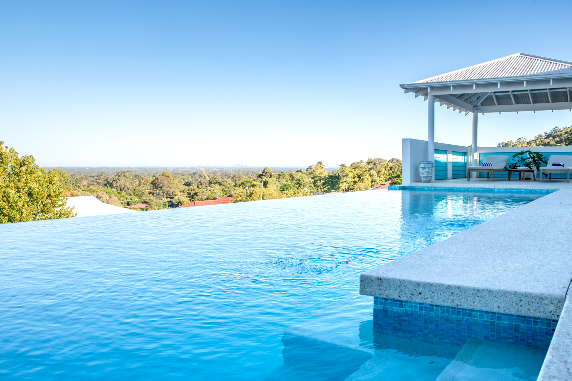 The clients absolutely love entertaining from the alfresco area and cabanas of this incredible, breathtaking pool. Sitting back and admiring the view over the hills and Perth city from their own impeccably designed and constructed masterpiece of a pool is exactly how they imagined it. The view from the road and driveway as you enter is just as impressive as being in the pool.