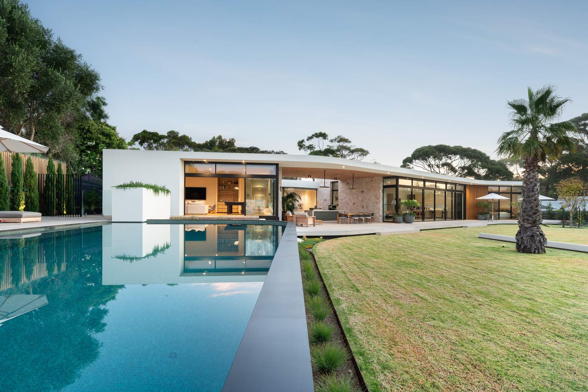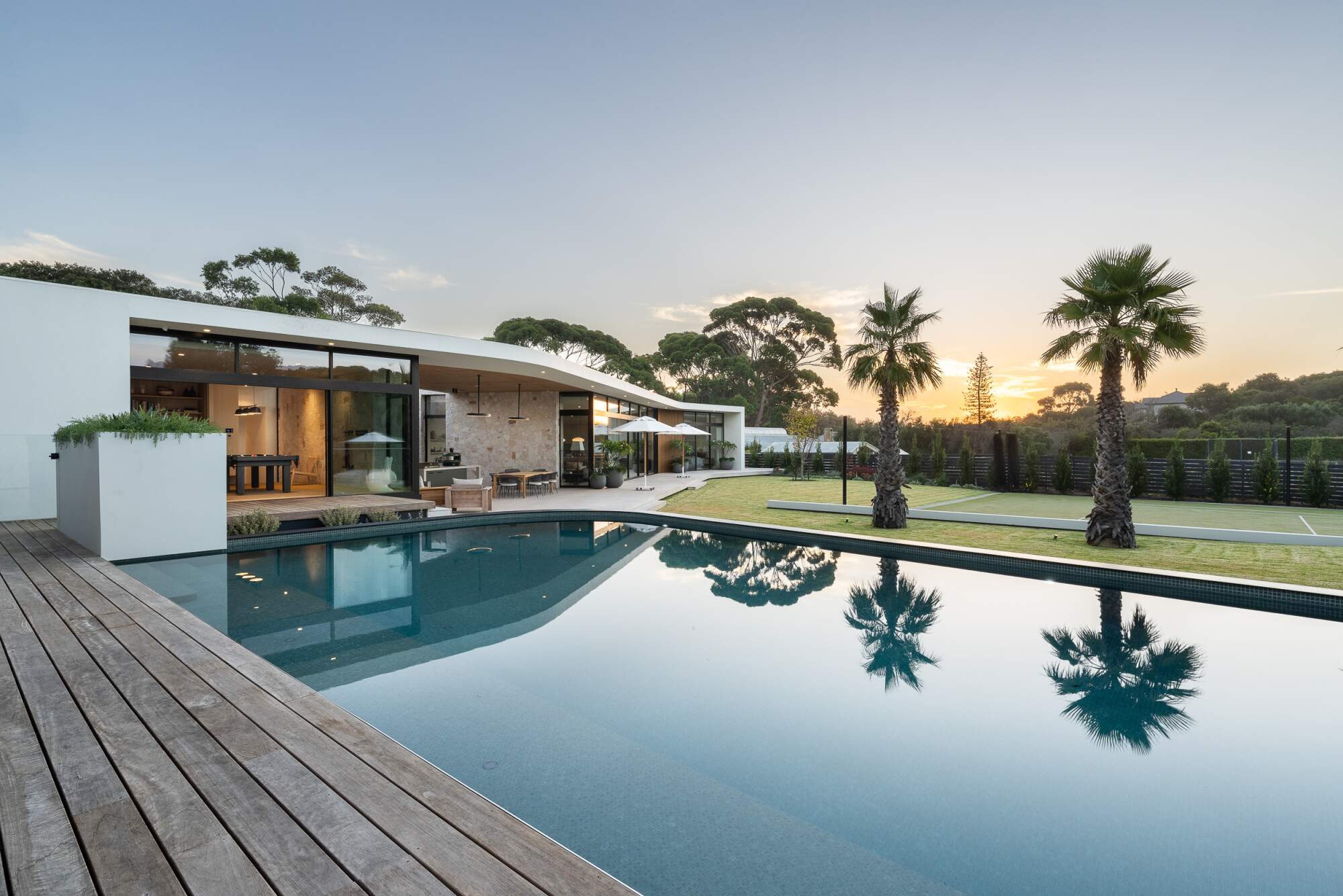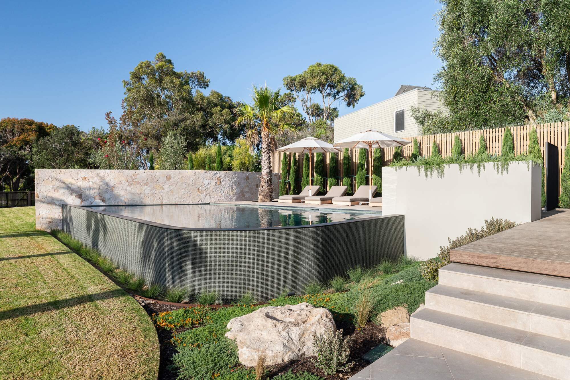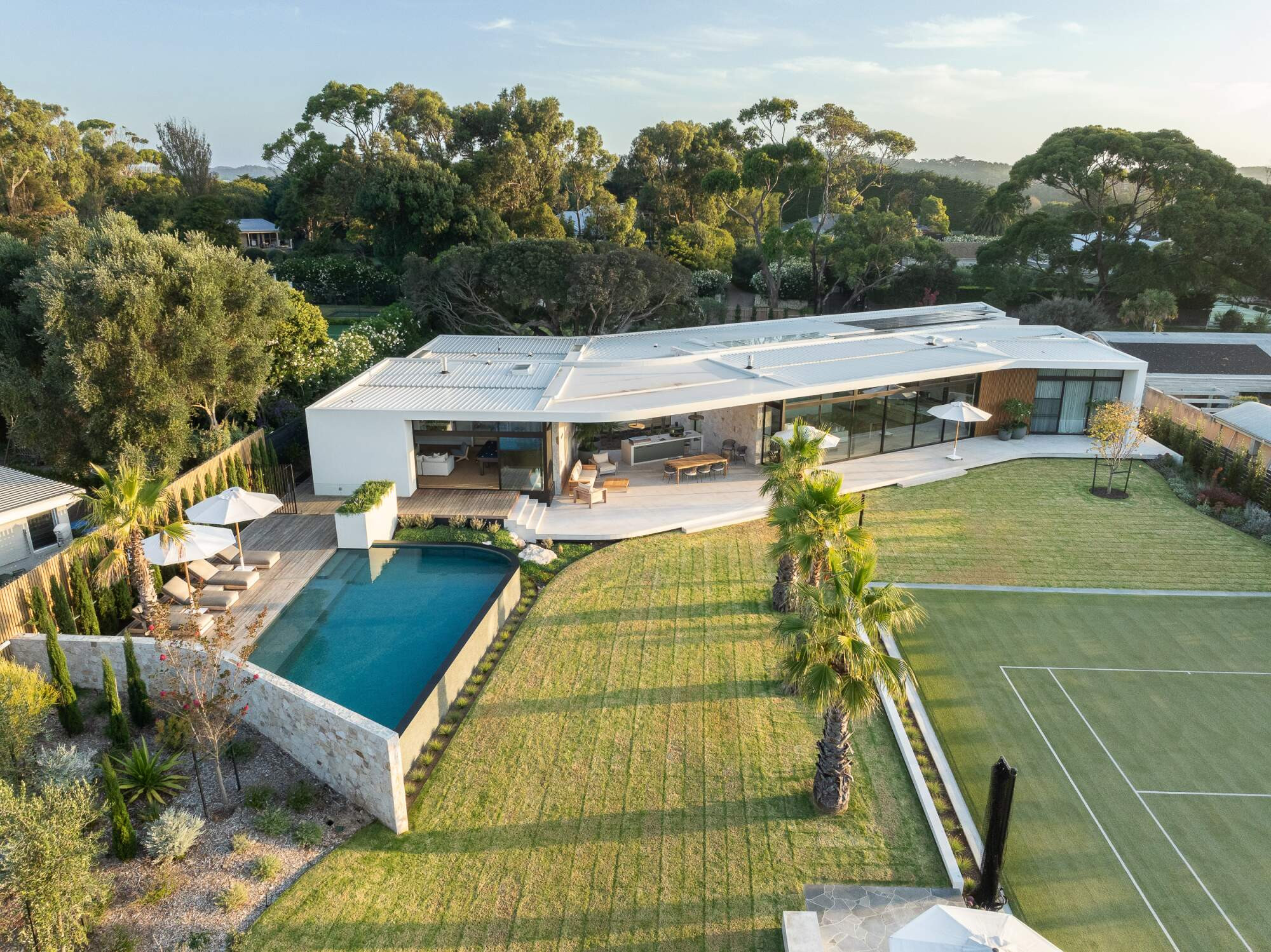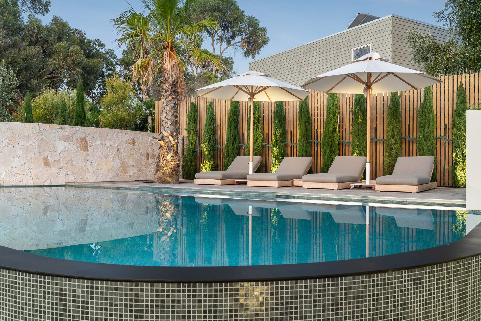 A Palm Springs inspired swimming pool that is nothing short of the wow factor. Surrounded by beautiful mature palm trees and the natural sounds of the Mornington peninsula.