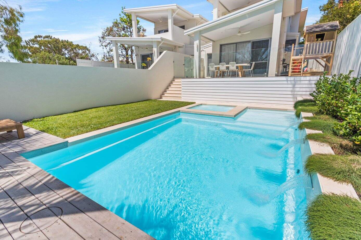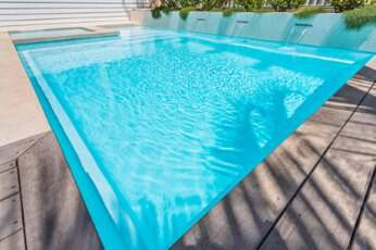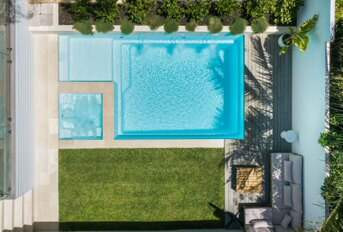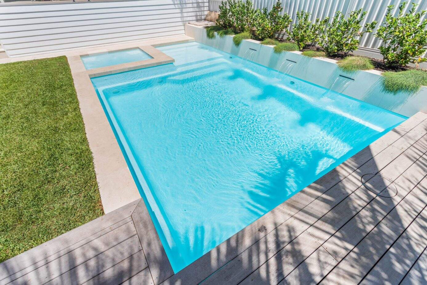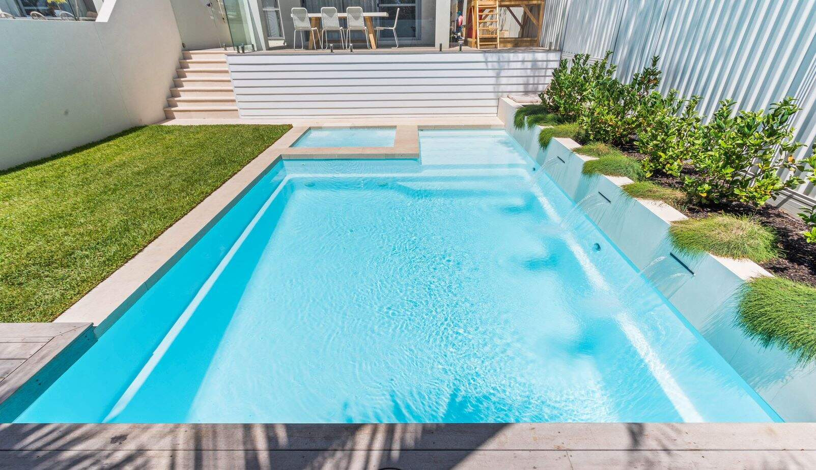 This residence's white aesthetic was carried through to the pool, with the Alpine White 9m Manhattan combination, embracing the latest in exterior design trends. The minimalist design was executed using the highest quality finishes including glass, timber and an extensive three blade water wall with fauna.This popular configuration offers loads of swim space, and our clients love to unwind in the spa while watching the kids play.