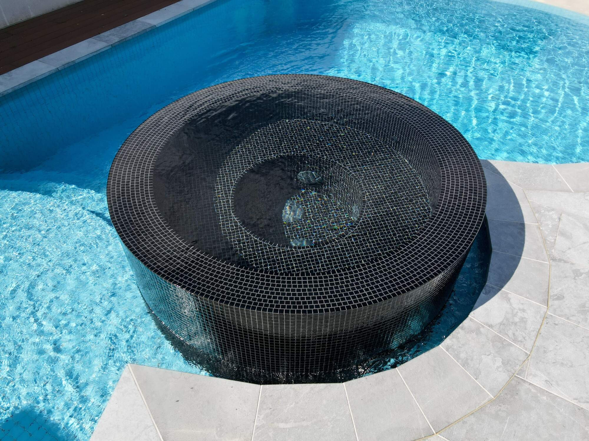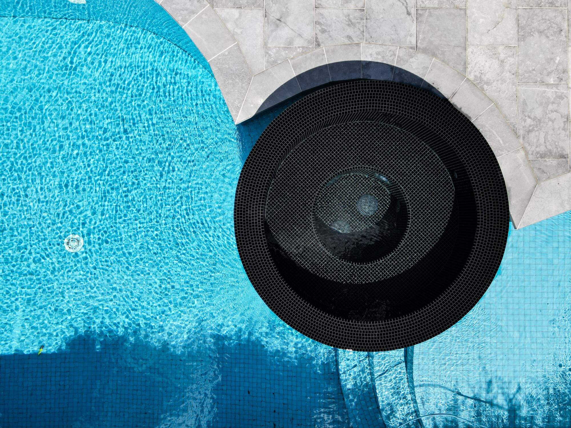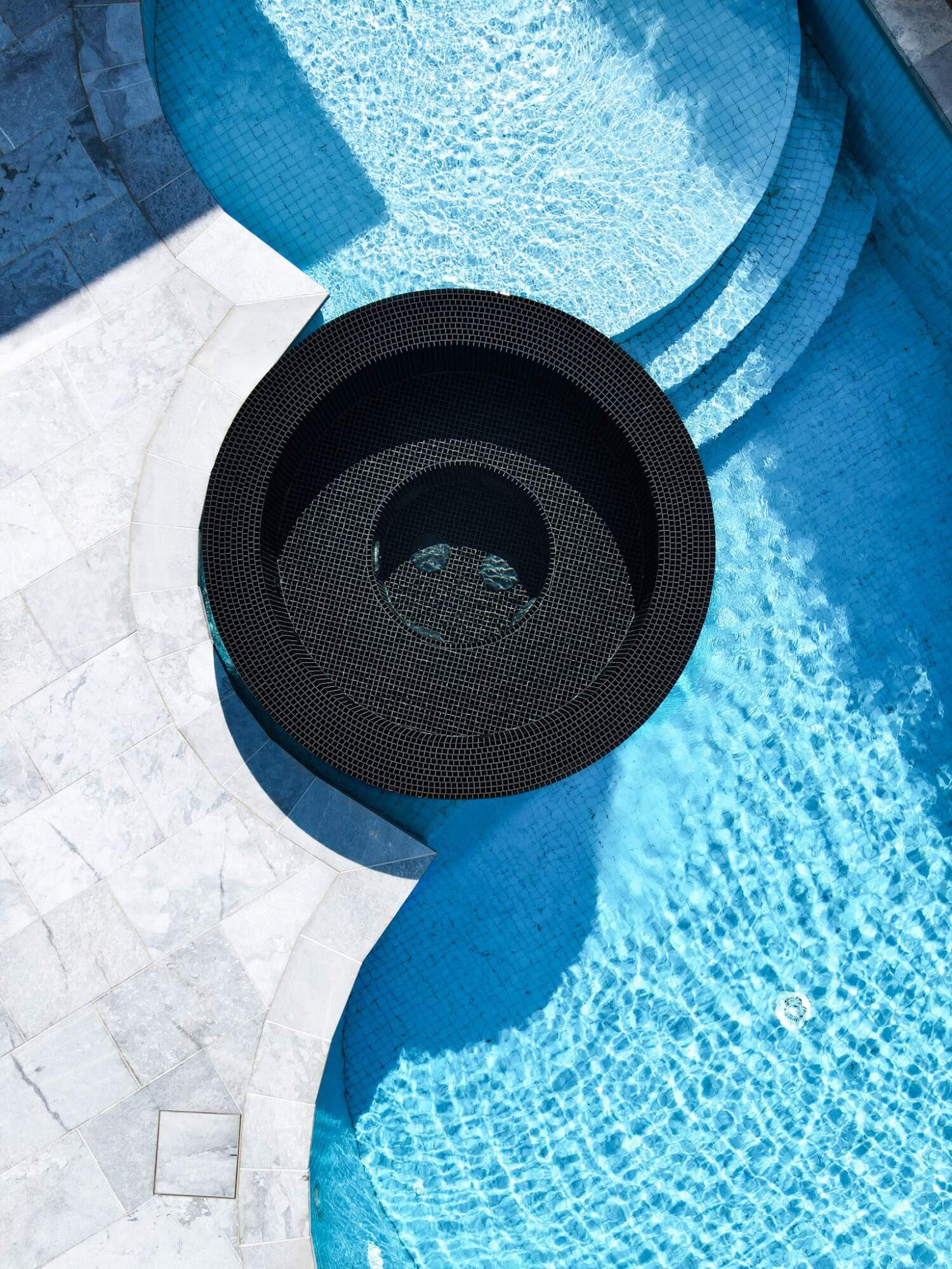 From the infinity edge to the shallow areas, this layout differs from the typical pool, offering a dynamic and organic shape. With the incorporation of a round spa, reflecting the curves of the pool, this design represents a bold departure from convention, showcasing our dedication to innovation, creativity, and attention to detail. Furthermore, the tile contrast creates a striking visual focal point, accentuating the design and enhancing the overall aesthetic appeal of the space.