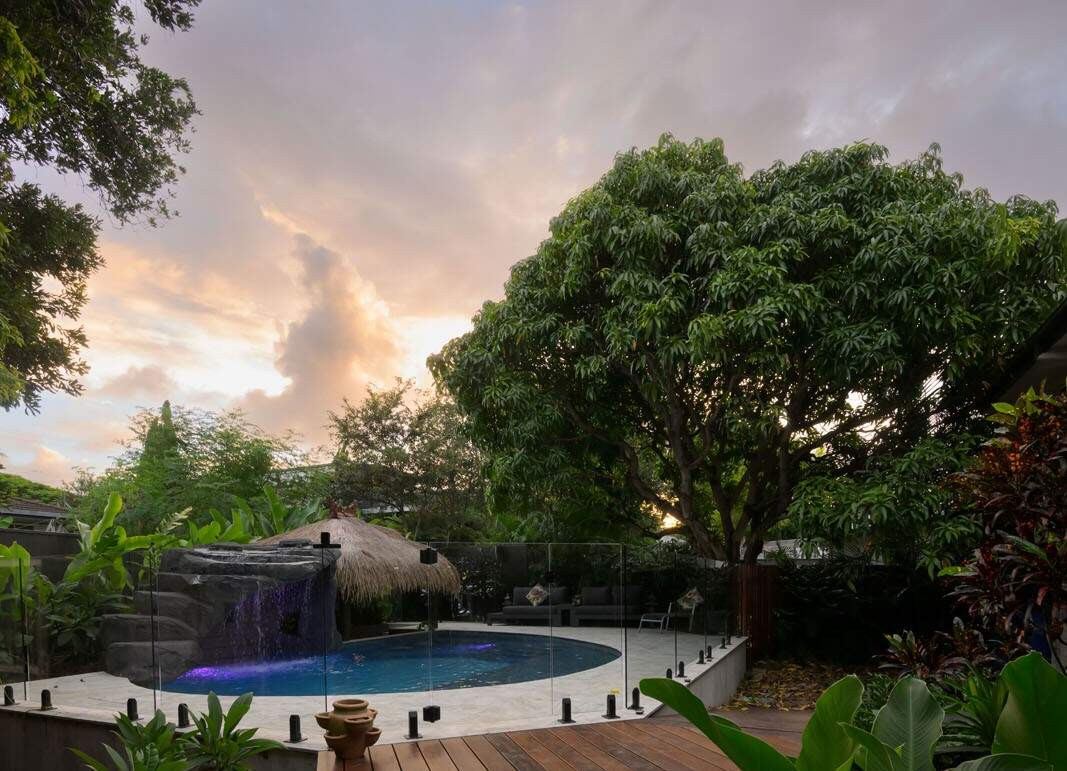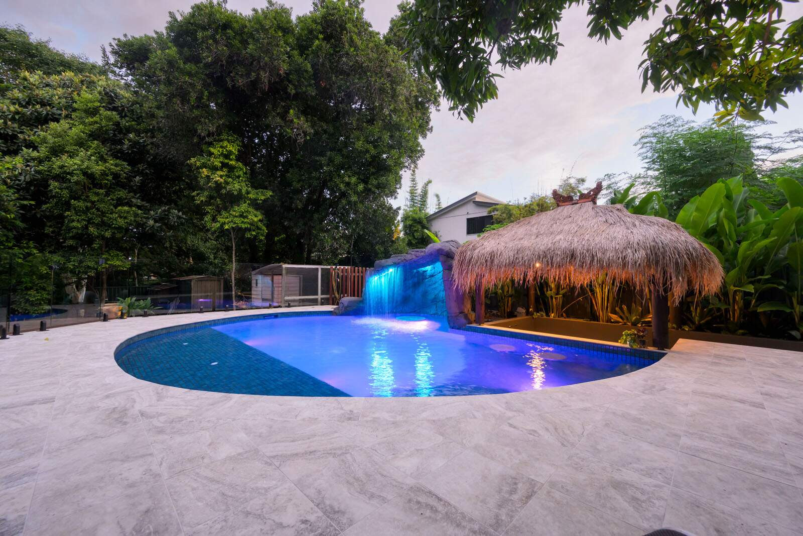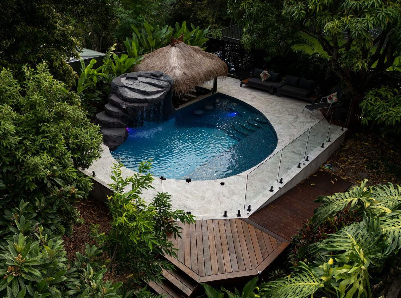 This freeform pool is the very definition of a hidden oasis. Complete with a rock grotto, cascading waterfall and a swim-up bar, this space is the perfect place to unwind after a busy week and to entertain family and friends. A resort worthy pool right at their back door.